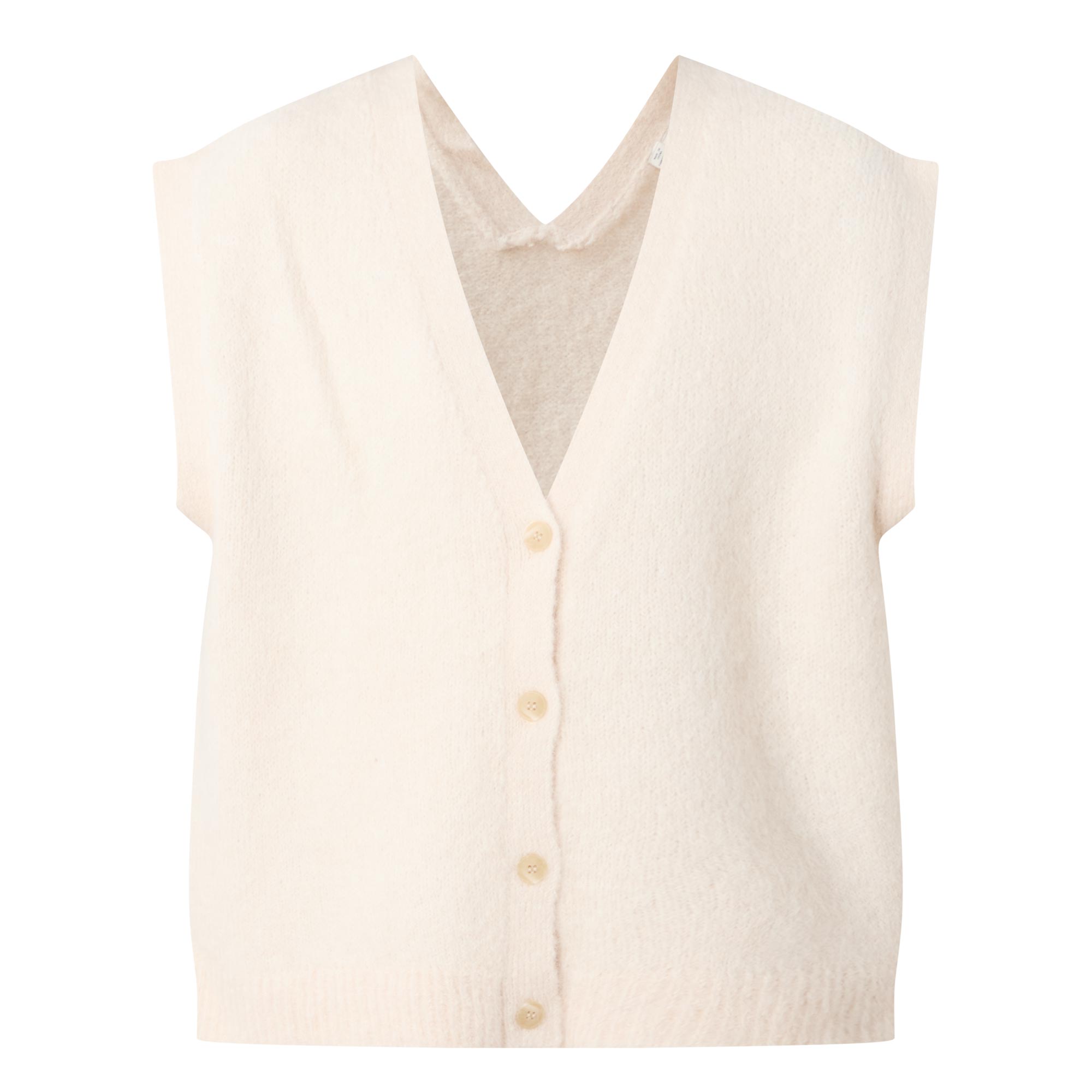 - V-neckline, V-shape back, short cap sleeves, button fastening, ribbed trims, vest design, soft knitted finish