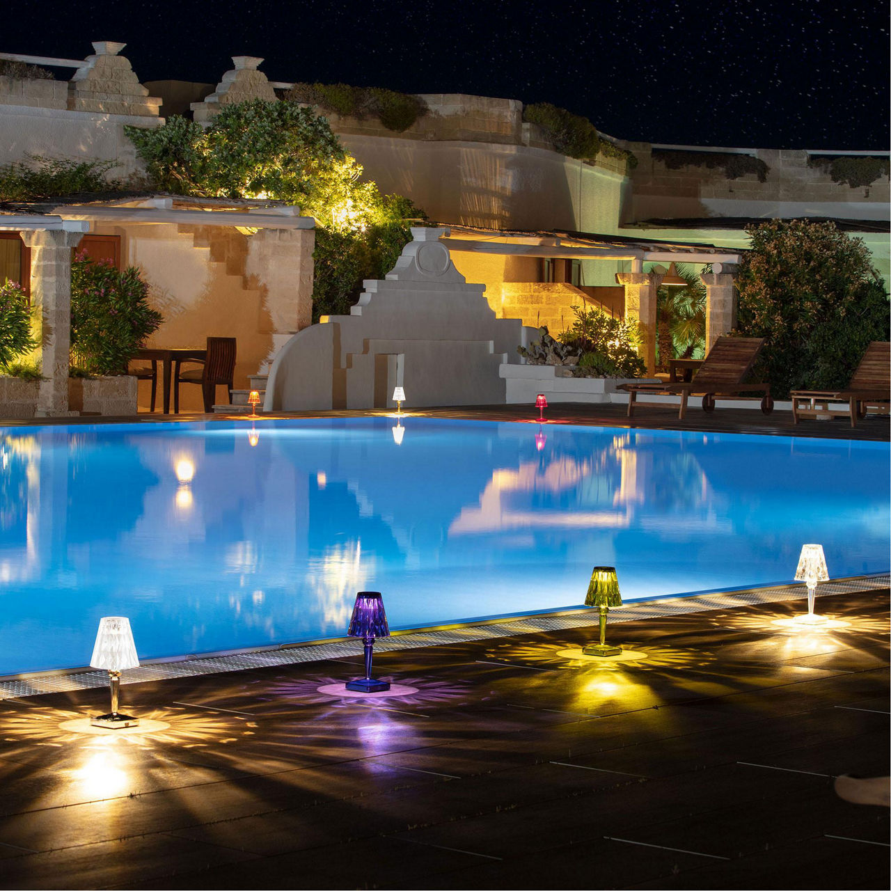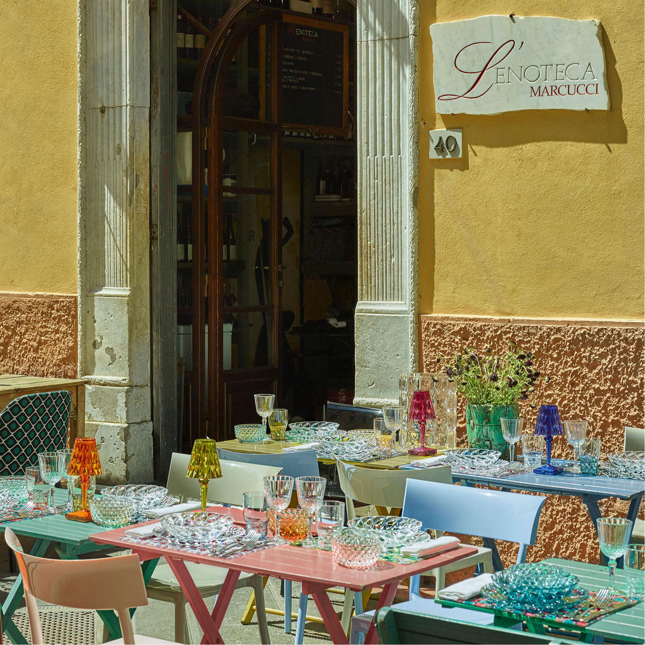 Battery is a compact table lamp innovatively characterised by the fact that it is 100% rechargeable thanks to a simple electric plug, with up to eight hours of battery life. This makes it easy to move, ideal for temporary contract set-ups, for use in cafés or in open air restaurants.