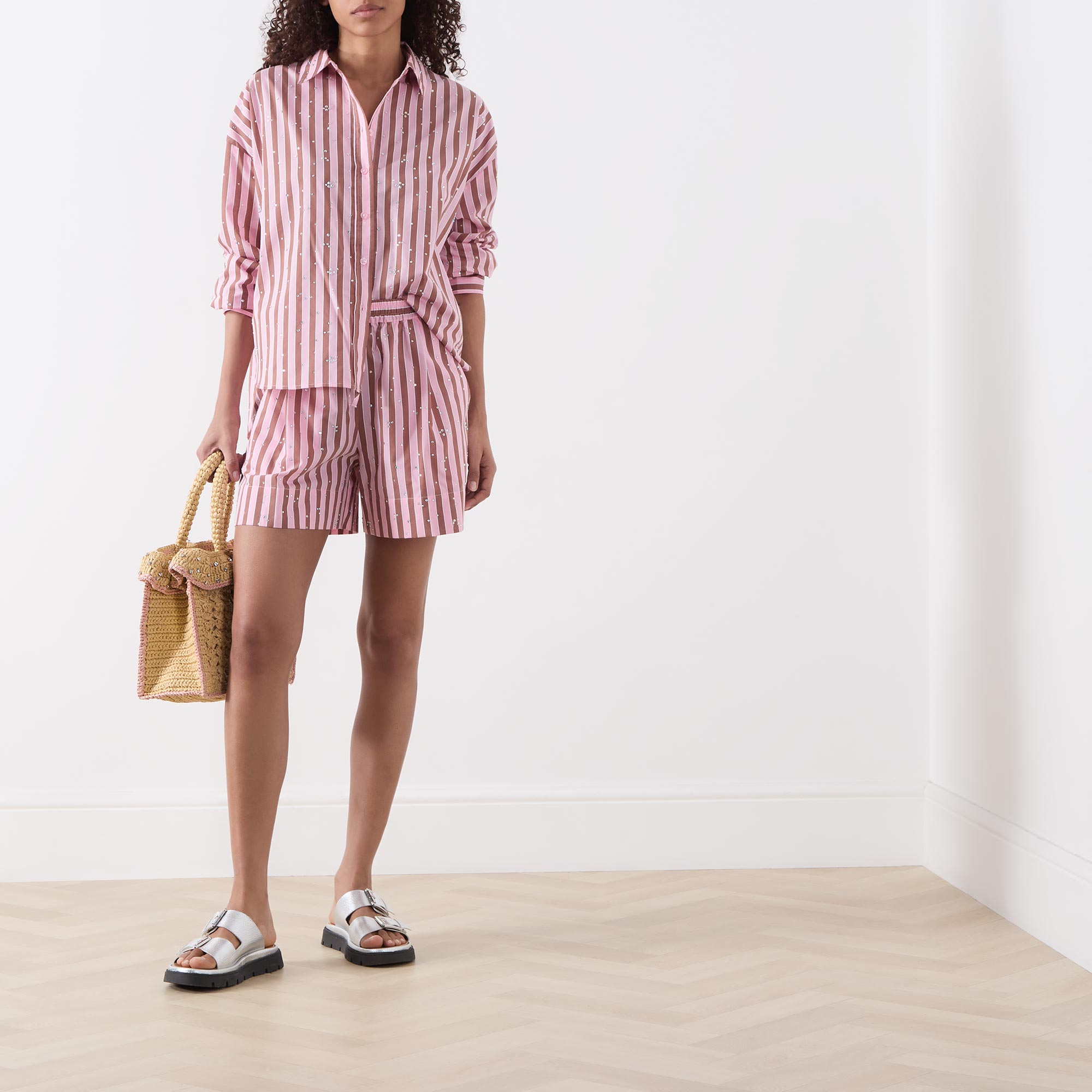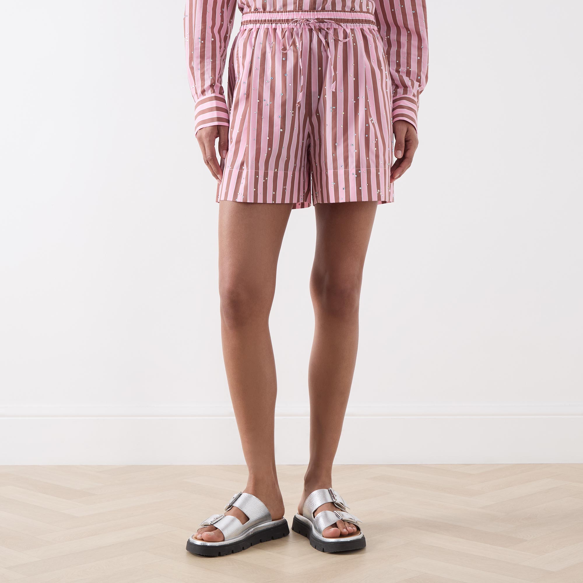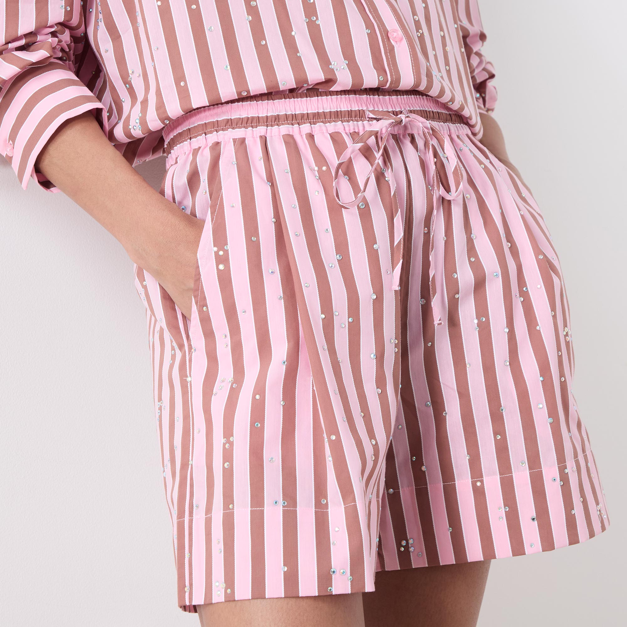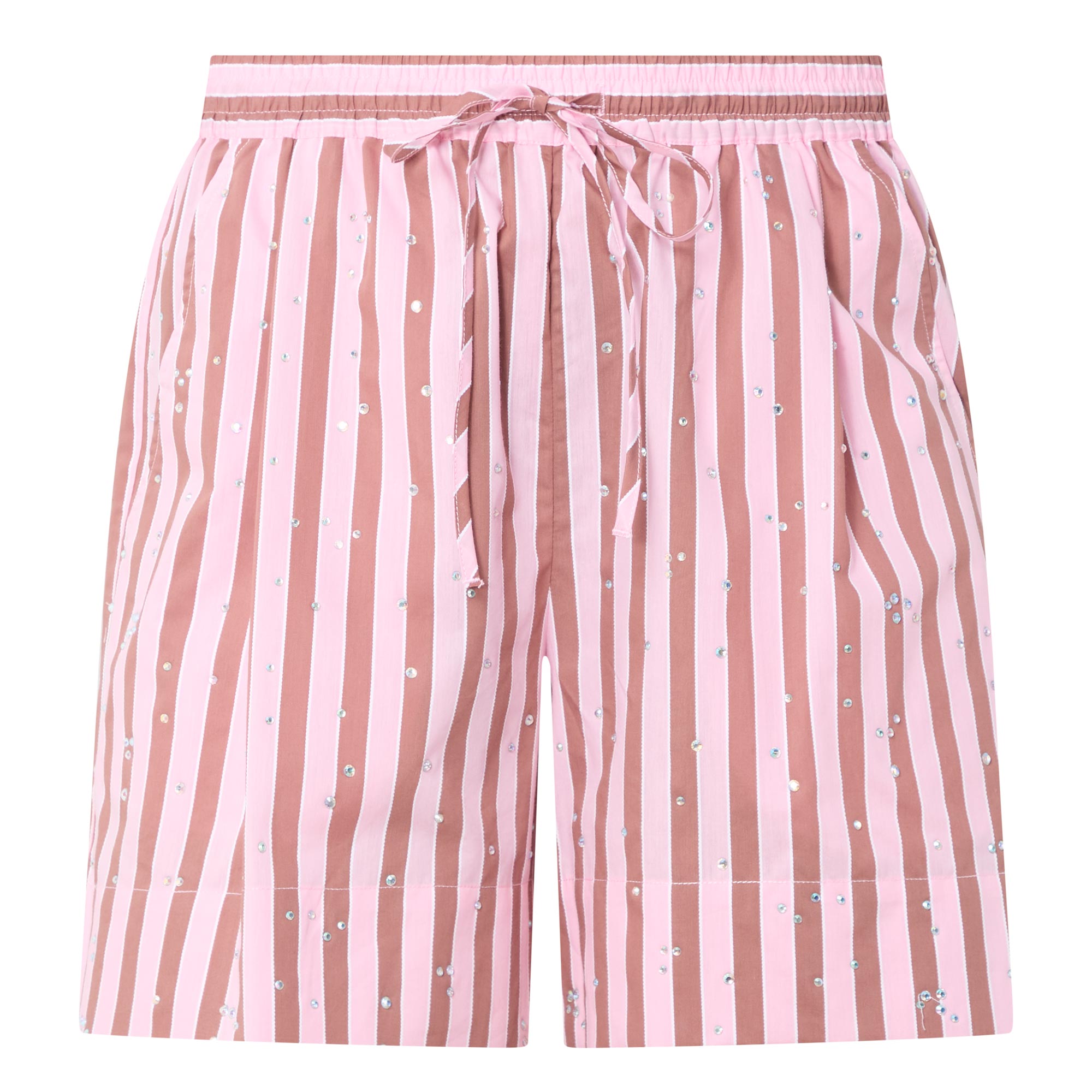 - High-rise, straight-leg, above-the-knee length, elasticated waistband, adjustable drawstring fastening, inverted pleat detailing, two slanted pockets, clean hems, striped pattern, embellished detailing throughout, lightweight fabric