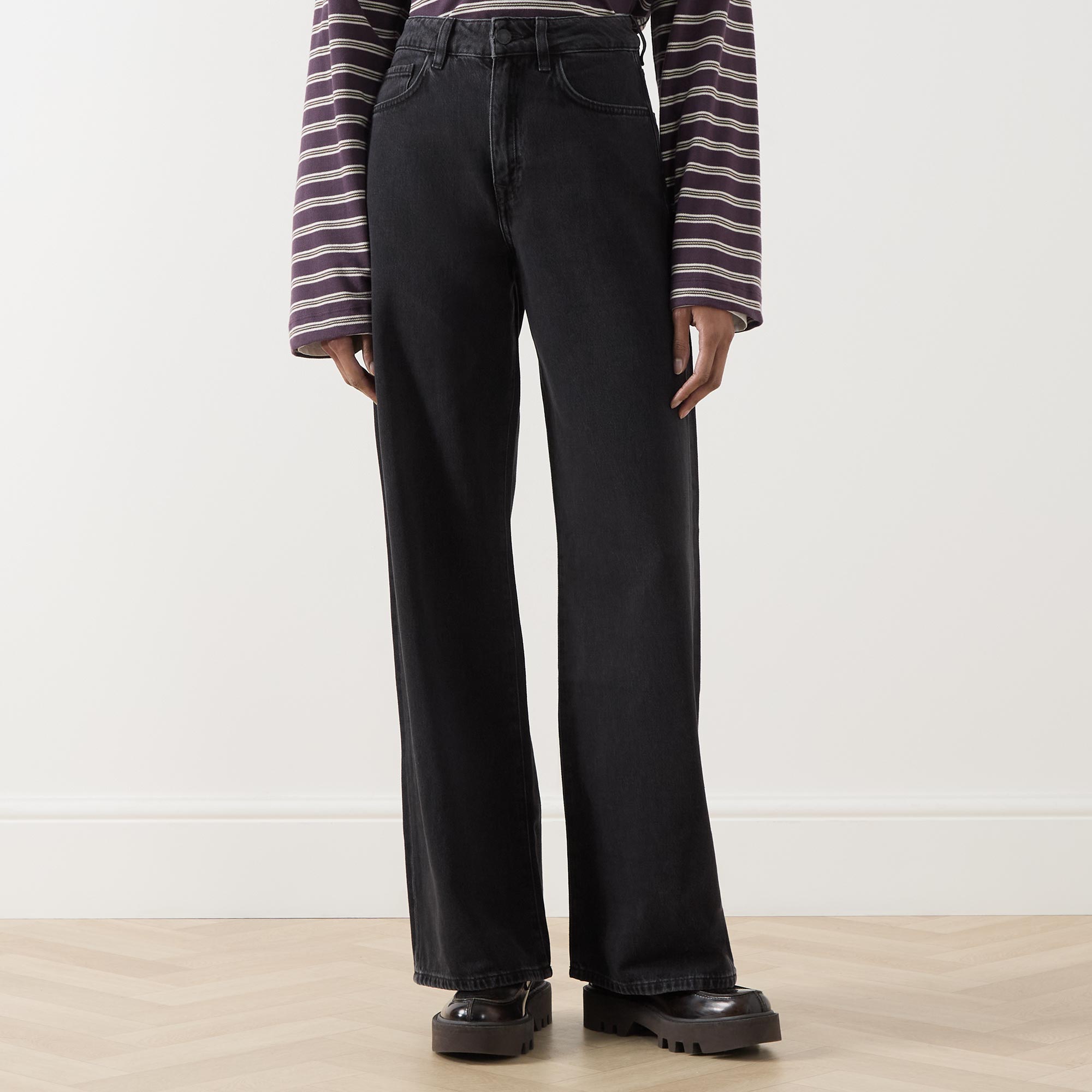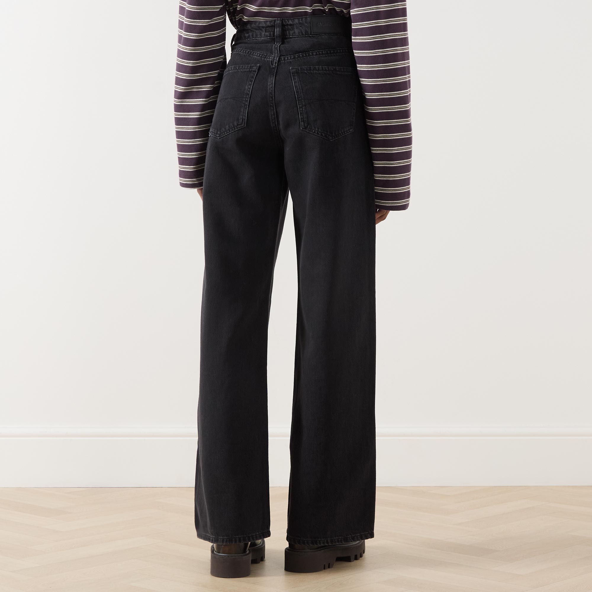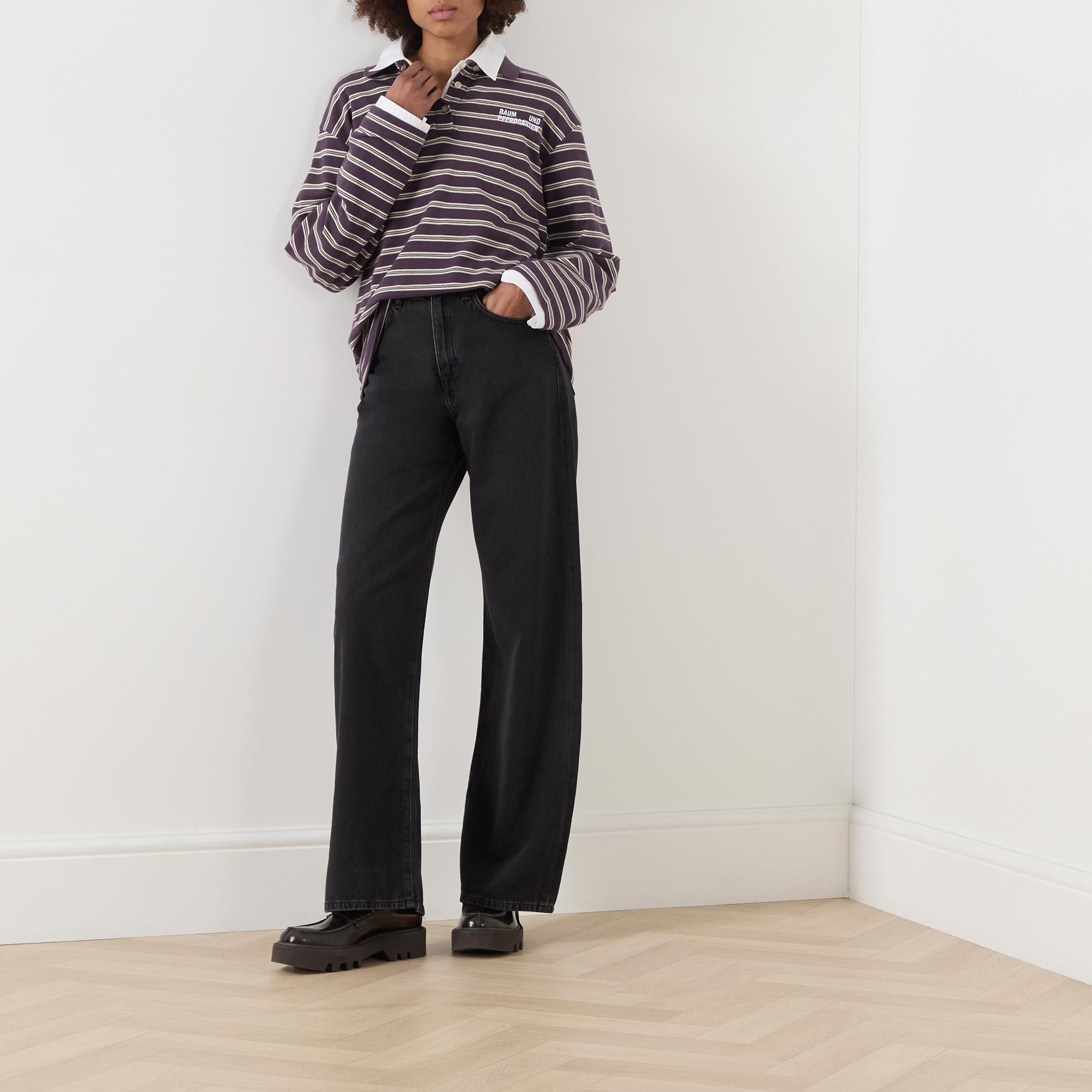 - Zip-fly and button fastening, belt loops, five-pocket design, tonal stitching, high-rise, wide-cut leg, smooth denim finish