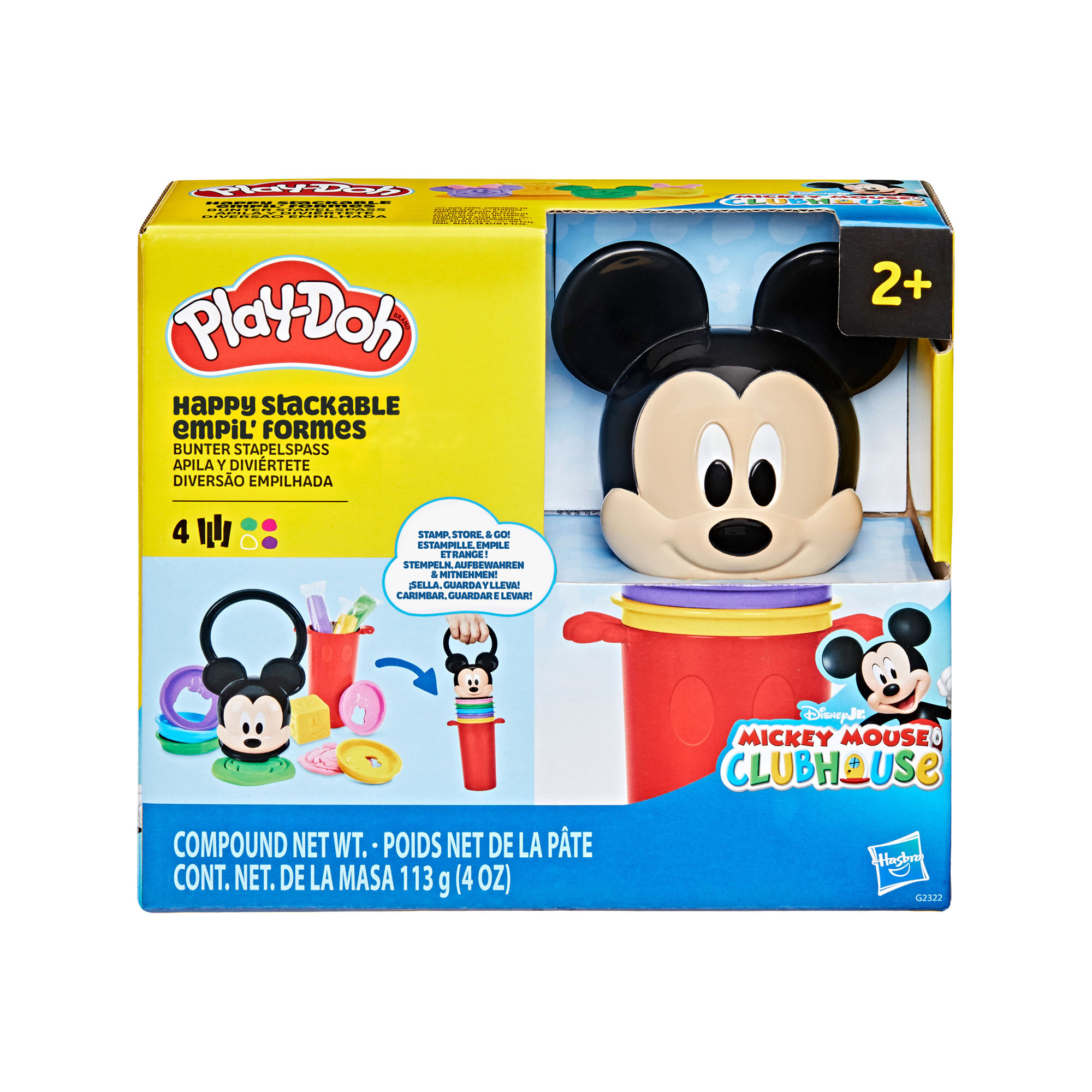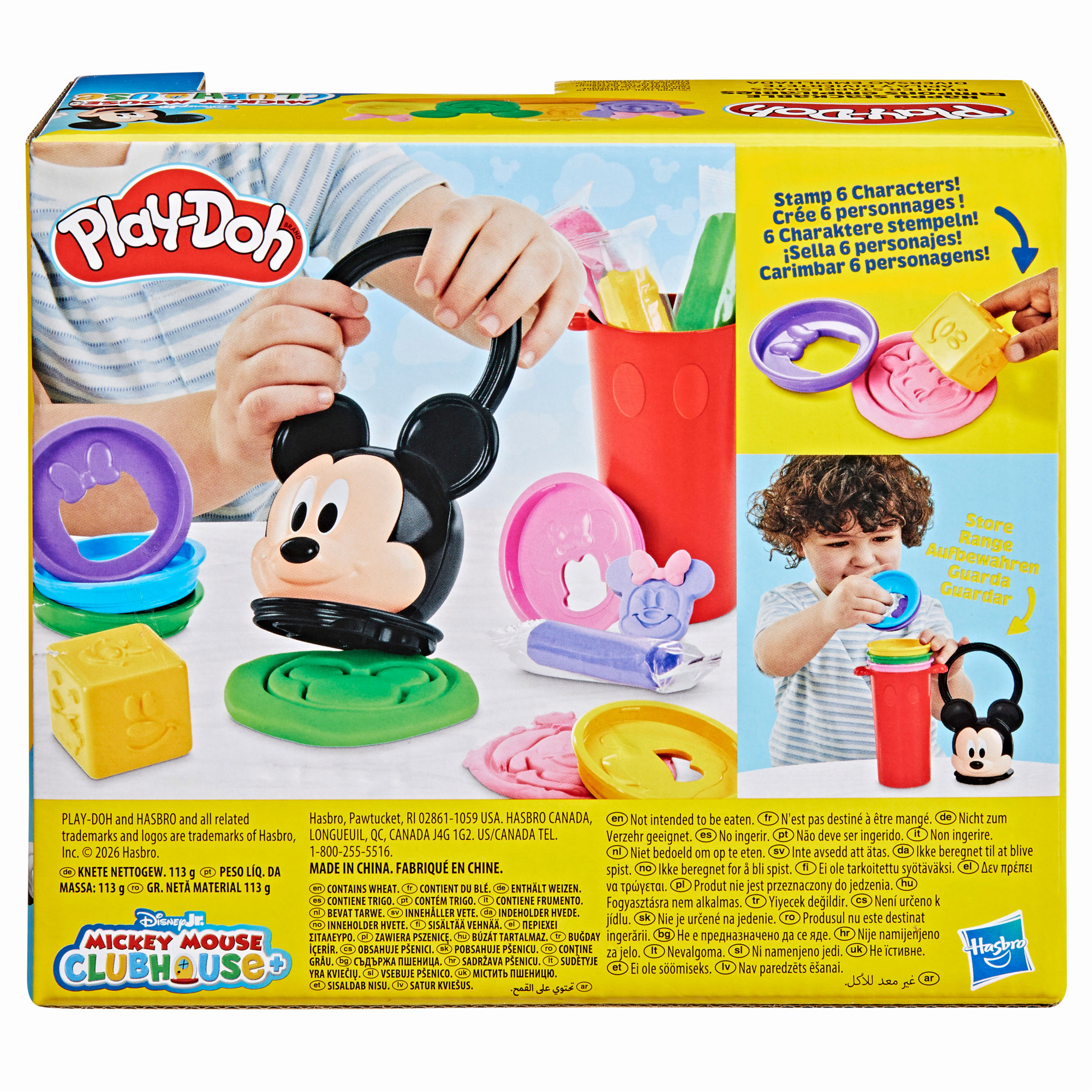- Includes container with Mickey stamper handle, 5 character stampers, face stamper block and 4 sticks of Play-Doh brand modelling compound (total 113 g)