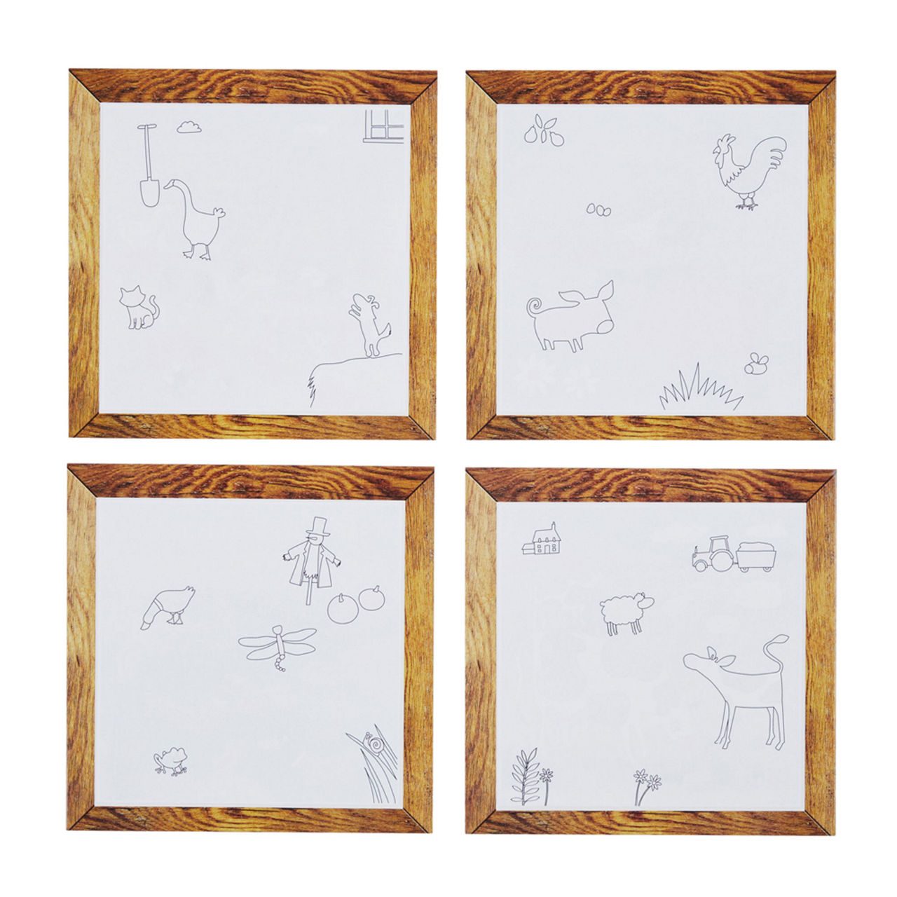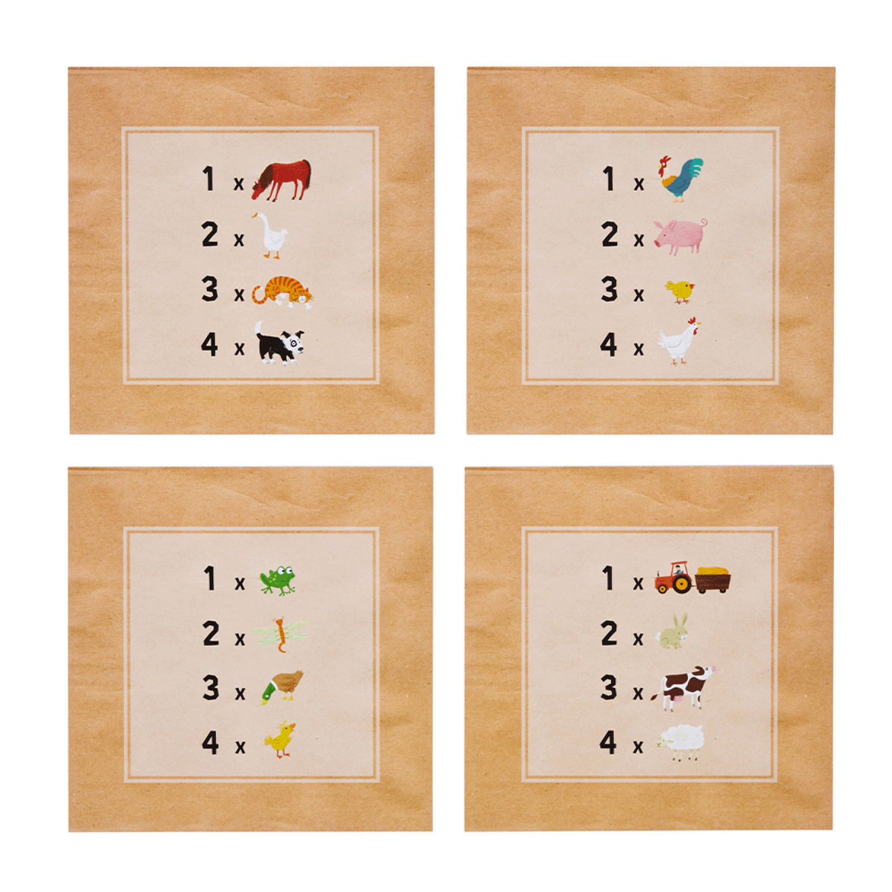 - Farm themed, includes four illustration/activity boards with counting activities on back, one magic water-brush