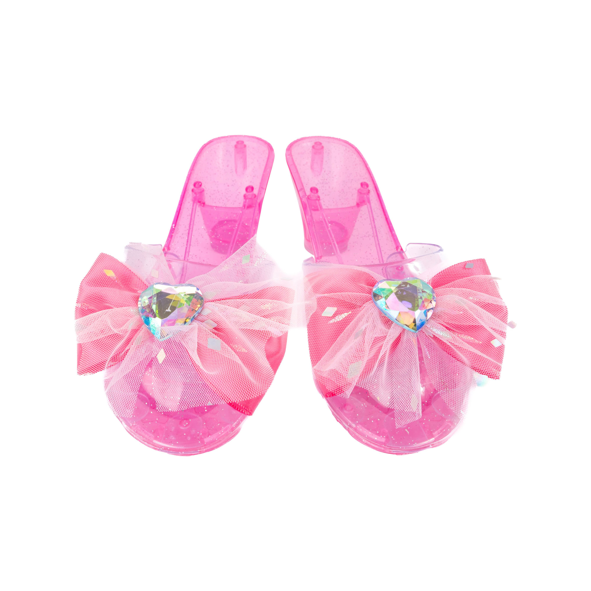 - Dress-up high heels, front bow detail, transparent finish, heart-shaped silver-tone jewel detail, slip-on style