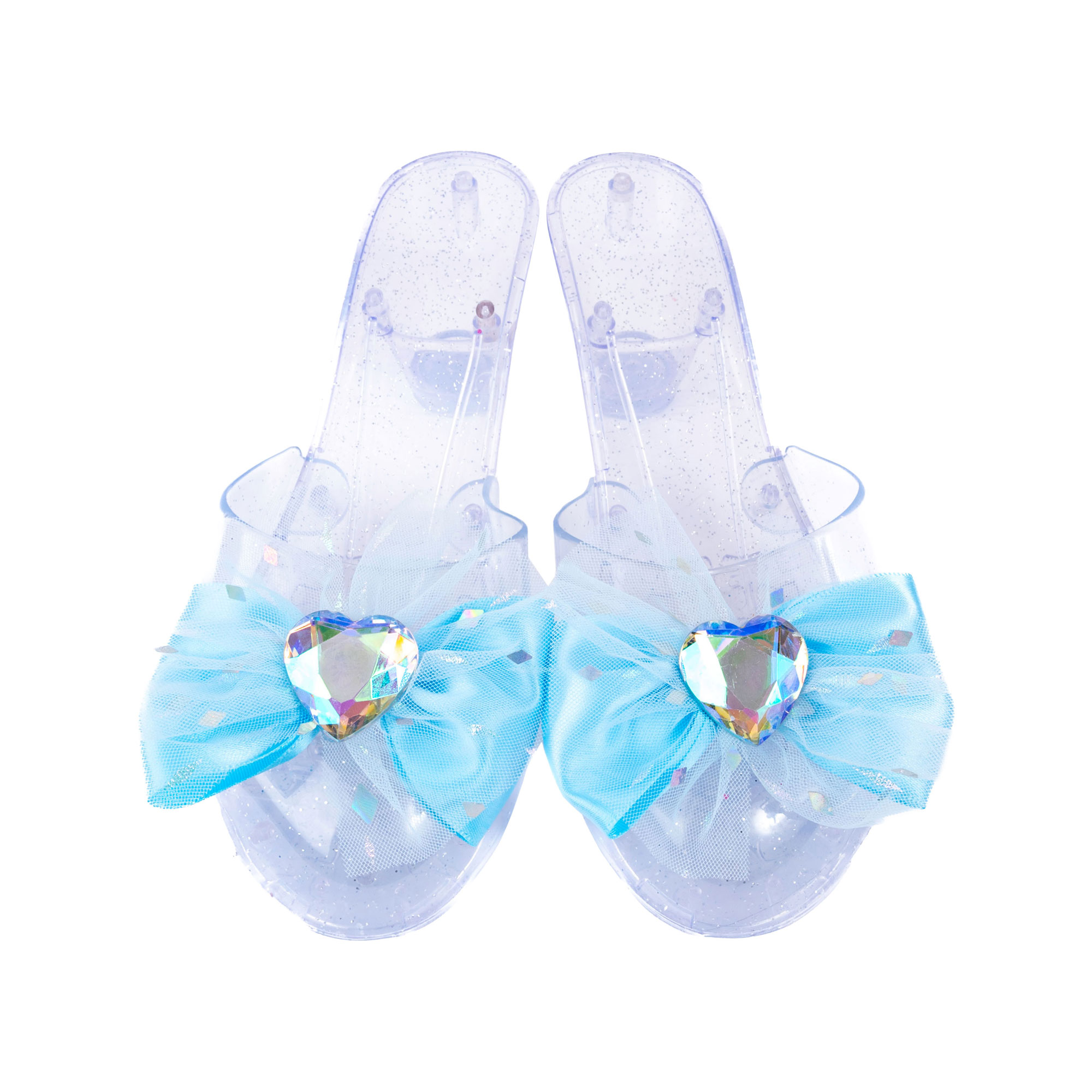 - Dress-up high heels, front bow detail, transparent finish, heart-shaped silver-tone jewel detail, slip-on style