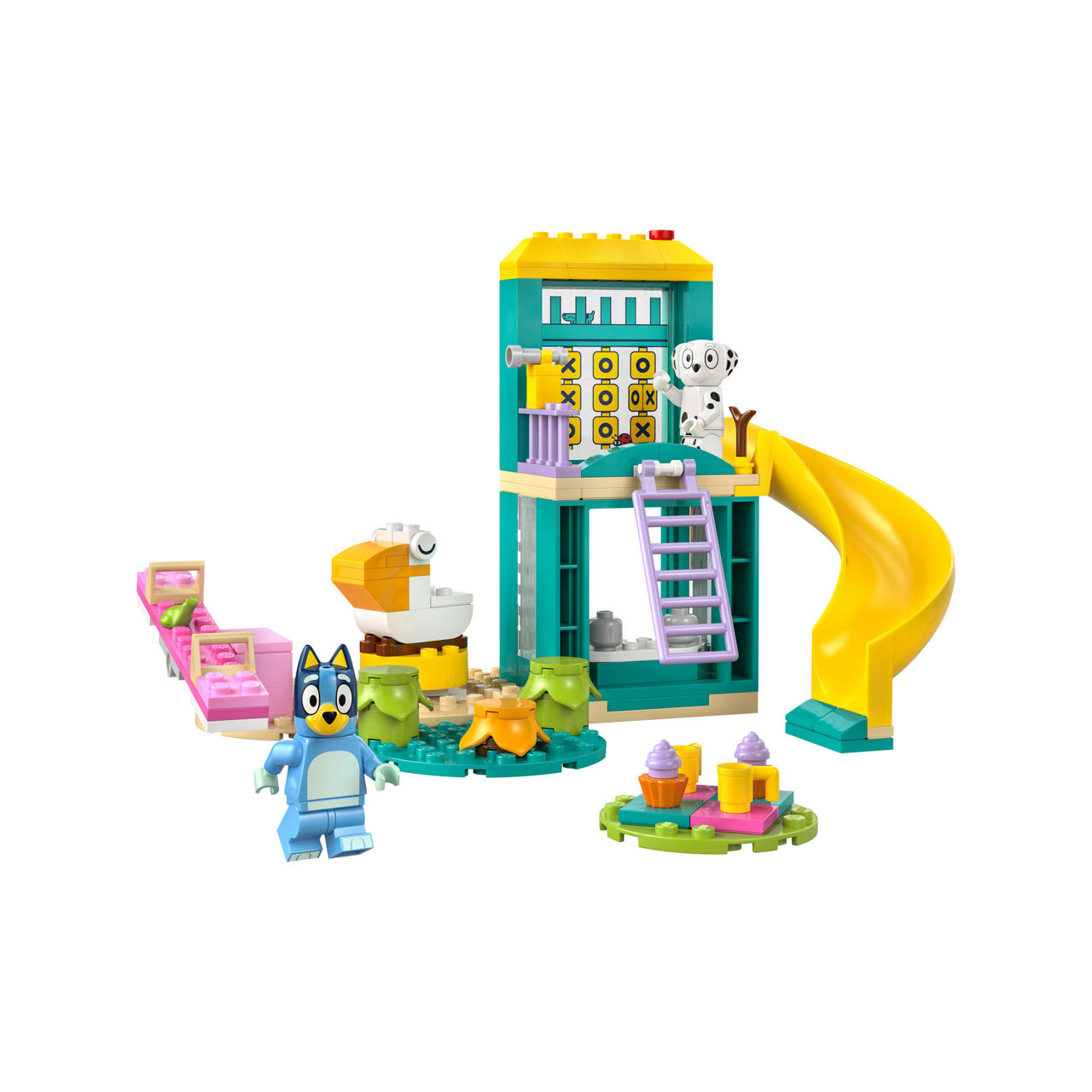 - 104 pieces, building kit, Bluey theme, Bluey and Chloe minifigure characters, slide, seesaw, other playground toys, large Starter Brick, instructions