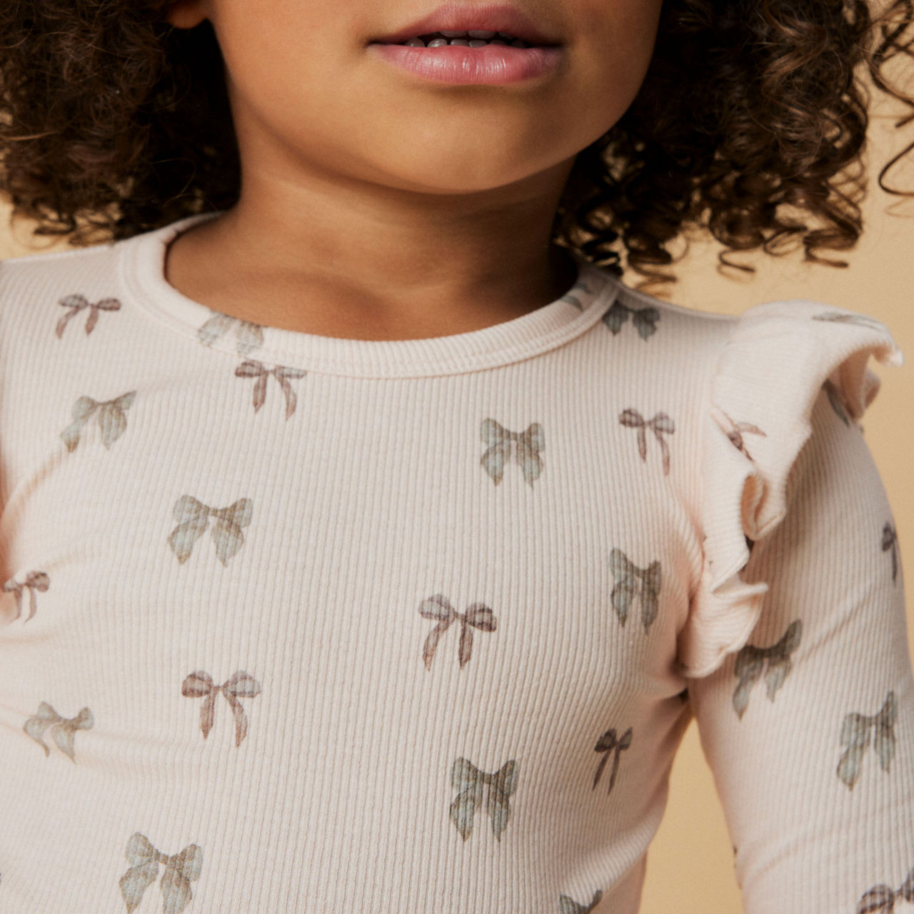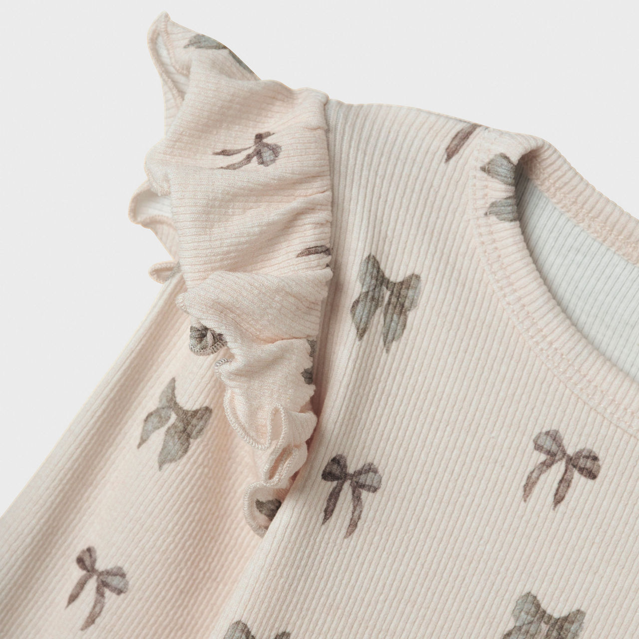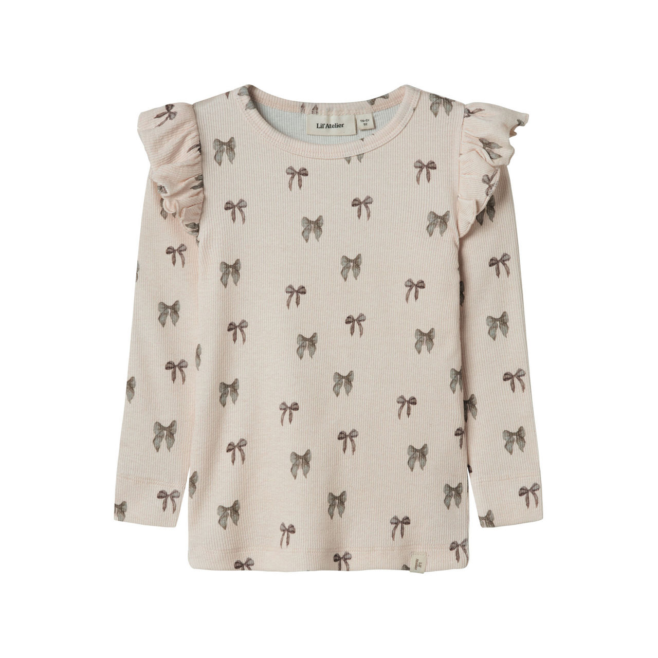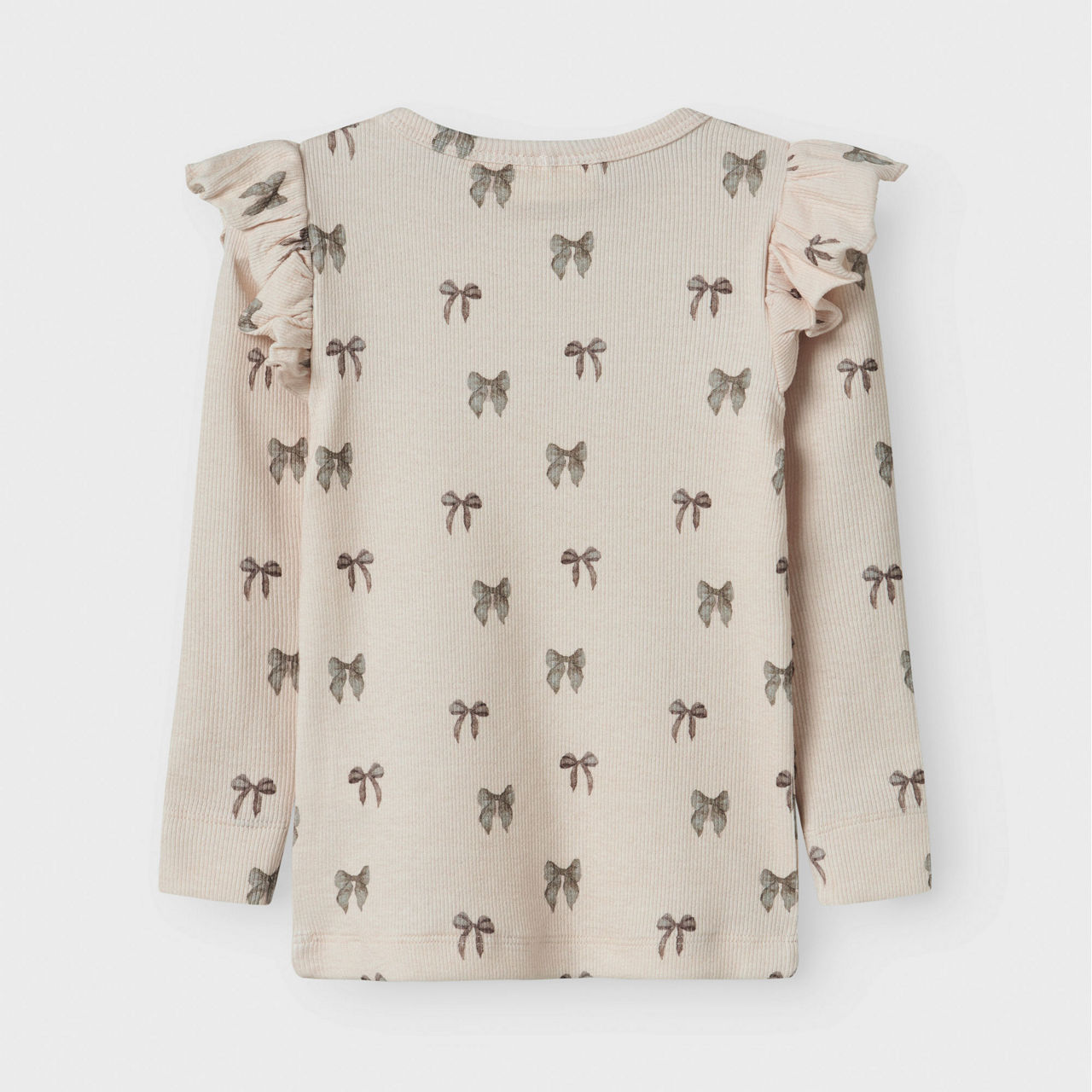 - Long sleeves, round neckline, frill shoulders, bow motif, straight hemline, ribbed fabric