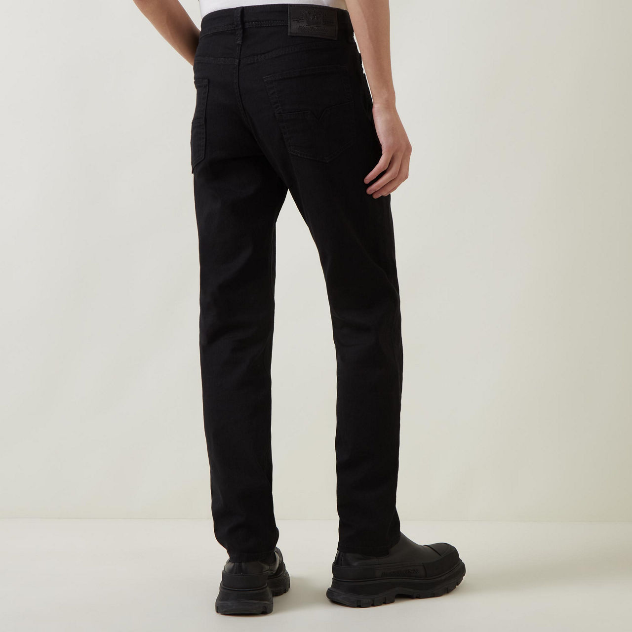 - Zip fly and button closure, belt loops, five-pocket design, tonal stitching, logo patch, smooth denim finish