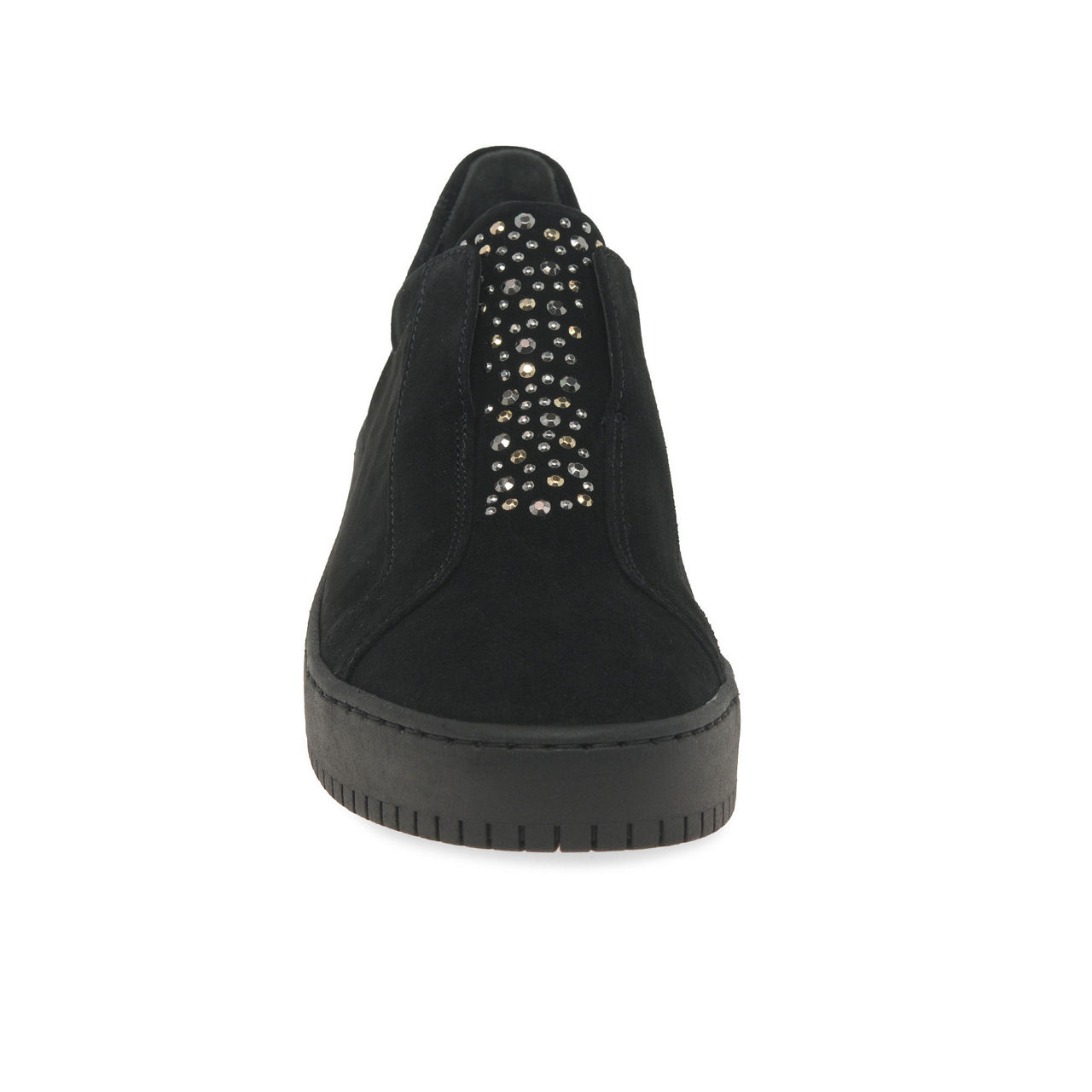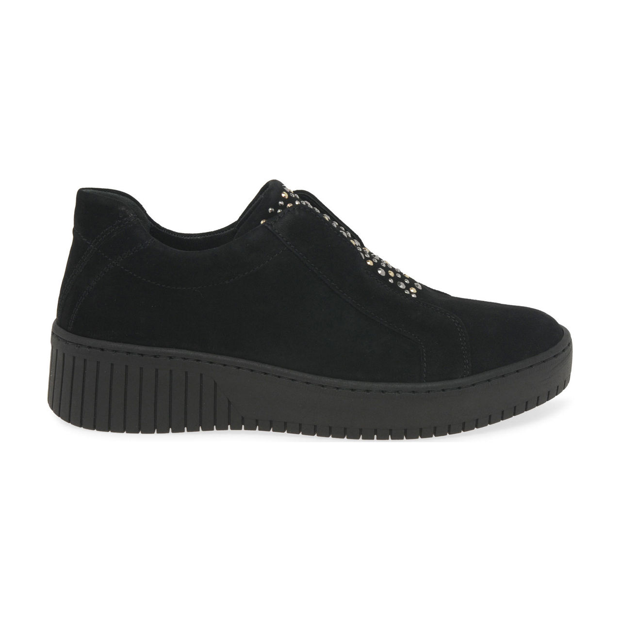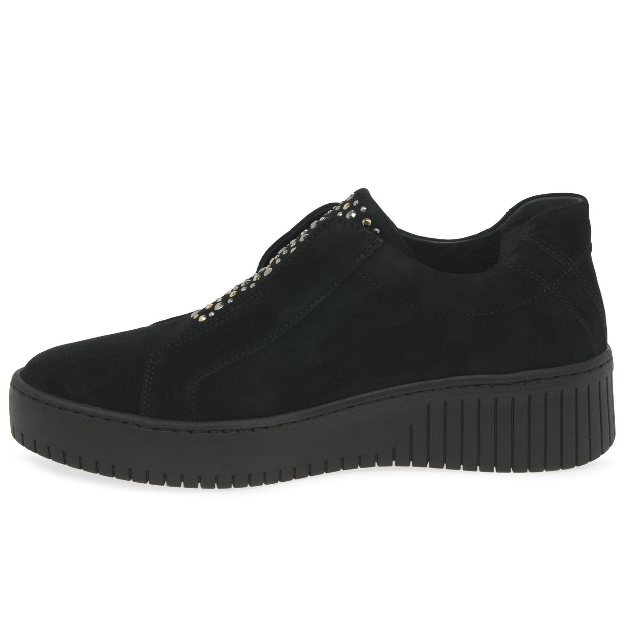 A stylish edge on a typical trainer, the Gabor Wonderland features soft suede uppers and platform sole in a casual slip on design, finished with studded sparkle details.