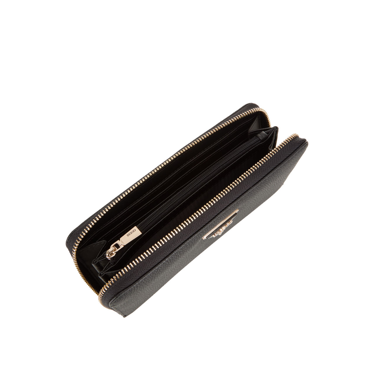 - Zip closure with wrist strap, internal coin purse, card slots, signature logo plaque, exterior zipped pocket, gold-tone hardware