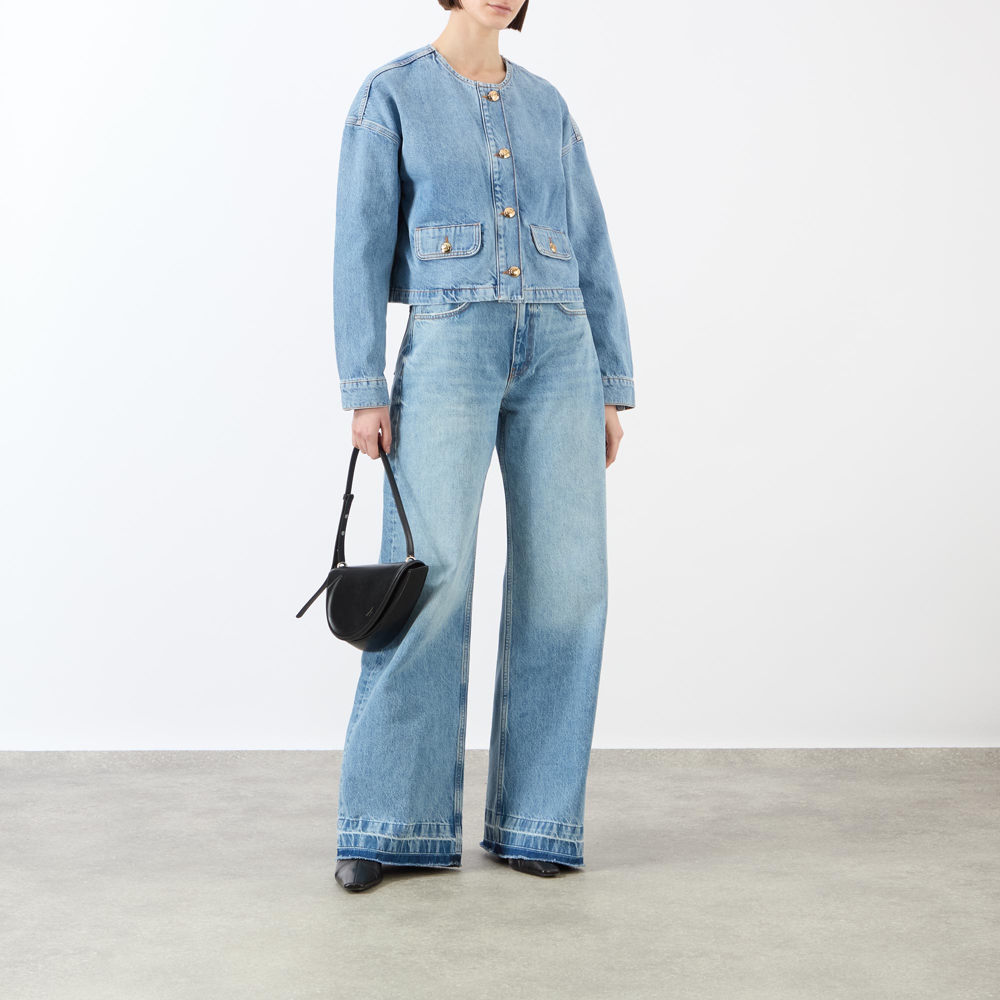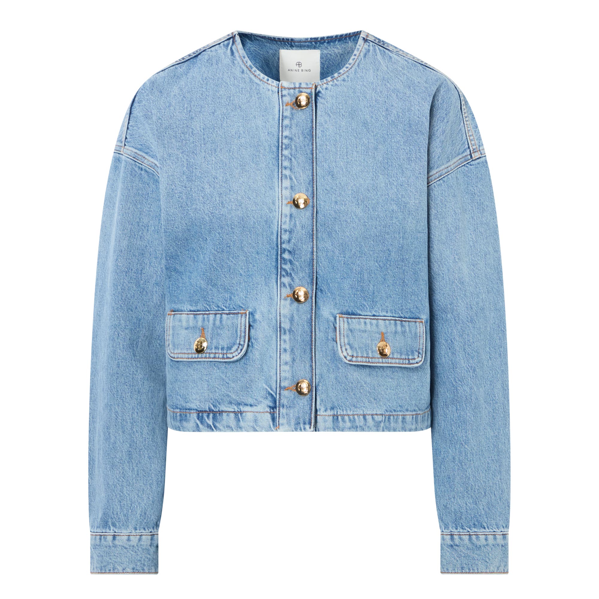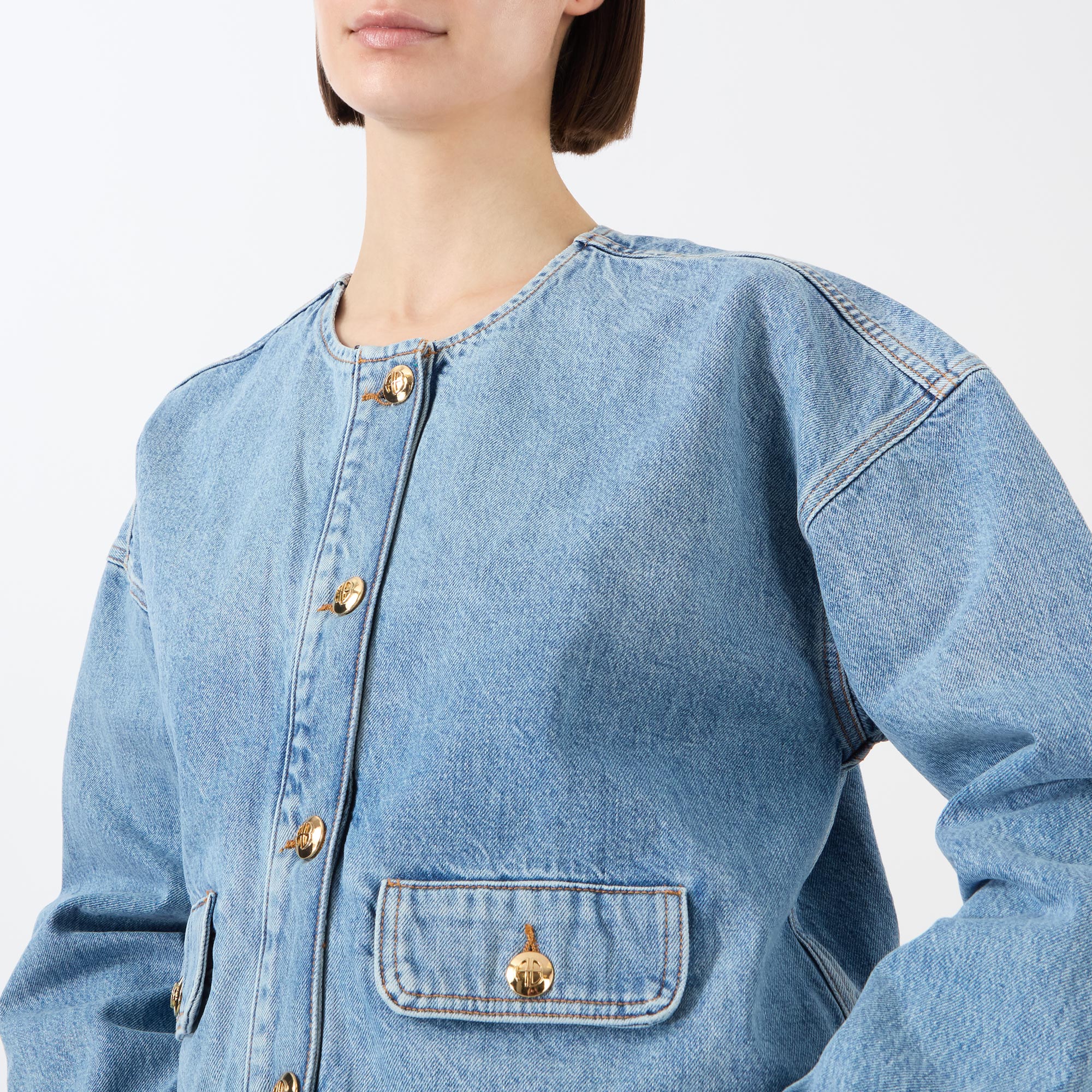 - Collarless, round neckline, long sleeves, dropped shoulders, front button fastenings, two side flap pockets, single-button cuffs, contrast stitching, smooth denim finish