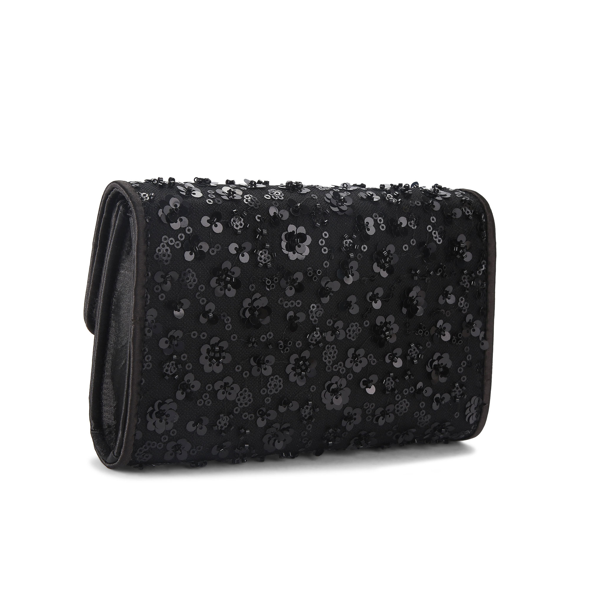 - Clutch style, fabric finish, sequin flower embellishment, gold-tone branding, long crossbody optional strap