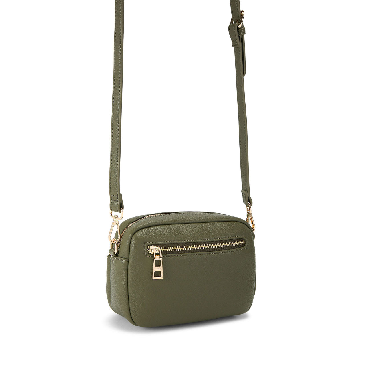 - Top zip fastening, detachable and adjustable crossbody strap, one front pocket and one rear pocket with zip fastenings, detachable tassel key ring, logo lettering, faux leather finish, rounded edges