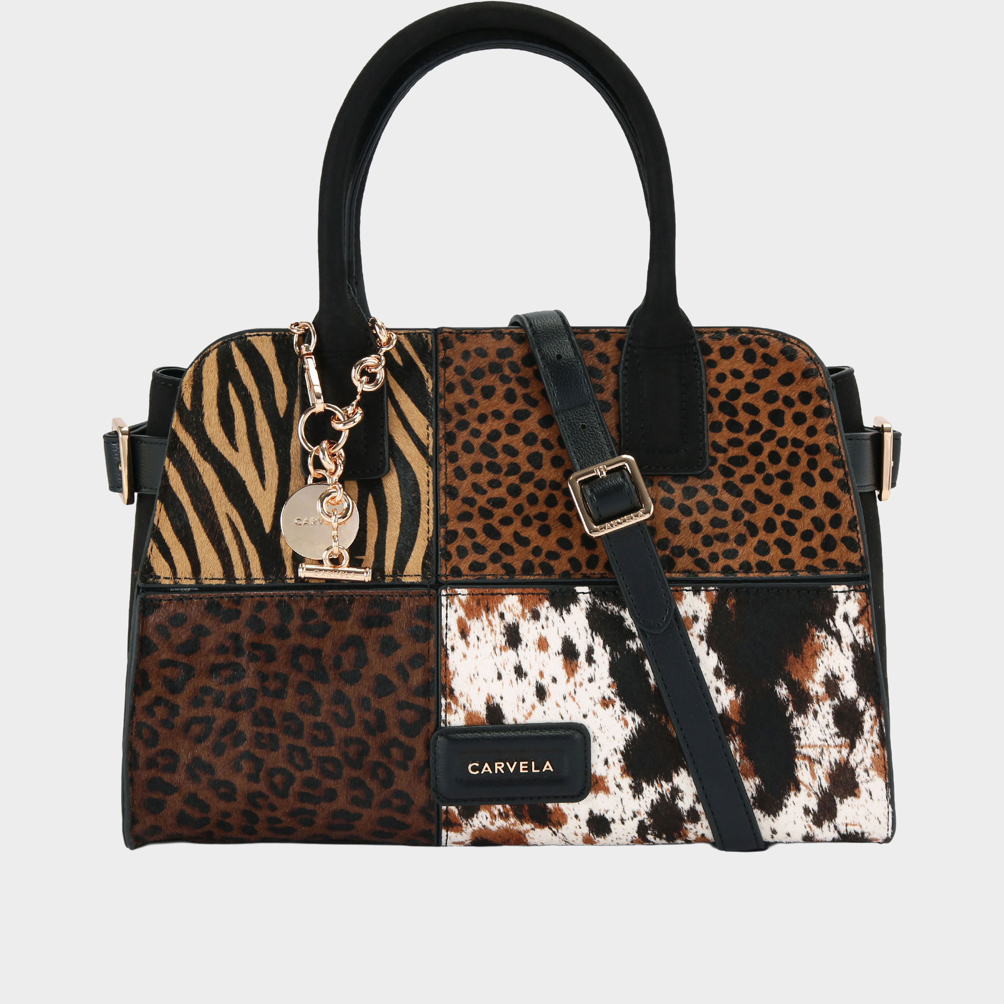- Structured top handle bag, multi panel animal print, gold chain with leopard print satin scarf