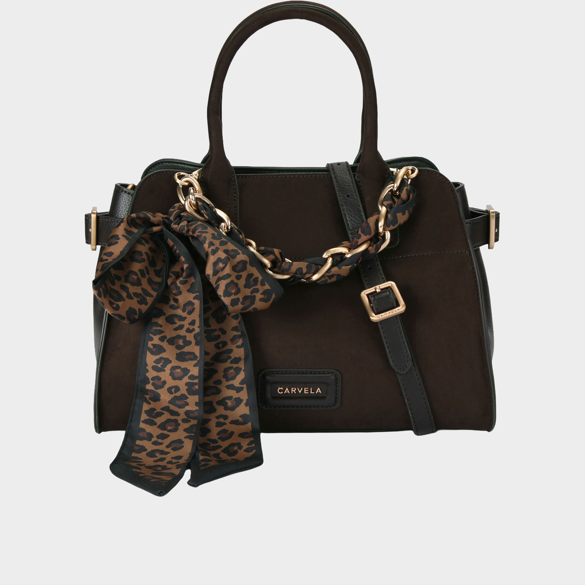 • Structured top handle bag, brushed gold chain with leopard print satin scarf, optional cross body strap, zipped closure, four gold feet