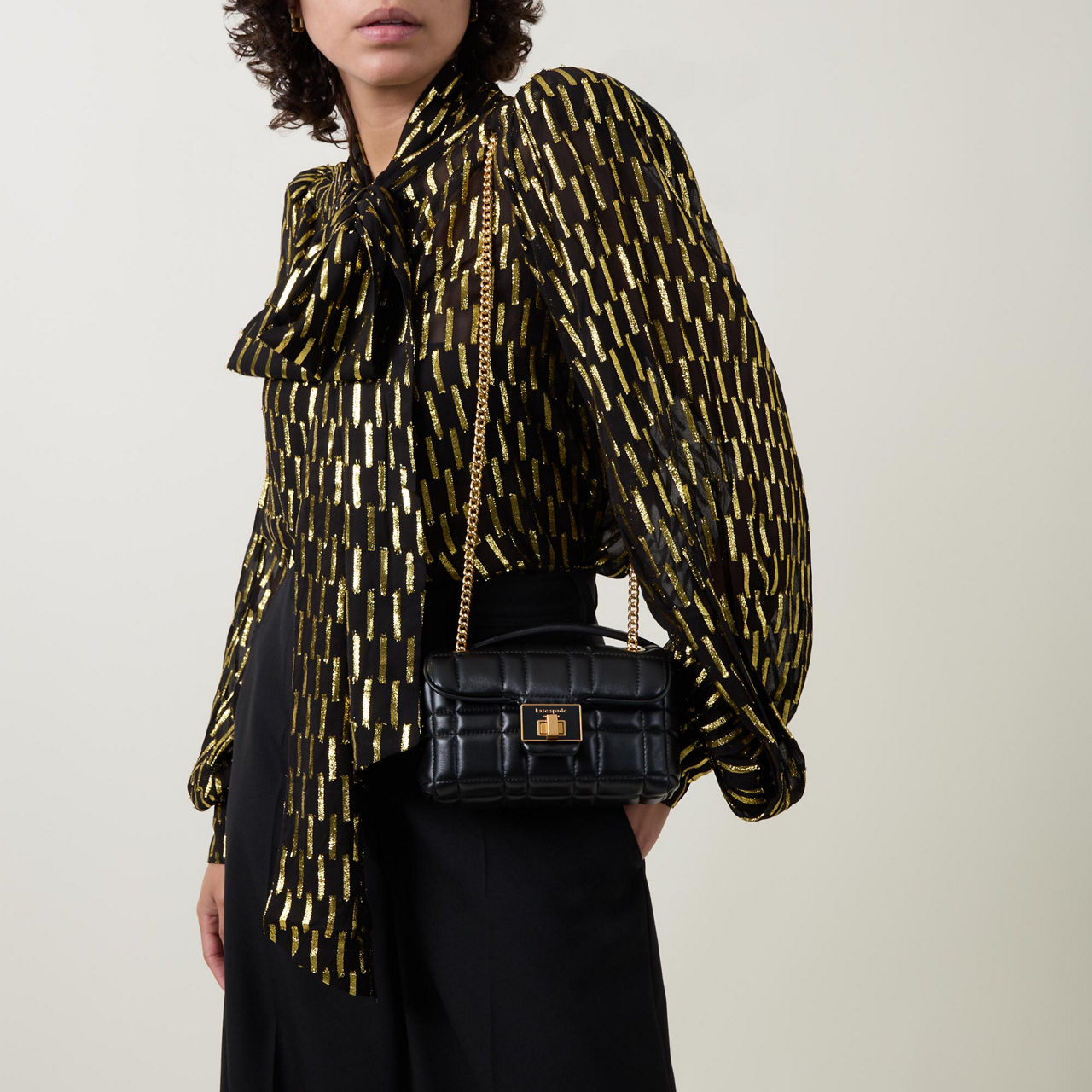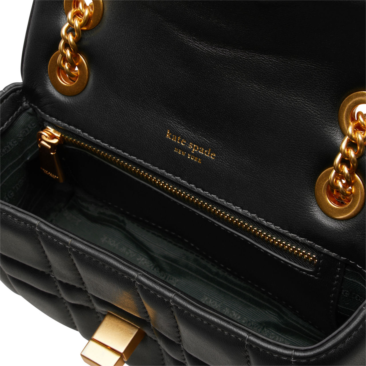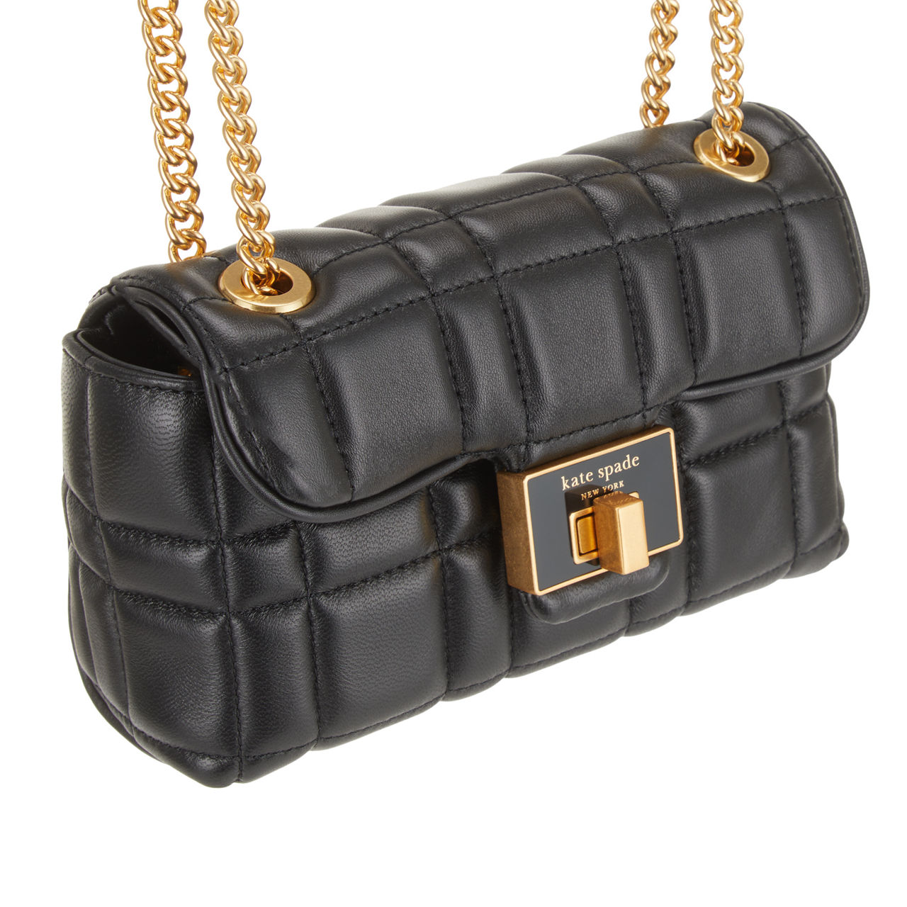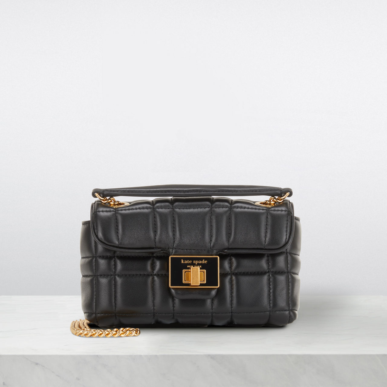 • Chain strap, turnlock closure with logo detail, foldover design, tonal stitching, gold-tone hardware, quilted finish