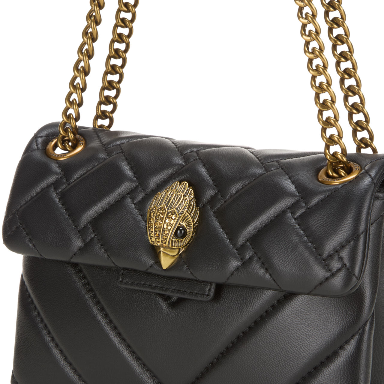 - Chevron quilting, chain strap, magnetic flap closure, eagle embellishment, logo detail, crystal details, gold-tone