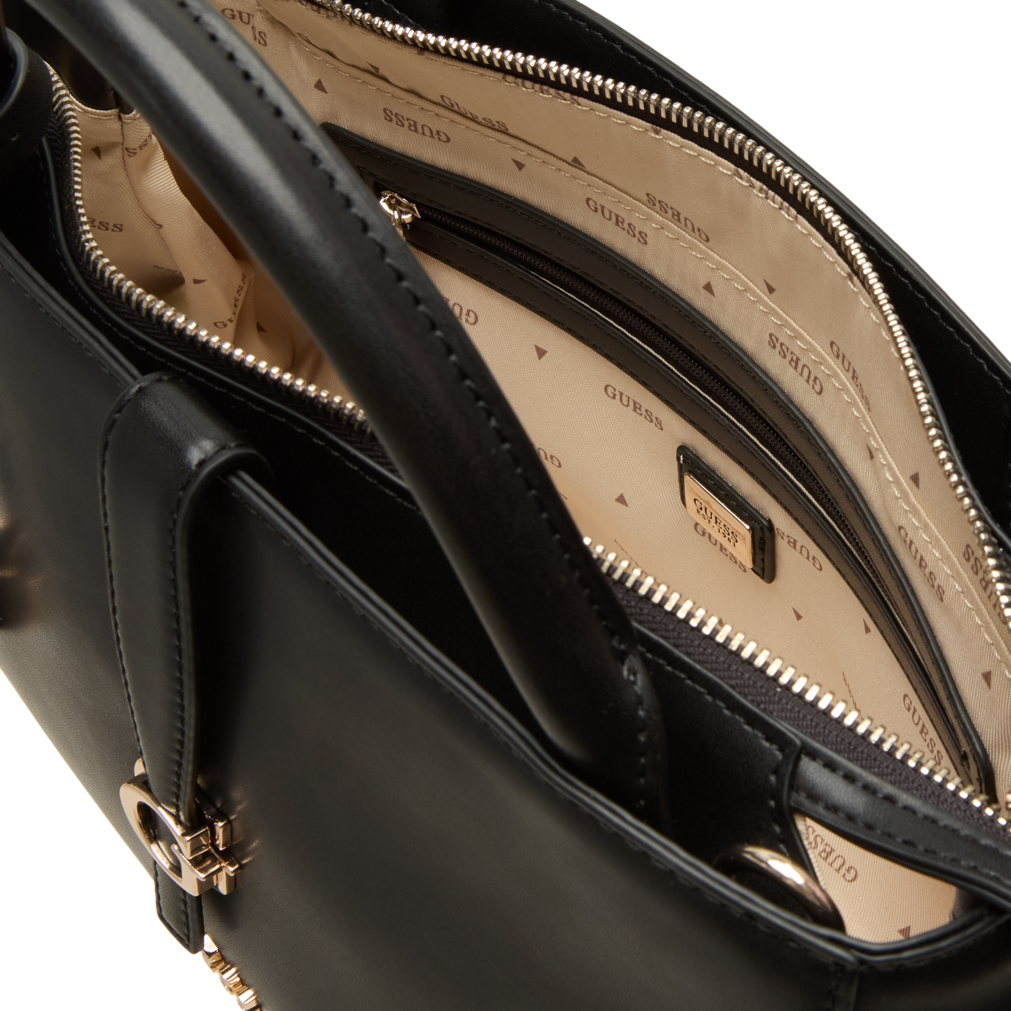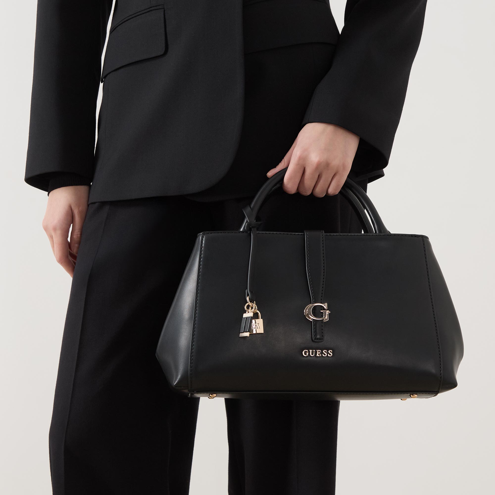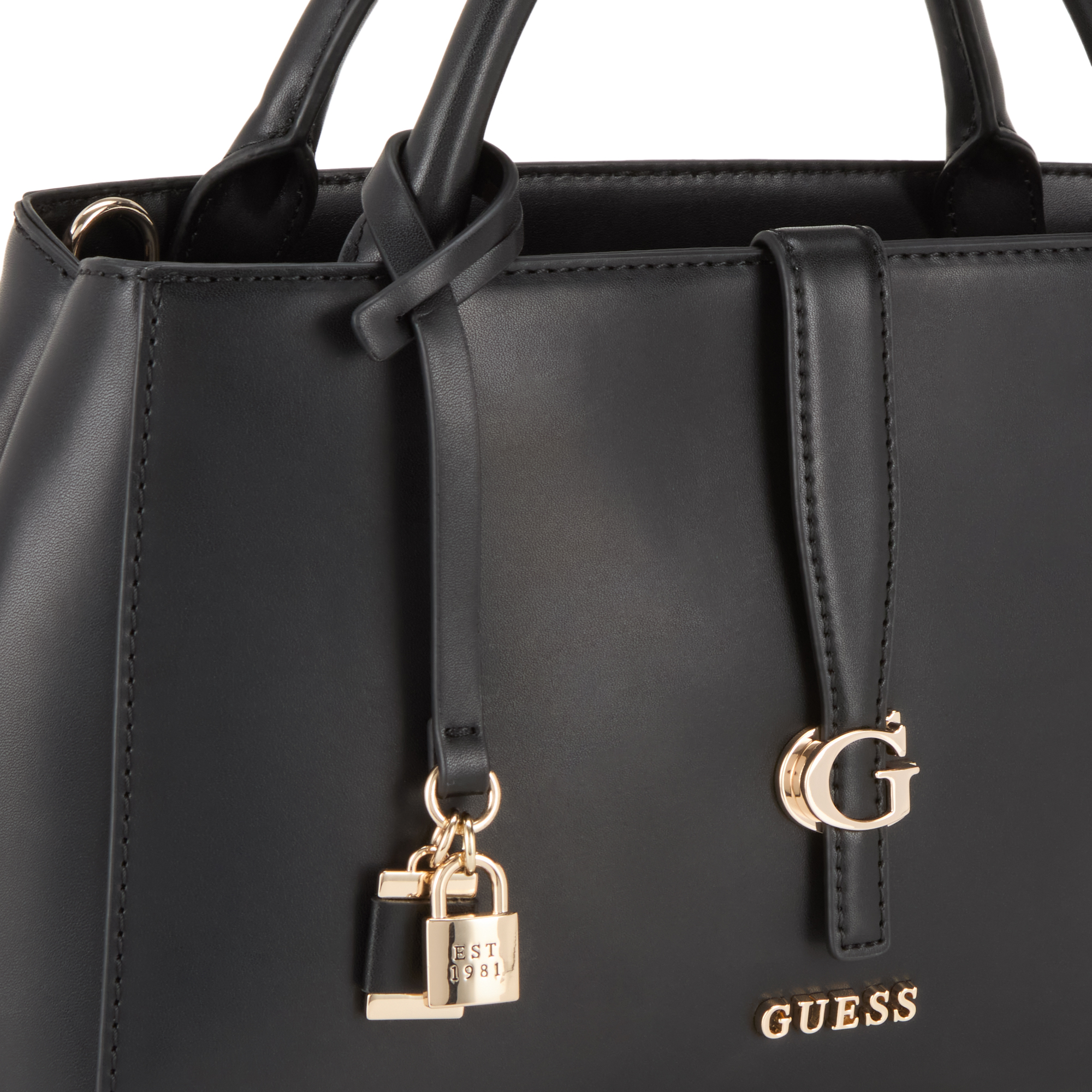 - Two top carry handles, detachable adjustable strap that can be worn across the body or over the shoulder, top zip-fastening pocket, hanging padlock charms, foldover strap with G logo hardware, outer front slip pocket, front logo lettering, gold-tone finishes, tonal stitching, back zip-fastening pocket, structured shape, smooth finish