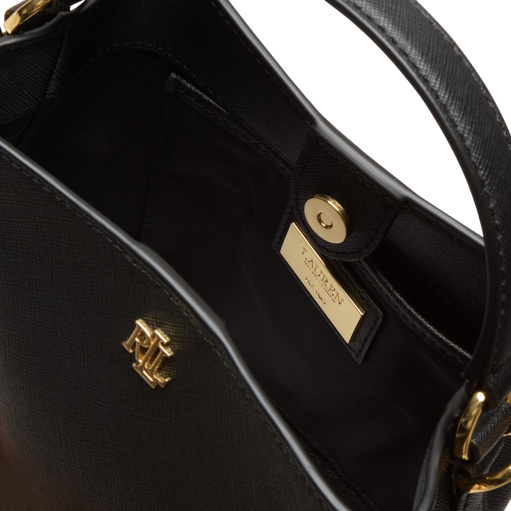 - Top handle, detachable and adjustable crossbody strap, magnetic snap fastening, monogram logo hardware, gold-tone finishes, four foot studs, tonal stitching, textured finish