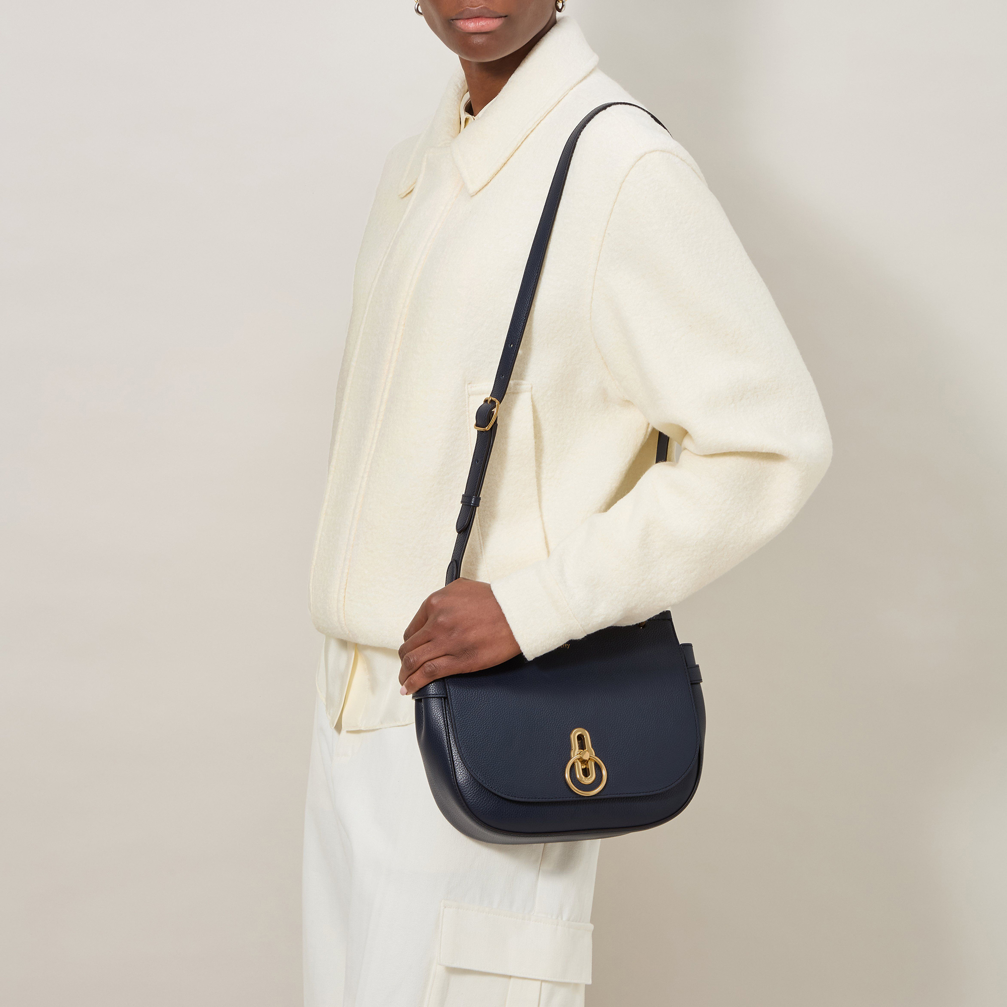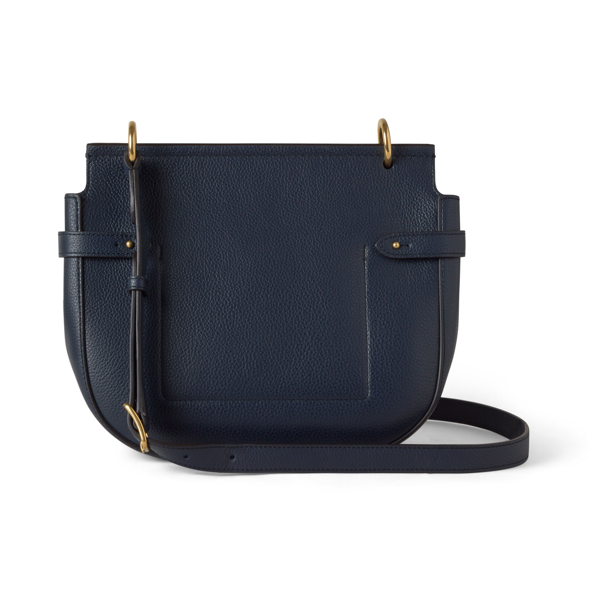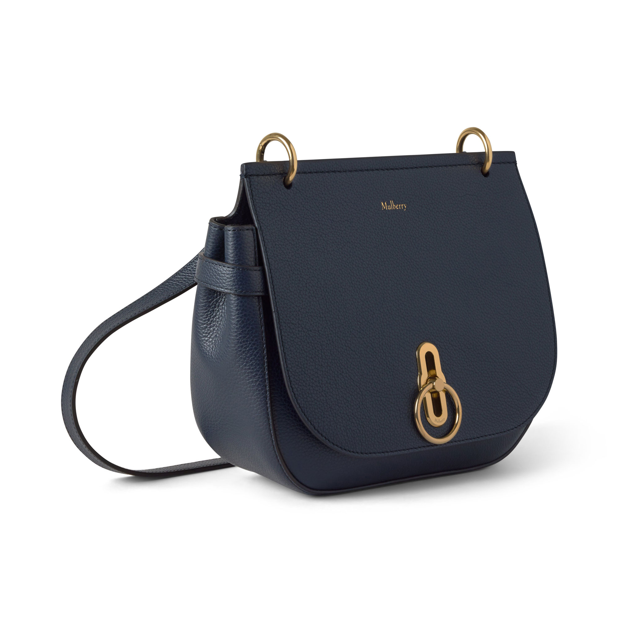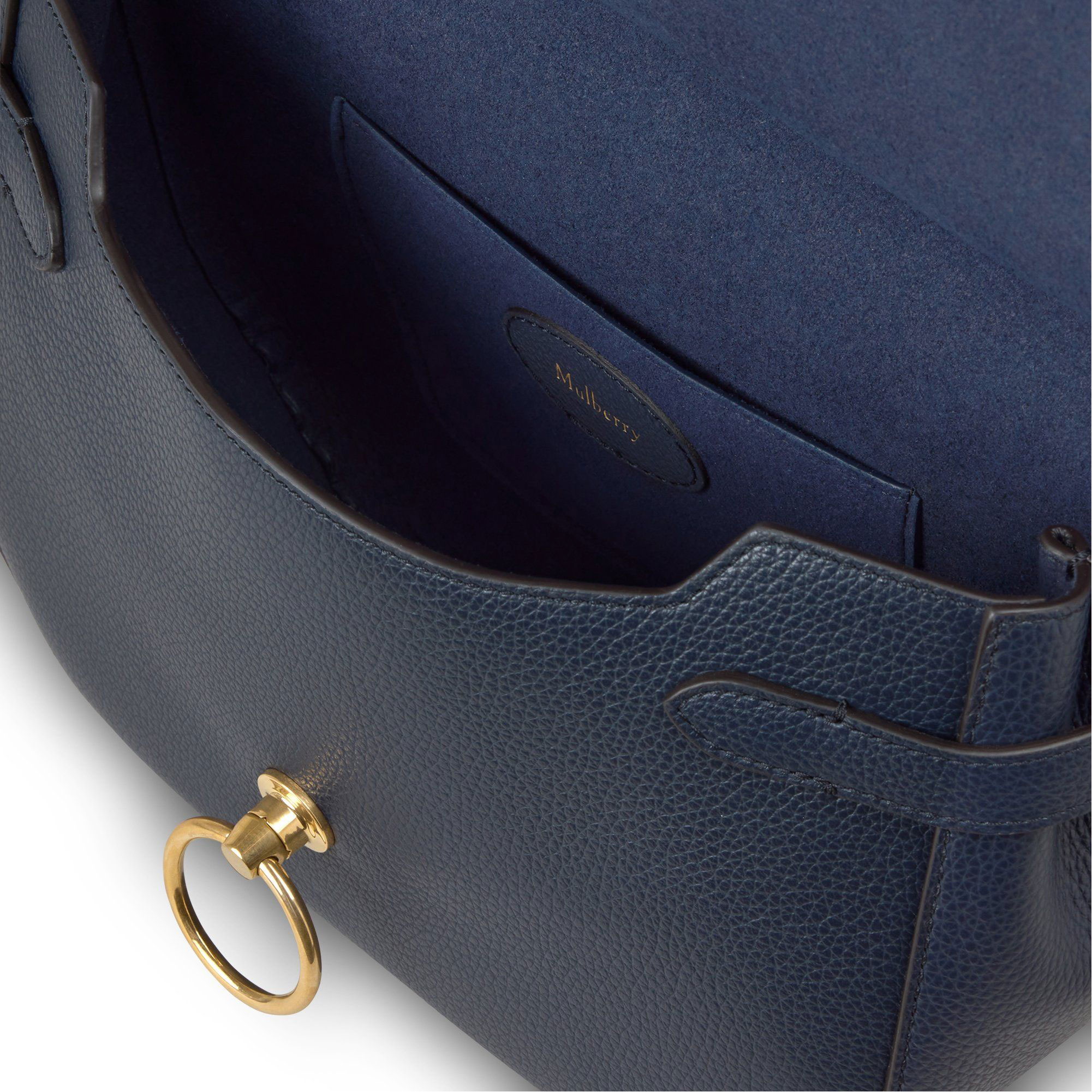 - Brass-tone hardware finish, Rider's Lock closure, adjustable shoulder strap with functional buckle detailing, foil-embossed Mulberry signature, side belt detail