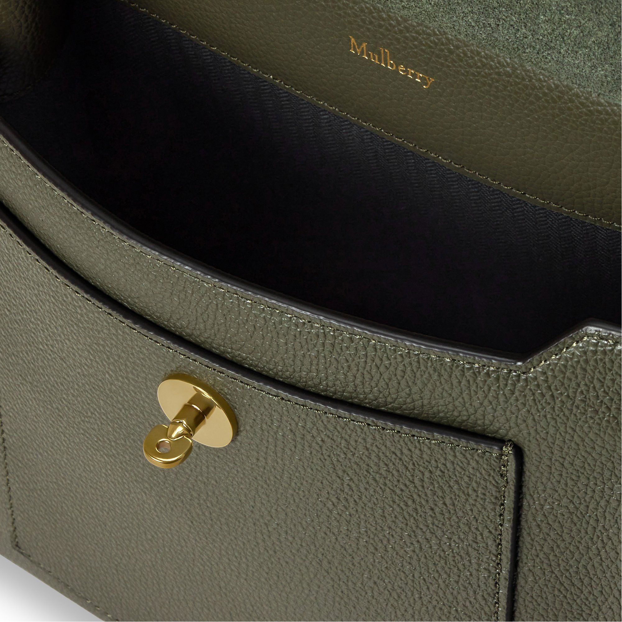 - Interior: One main compartment, internal foil-embossed Mulberry signature, suede and herringbone lining