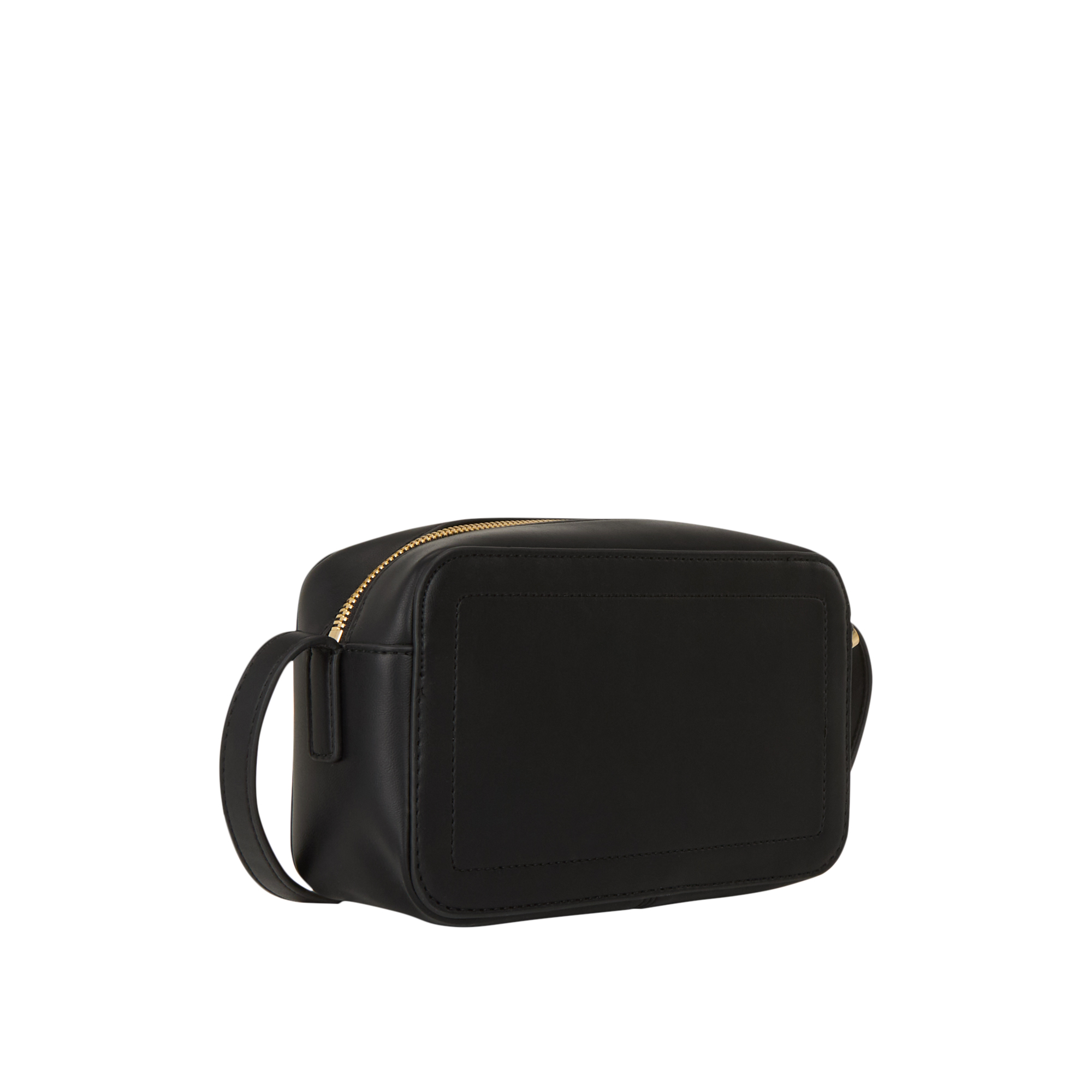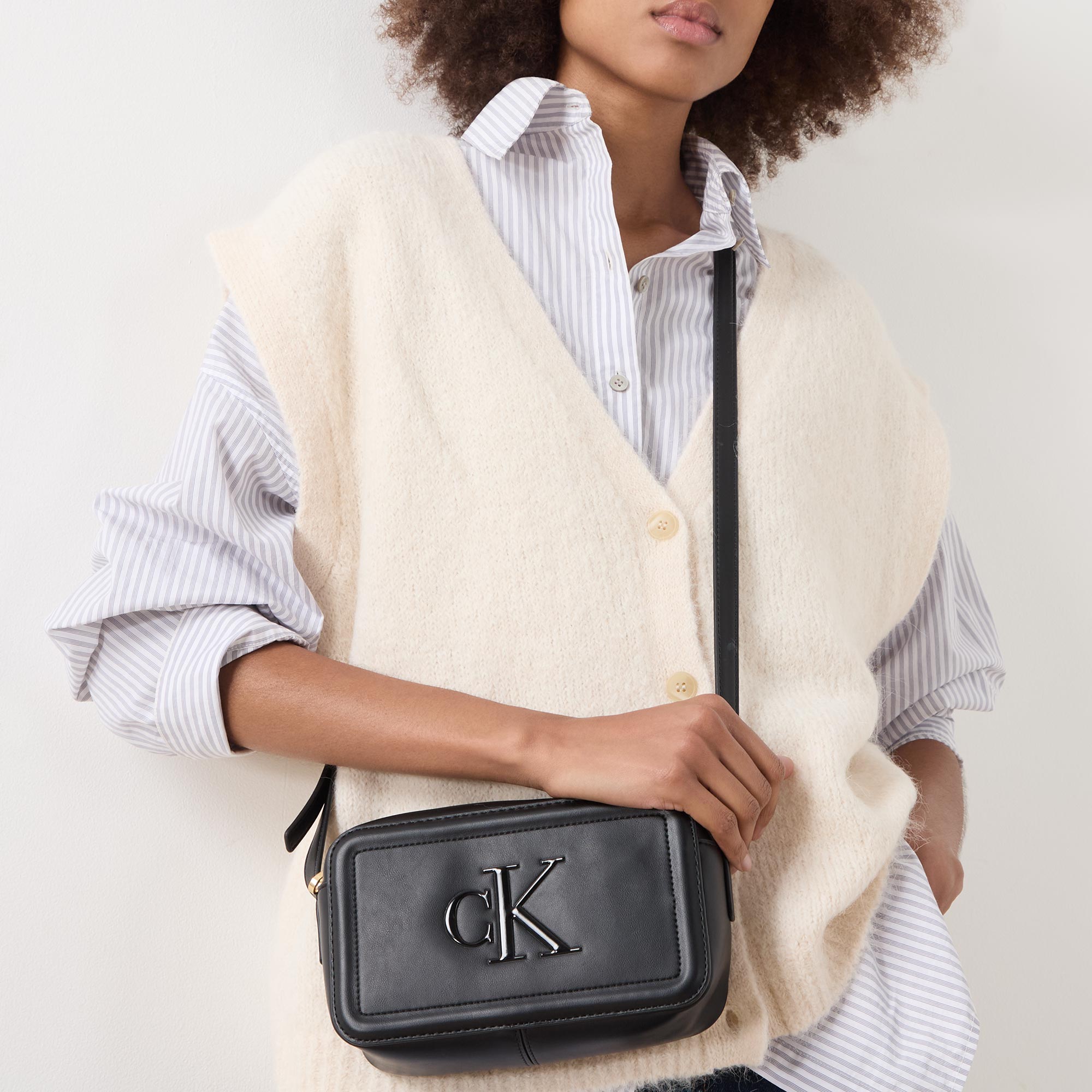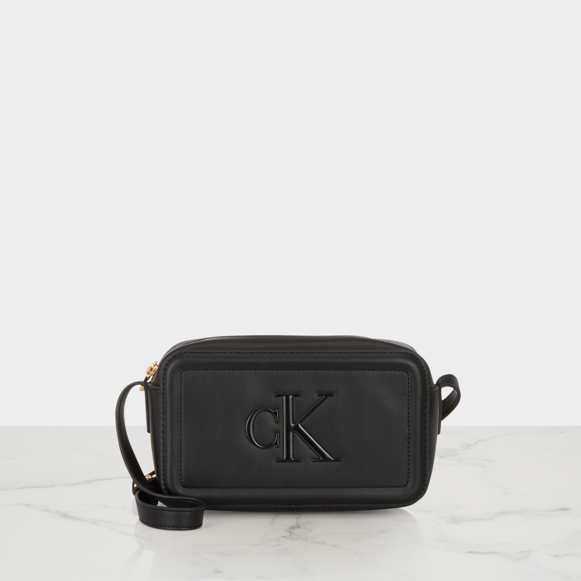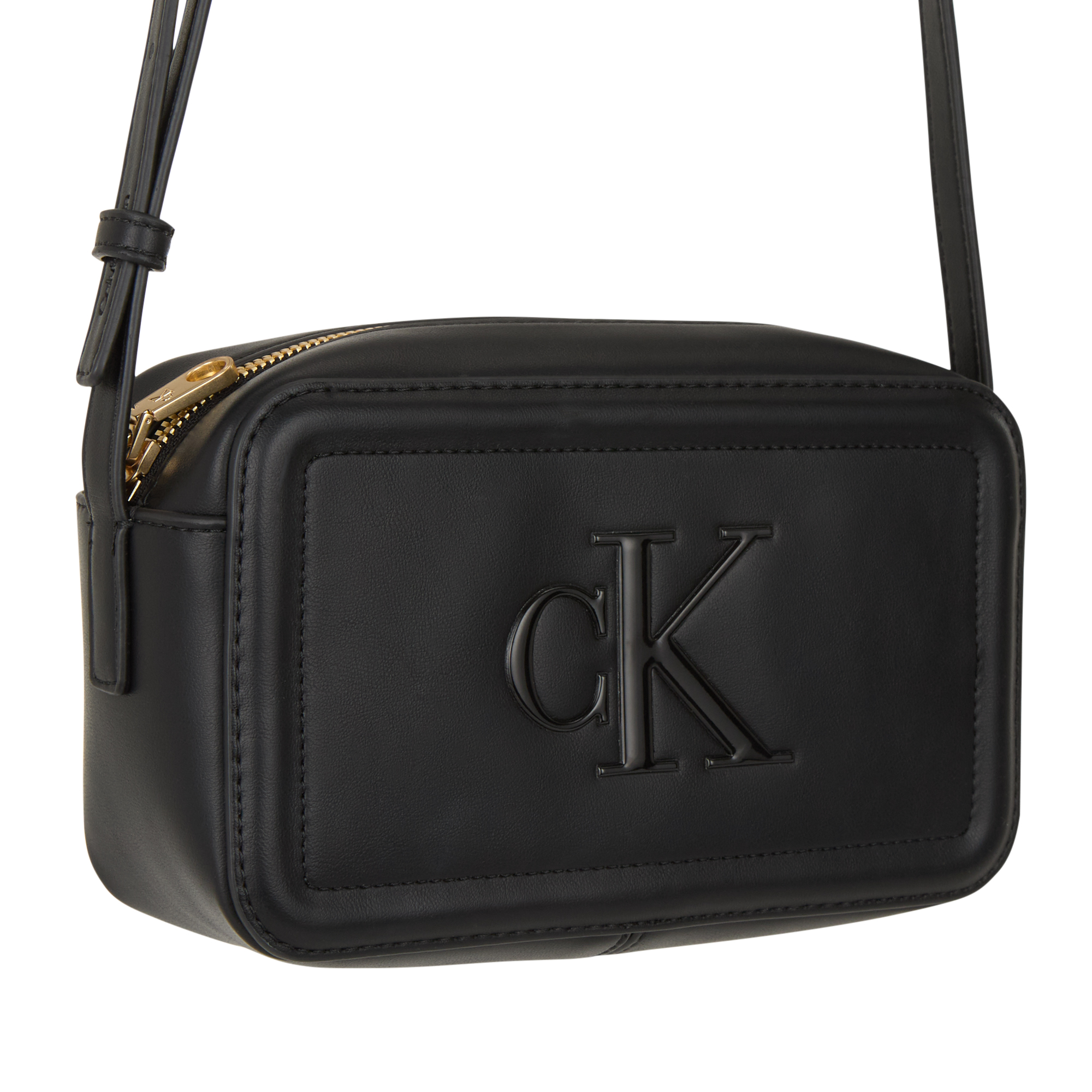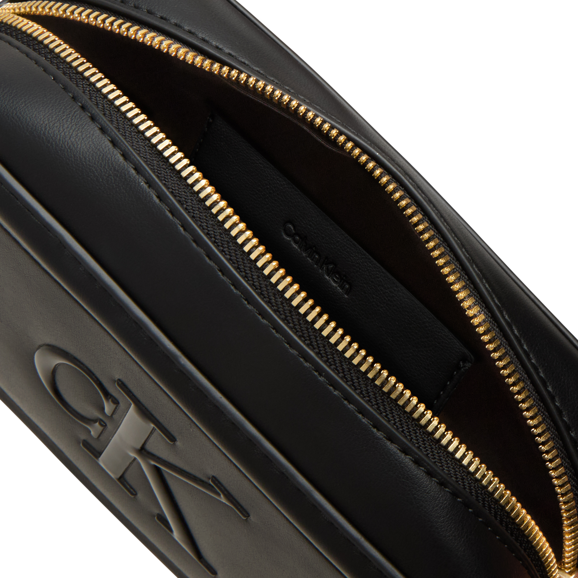 - Top zip-fastening closure, adjustable crossbody strap, compact camera shape, tonal stitching, embossed CK logo to the front, gold-tone hardware, smooth finish