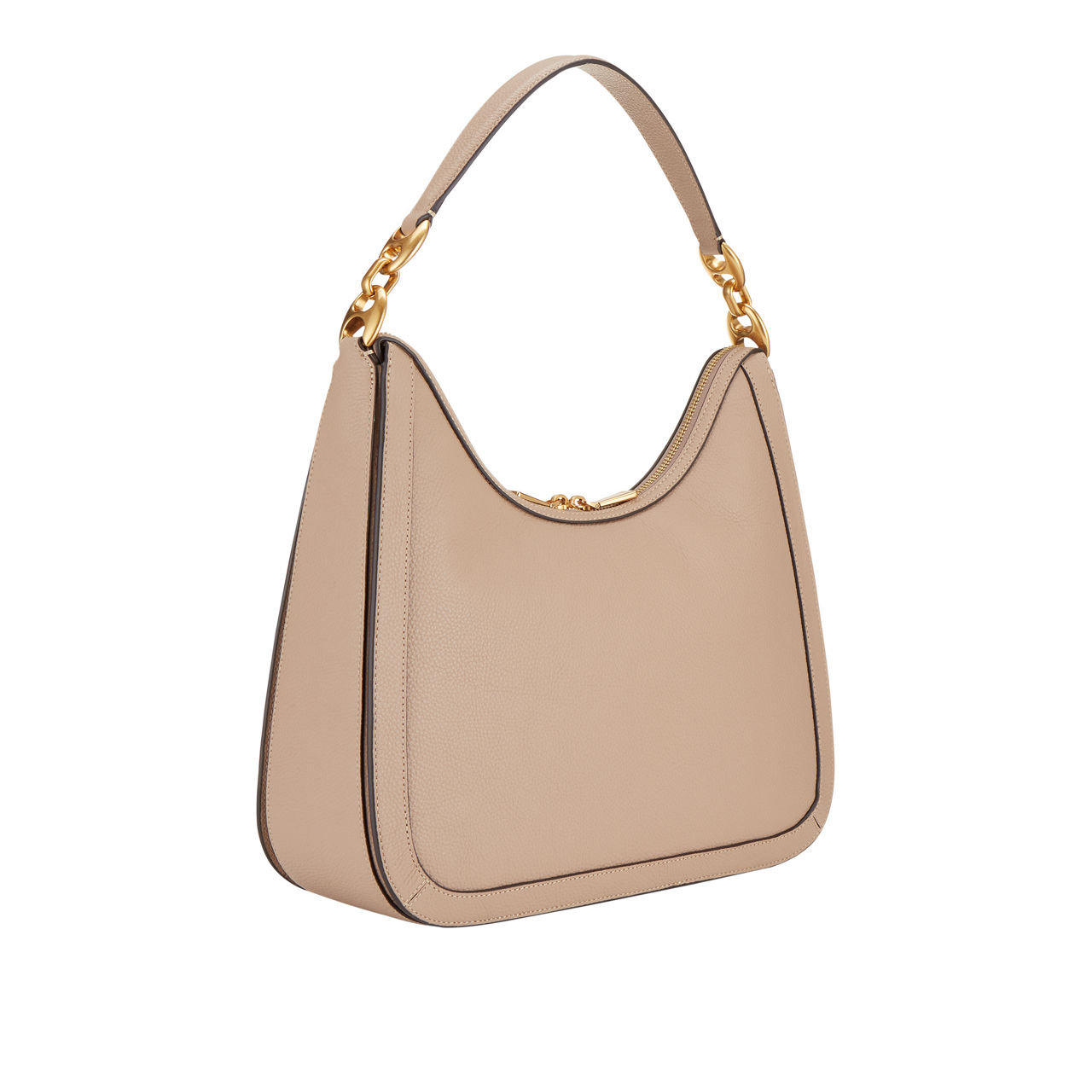 - Shoulder strap, top-zip fastening, gold-toned hardware, pebbled finish, logo plate detail