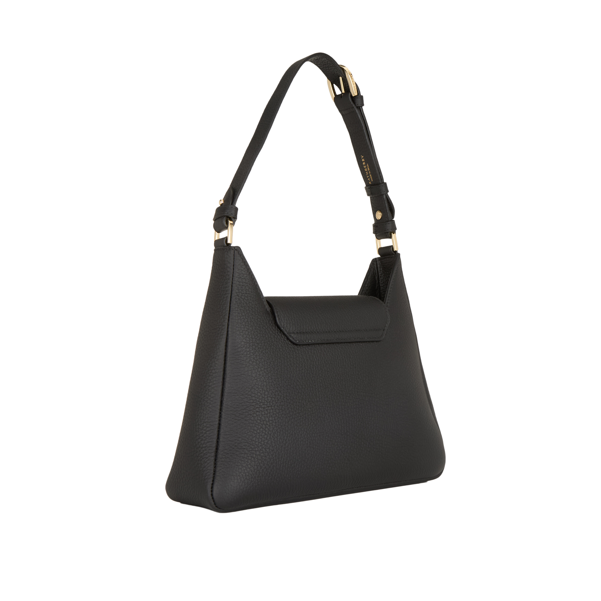 - Gold-toned hardware, adjustable top handle, pebbled finish, magnetic flap closure, logo detail