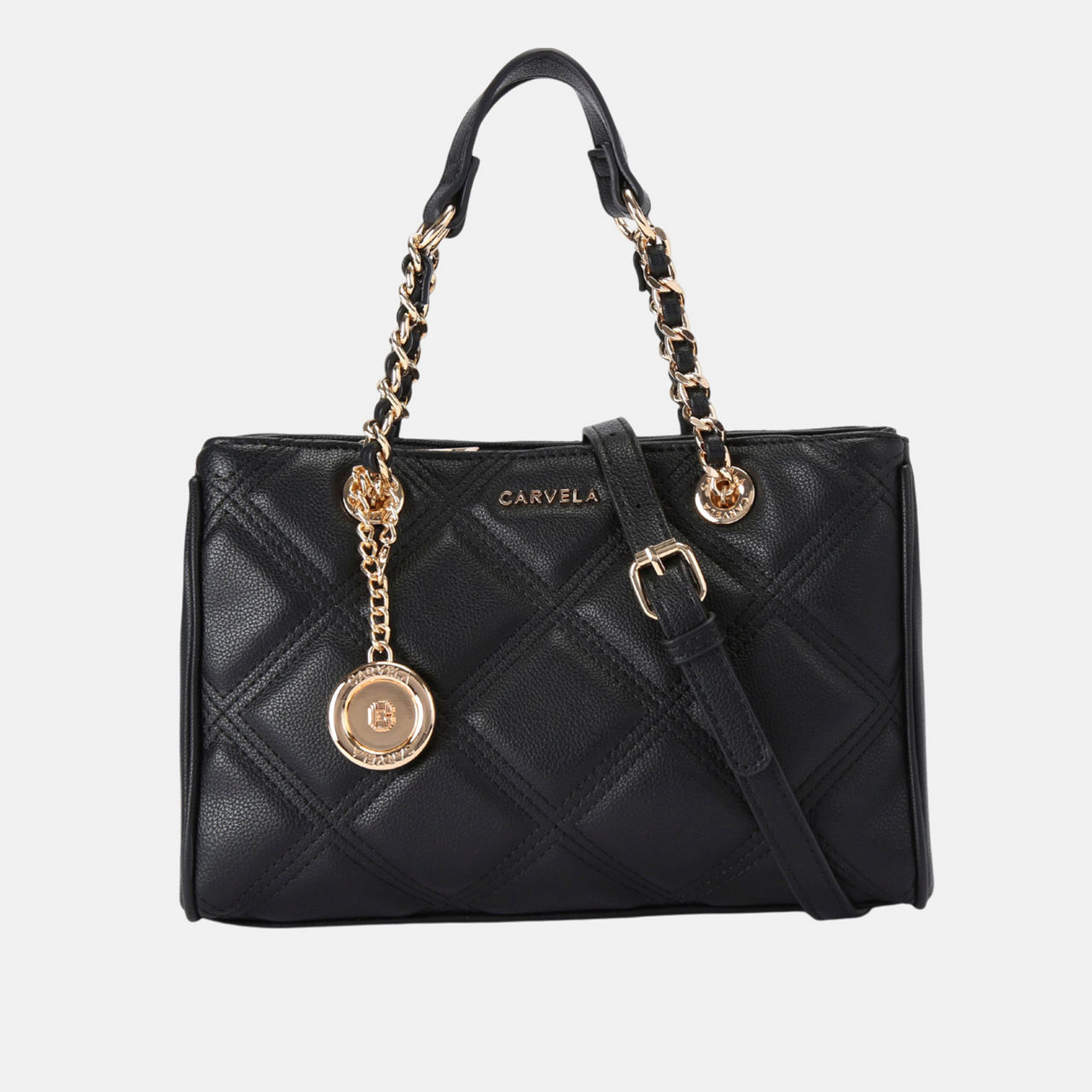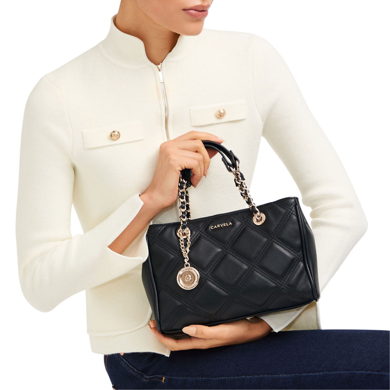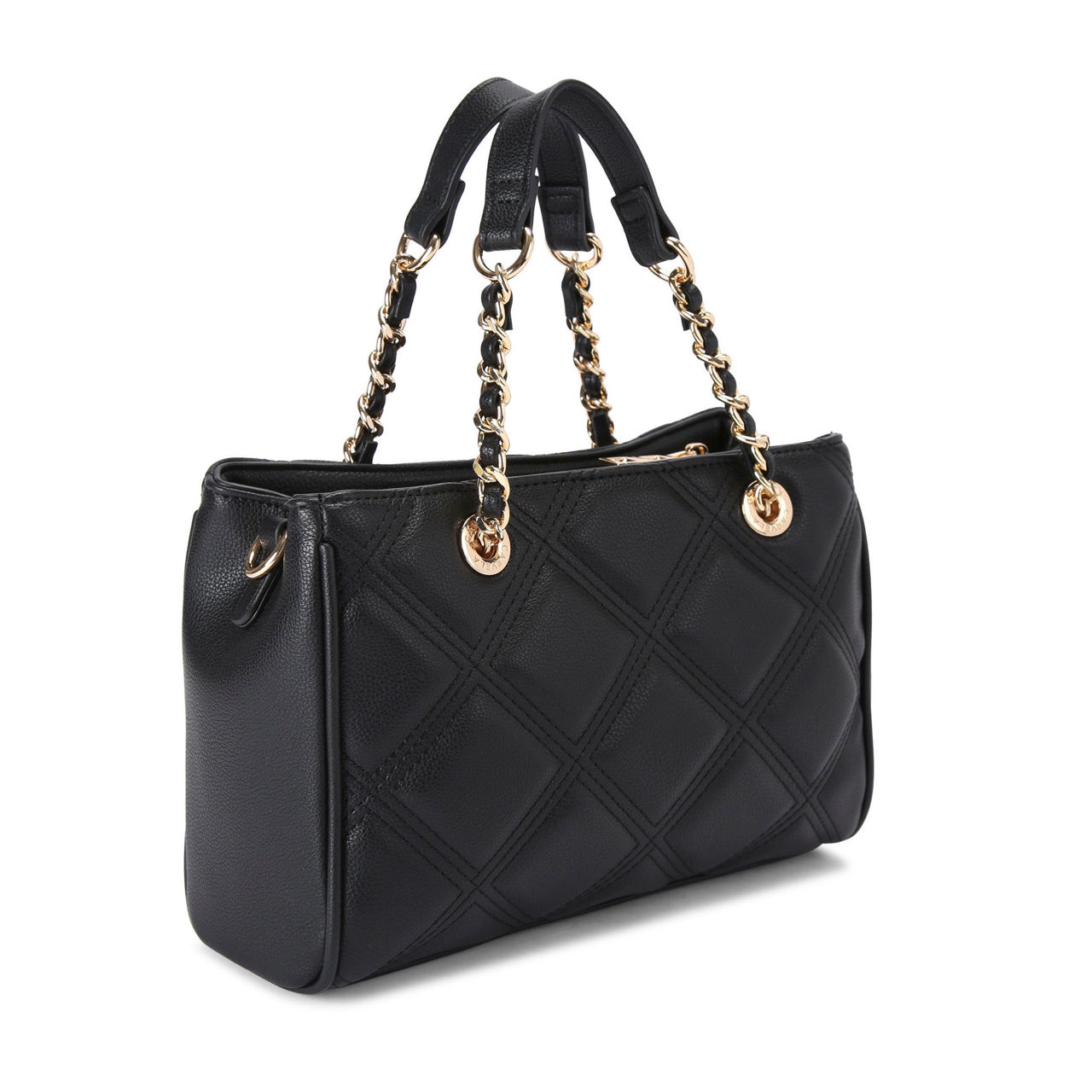 - Diamond quilted design, double top handles with chain detail, crossbody strap, gold-tone hardware, branding