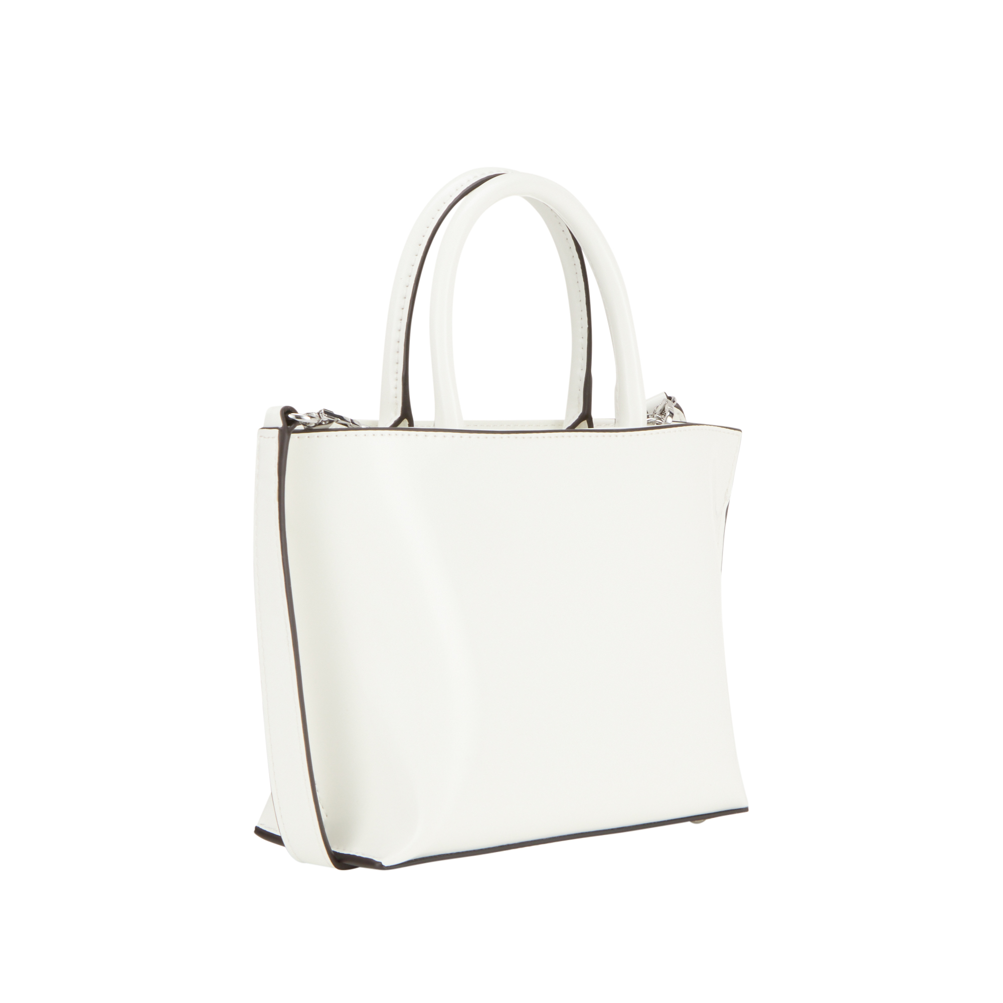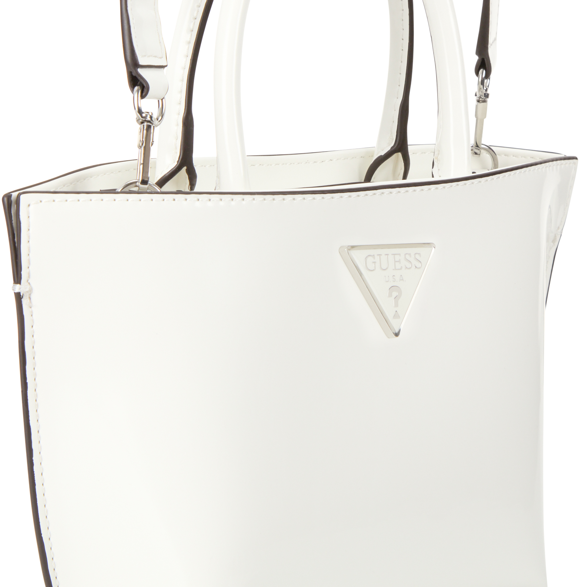 • Top carry handles, top zip fastening, detachable and adjustable crossbody strap, triangle logo hardware, silver-tone finishes, patent design