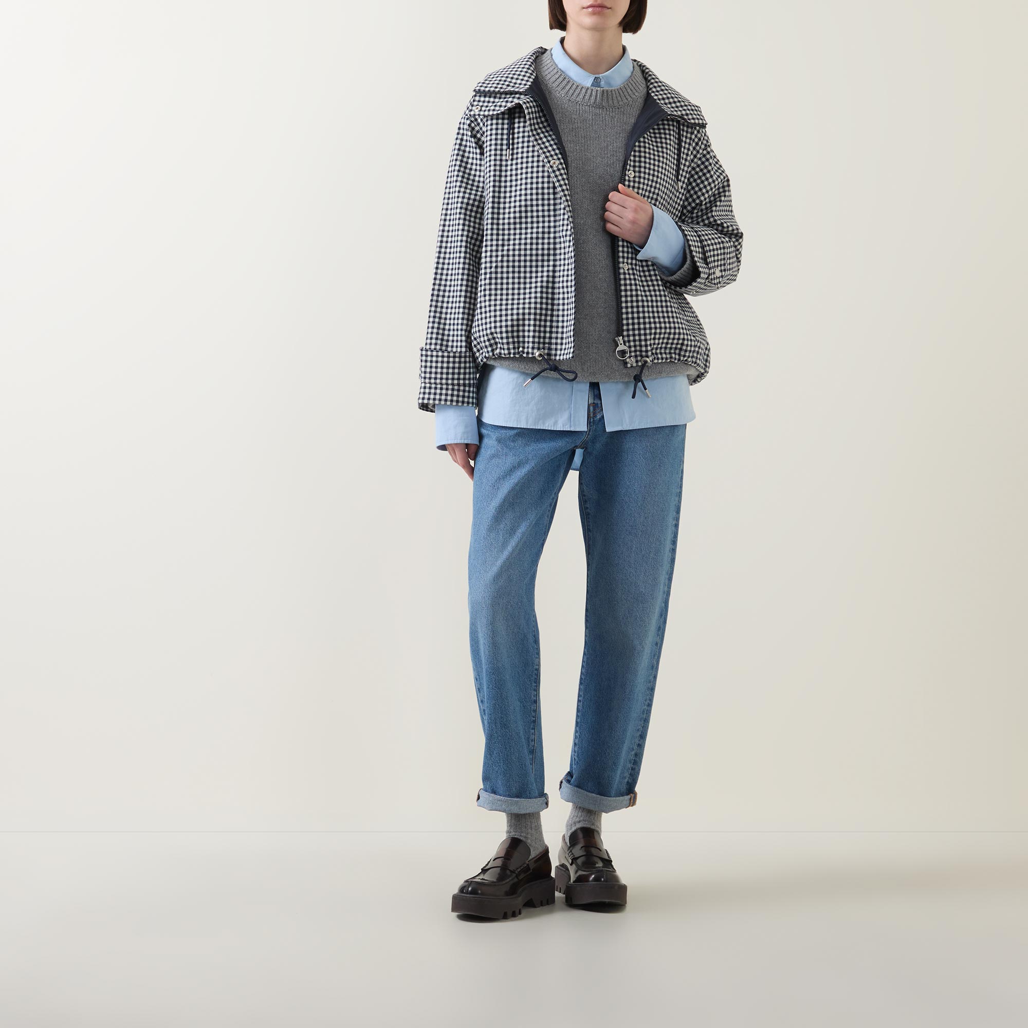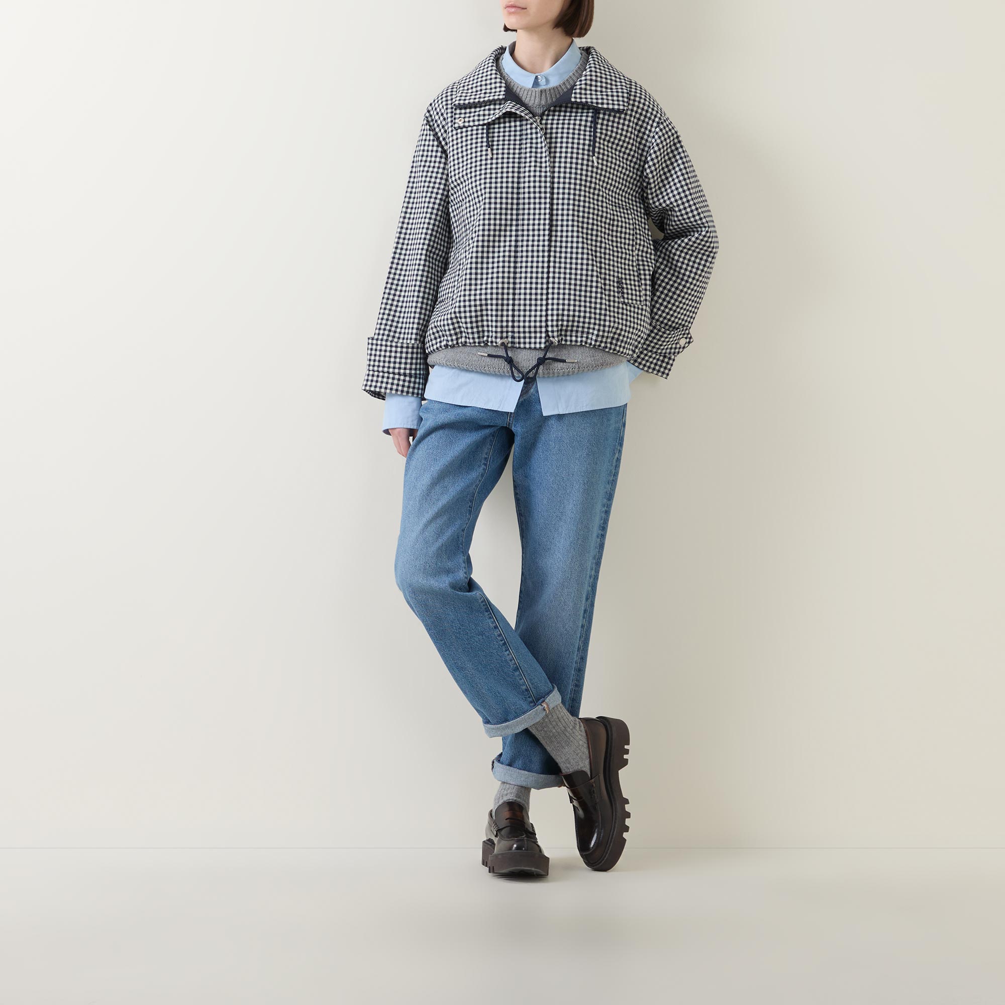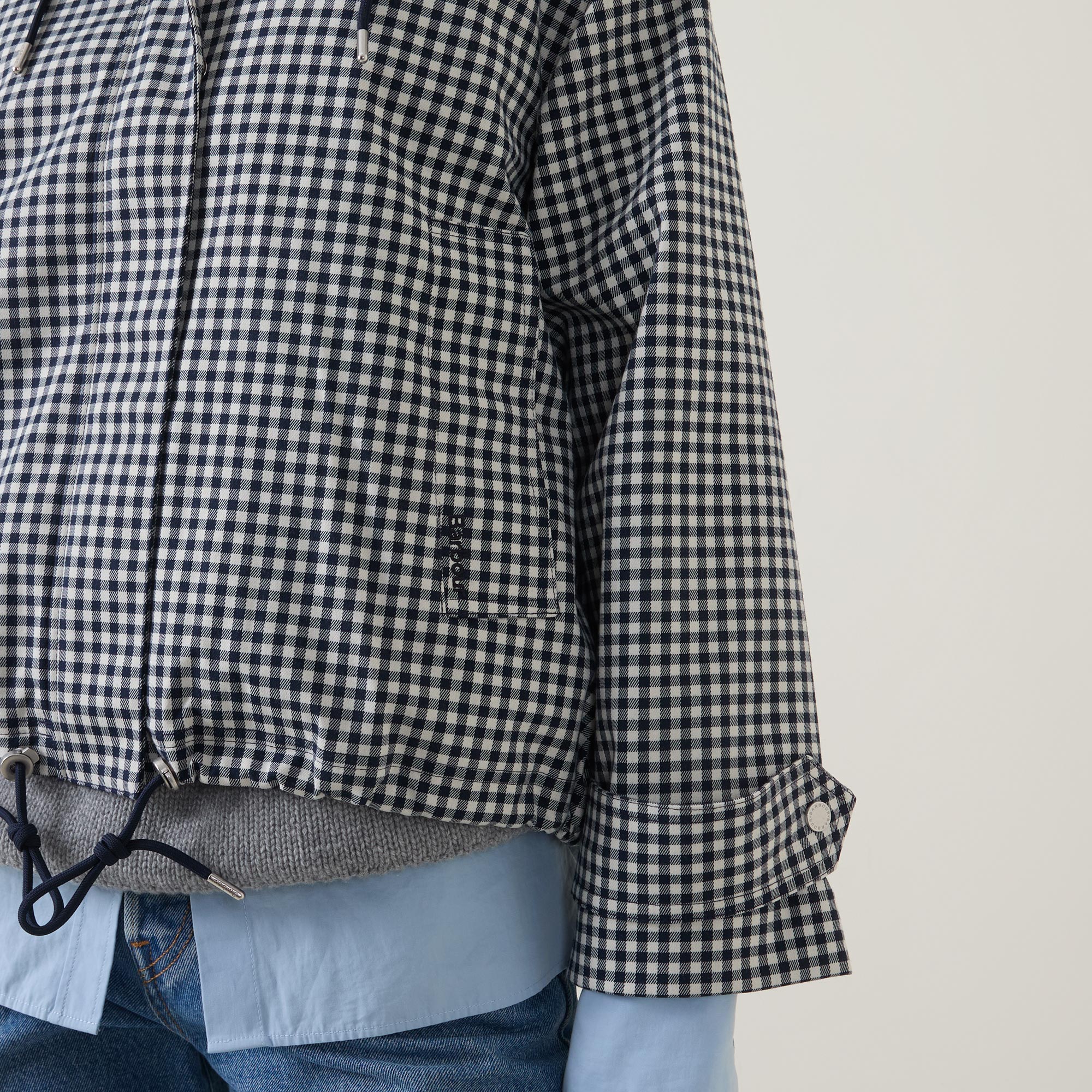 - Oversized funnel neck, adjustable drawstring fastening, dropped shoulders, long sleeves, tabbed cuffs, front zip closure, additional snap button placket, two front welt pockets, straight hem with adjustable drawcord, gingham print