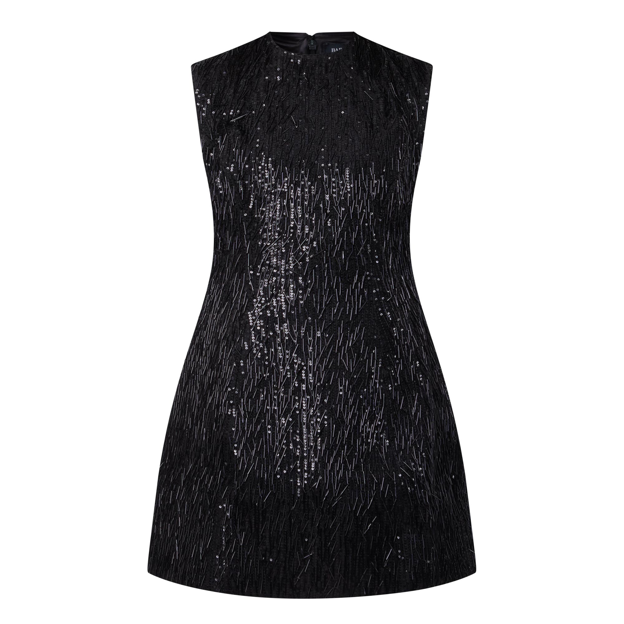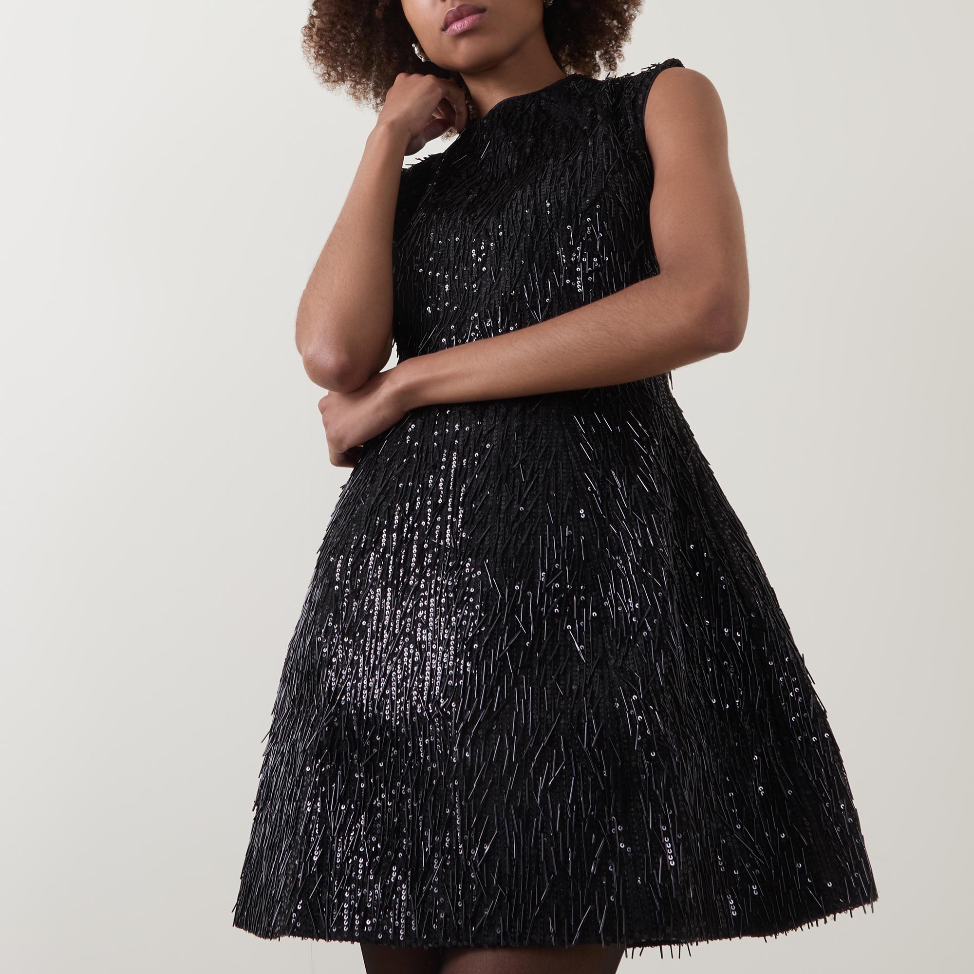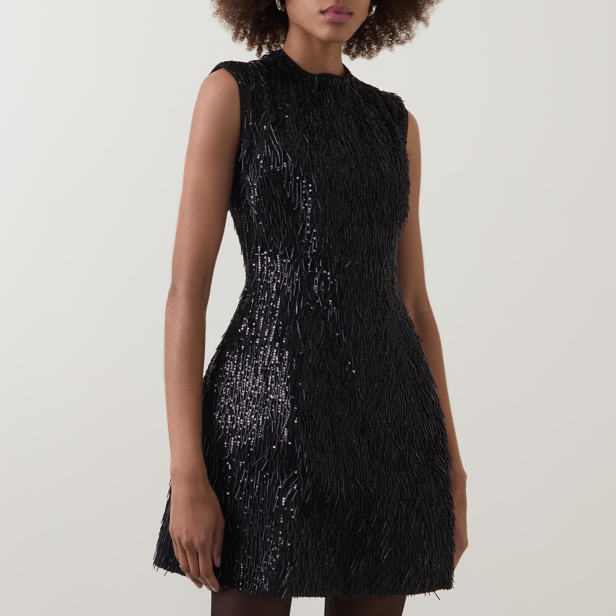 - High neckline, sleeveless design, rear zip fastening, hourglass silhouette, straight hem, embellished front with textured tassel detailing, mini length, lined