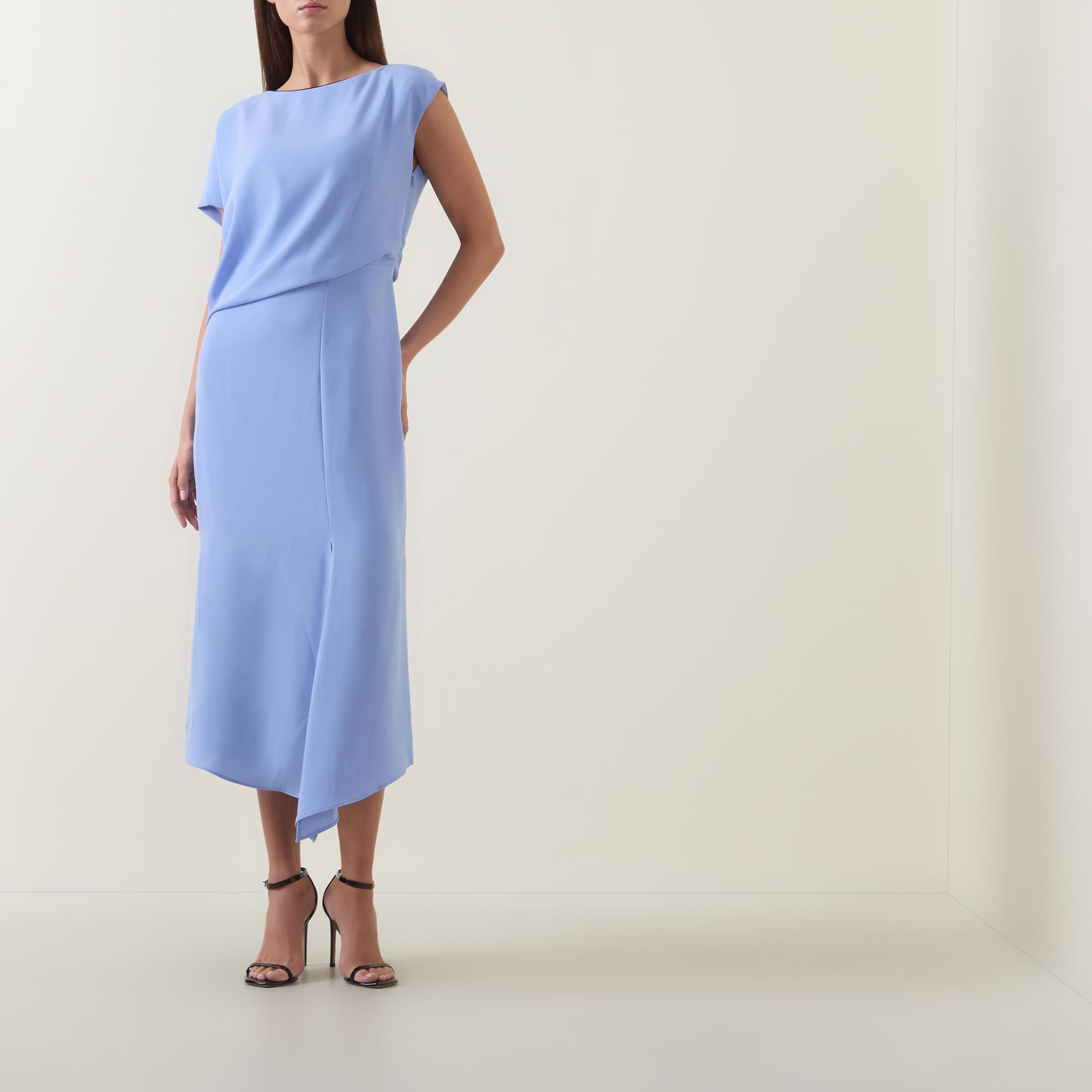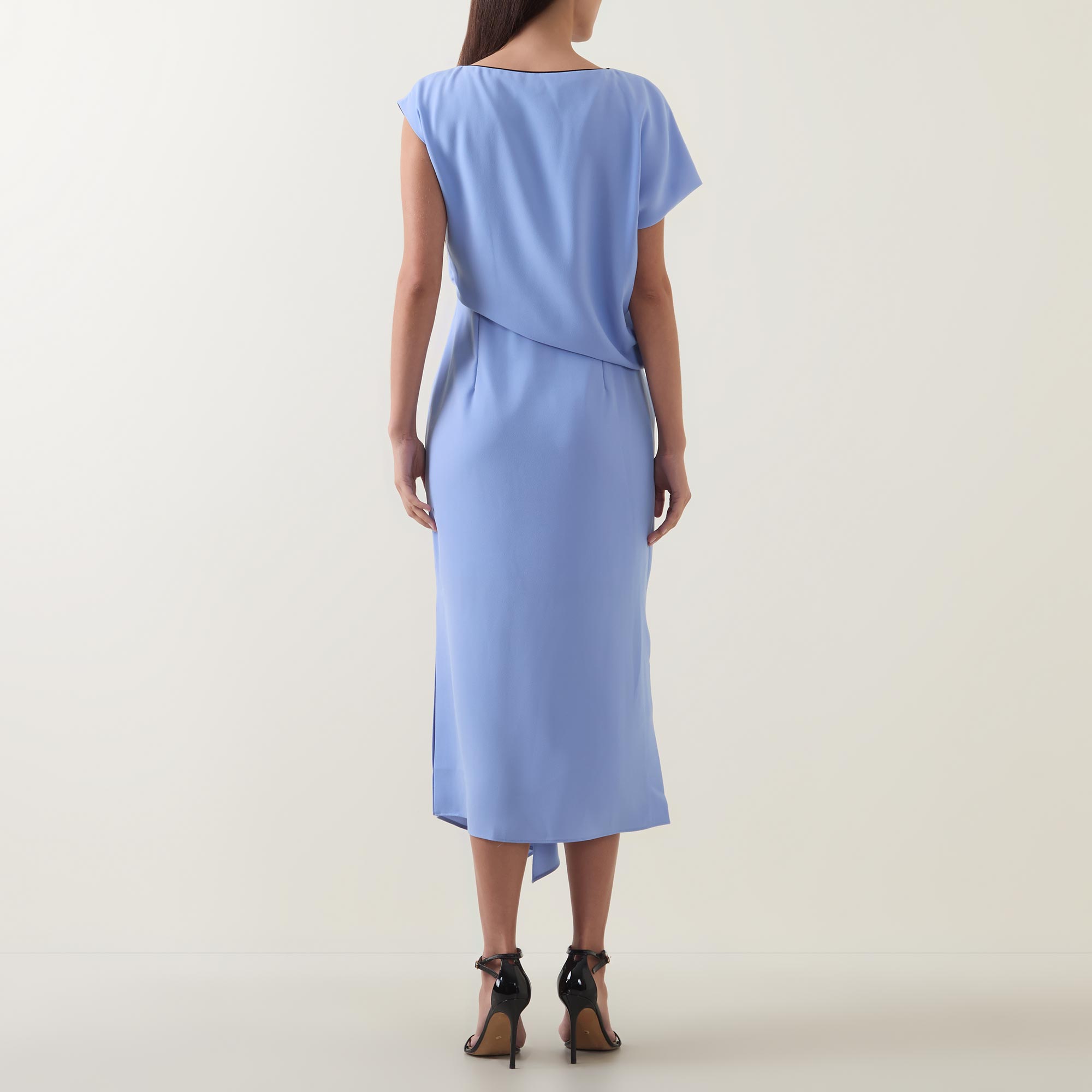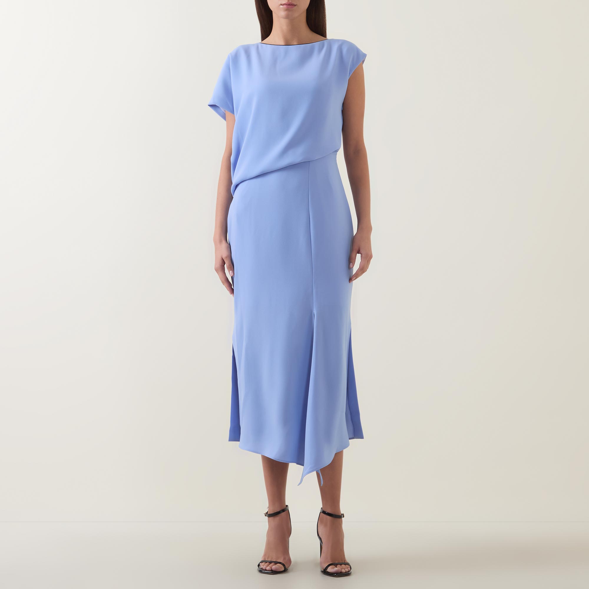 - Boat neckline, cap sleeves, draped bodice, fitted through the waist, flared skirt, asymmetric hem, side split, tonal stitching, smooth finish, midi length