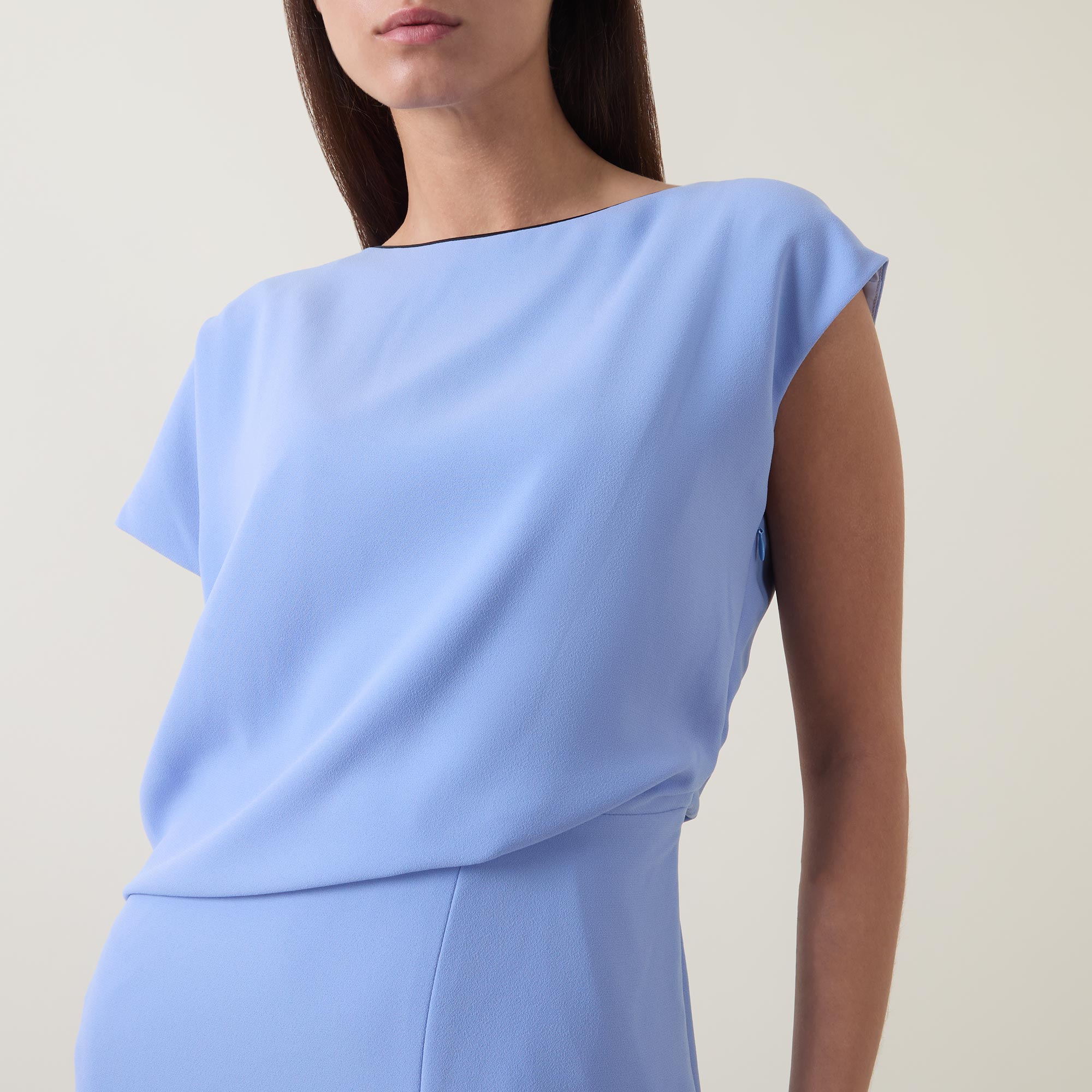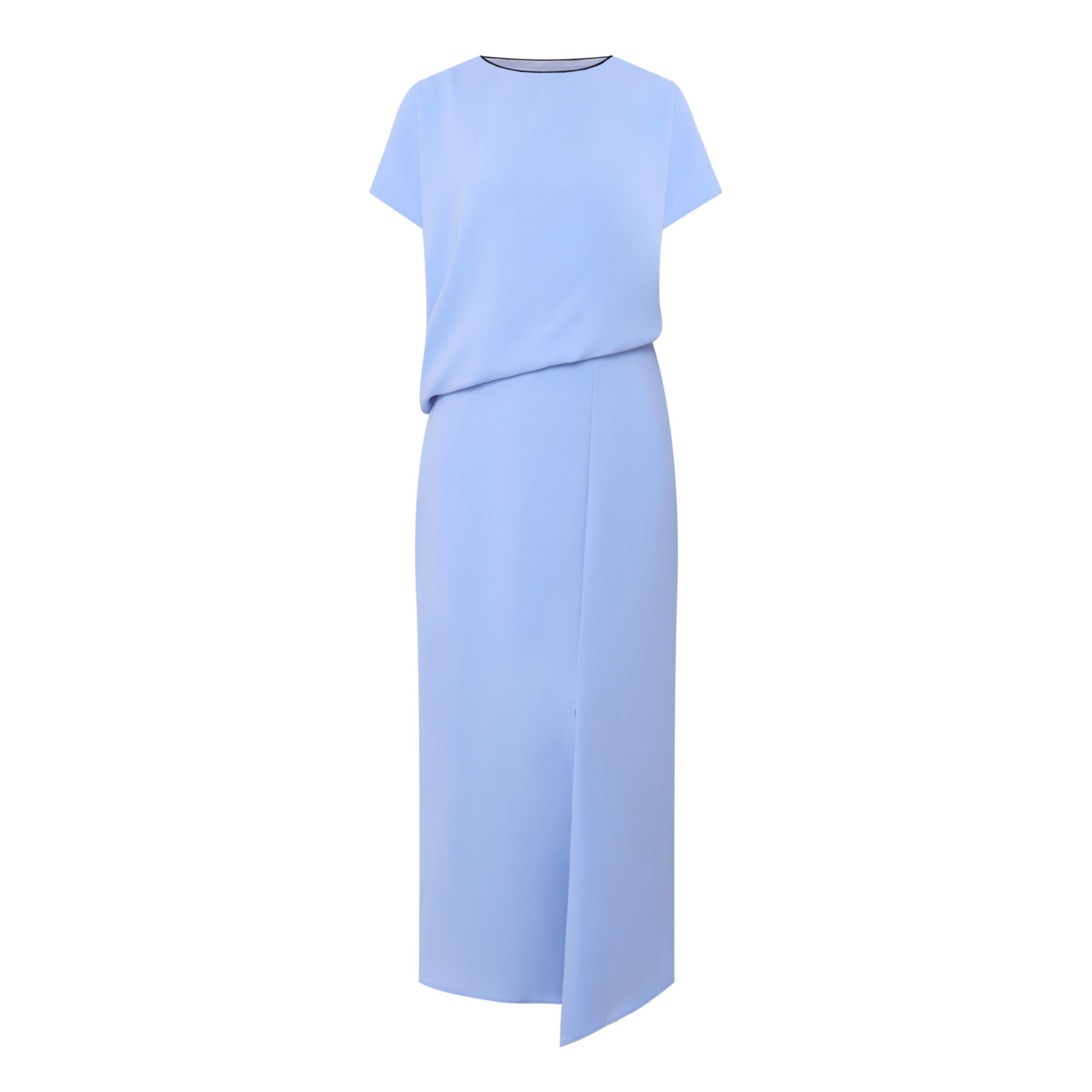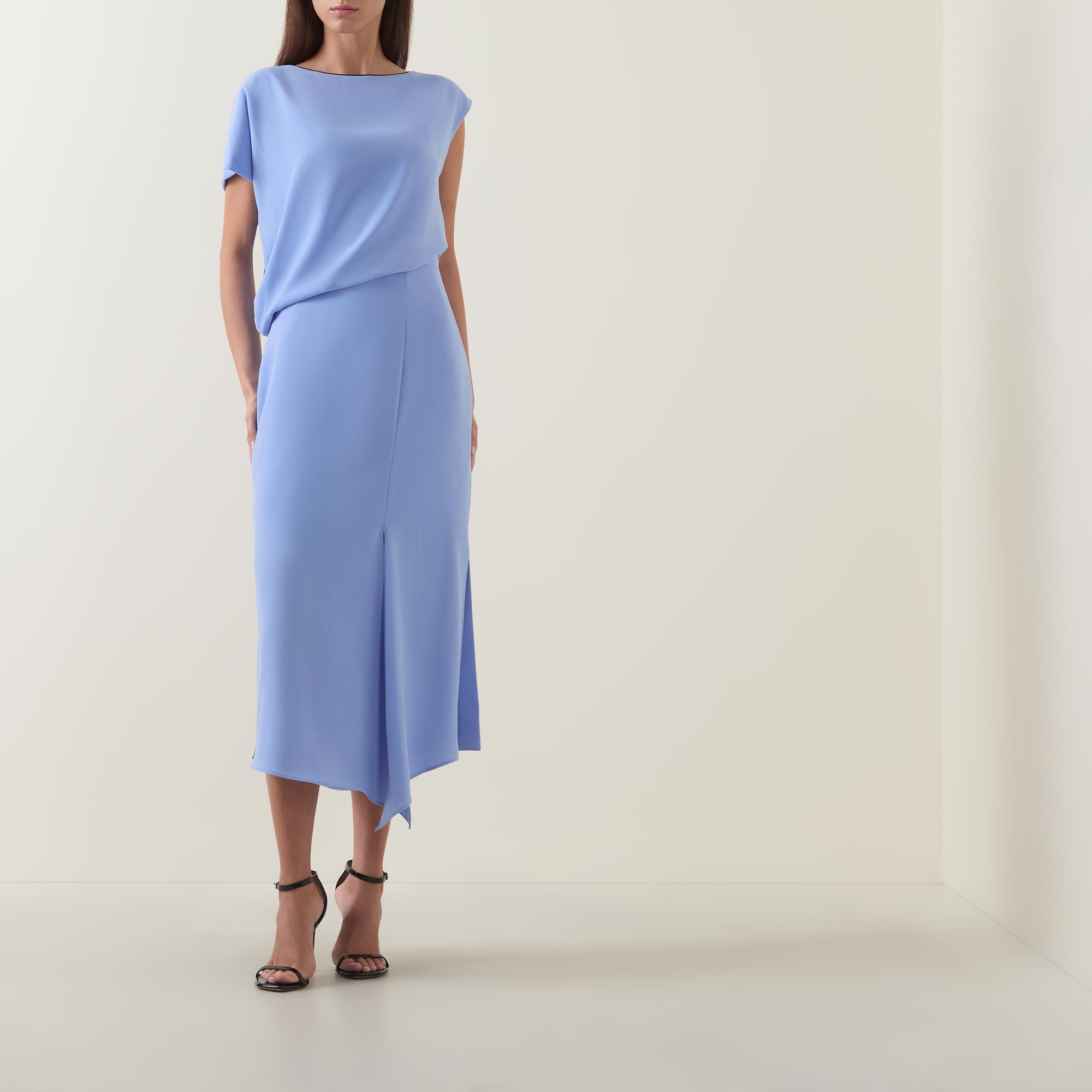 - Boat neckline, cap sleeves, draped bodice, fitted through the waist, flared skirt, asymmetric hem, side split, tonal stitching, smooth finish, midi length