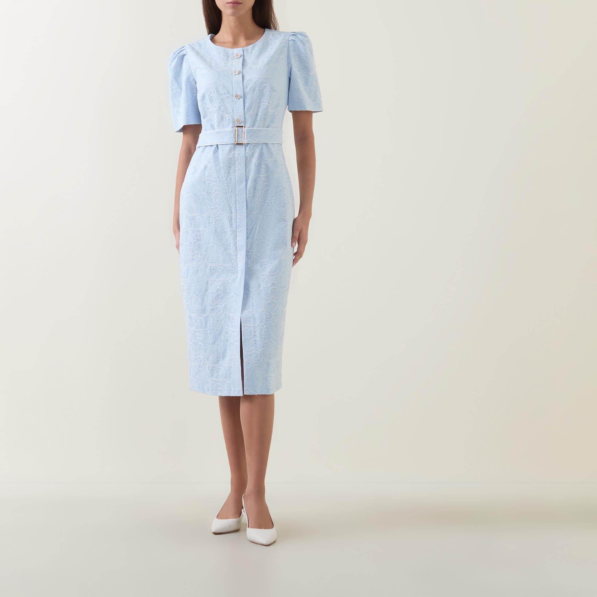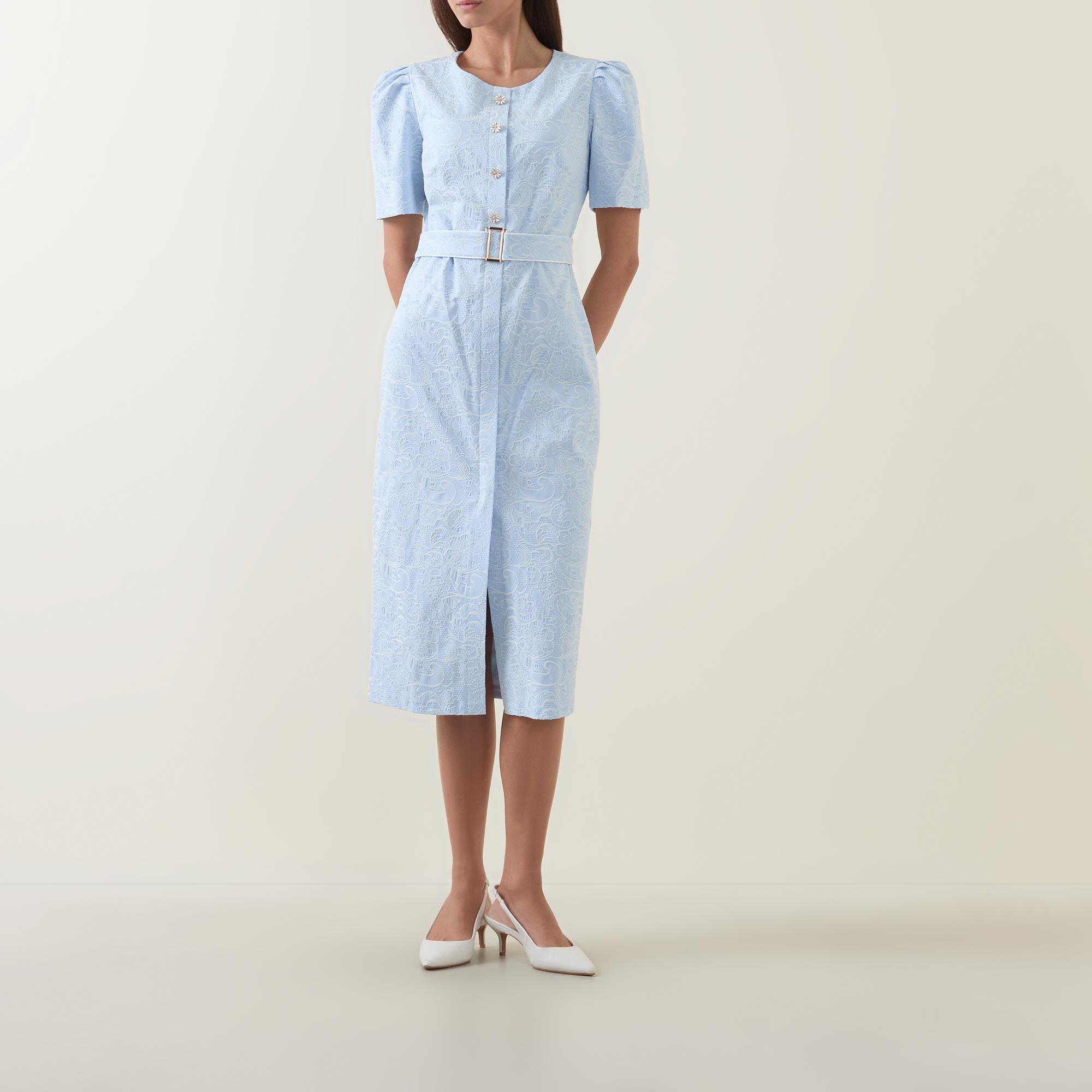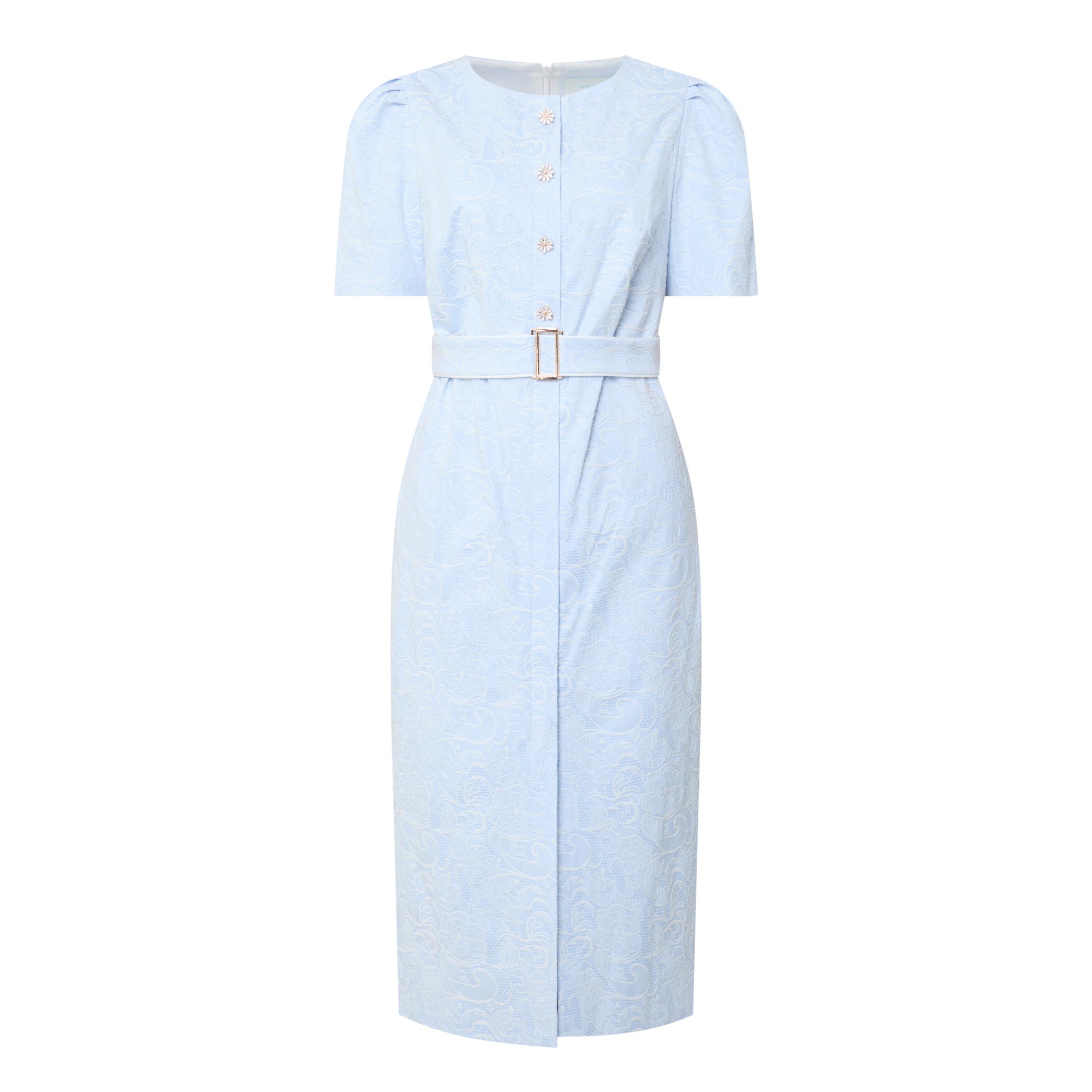 - Round neckline, puff shoulders, short sleeves, front statement button fastening, matching belt, rear concealed zip fastening, fitted through the waist and hips, darting throughout, straight hem, floral jacquard design, midi length