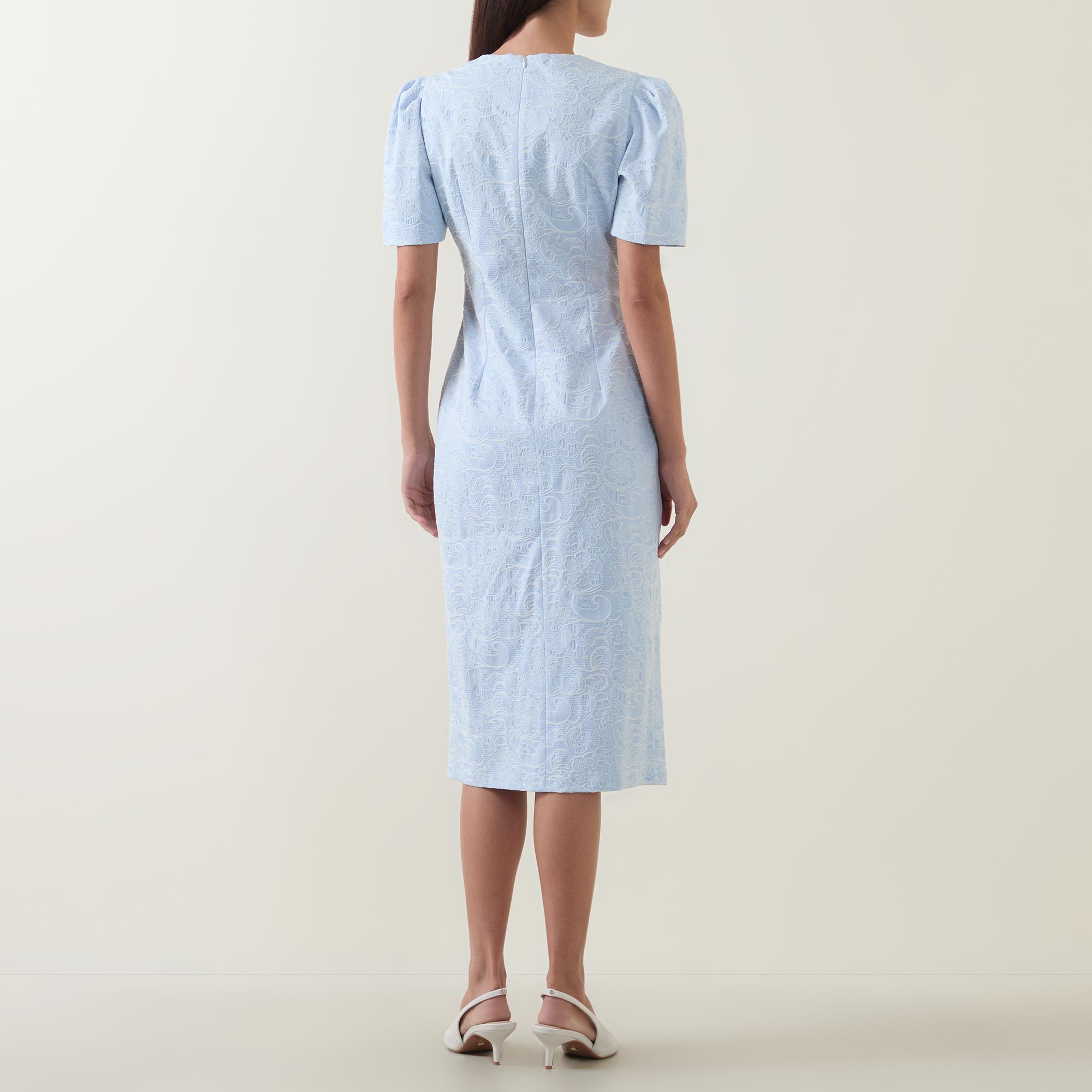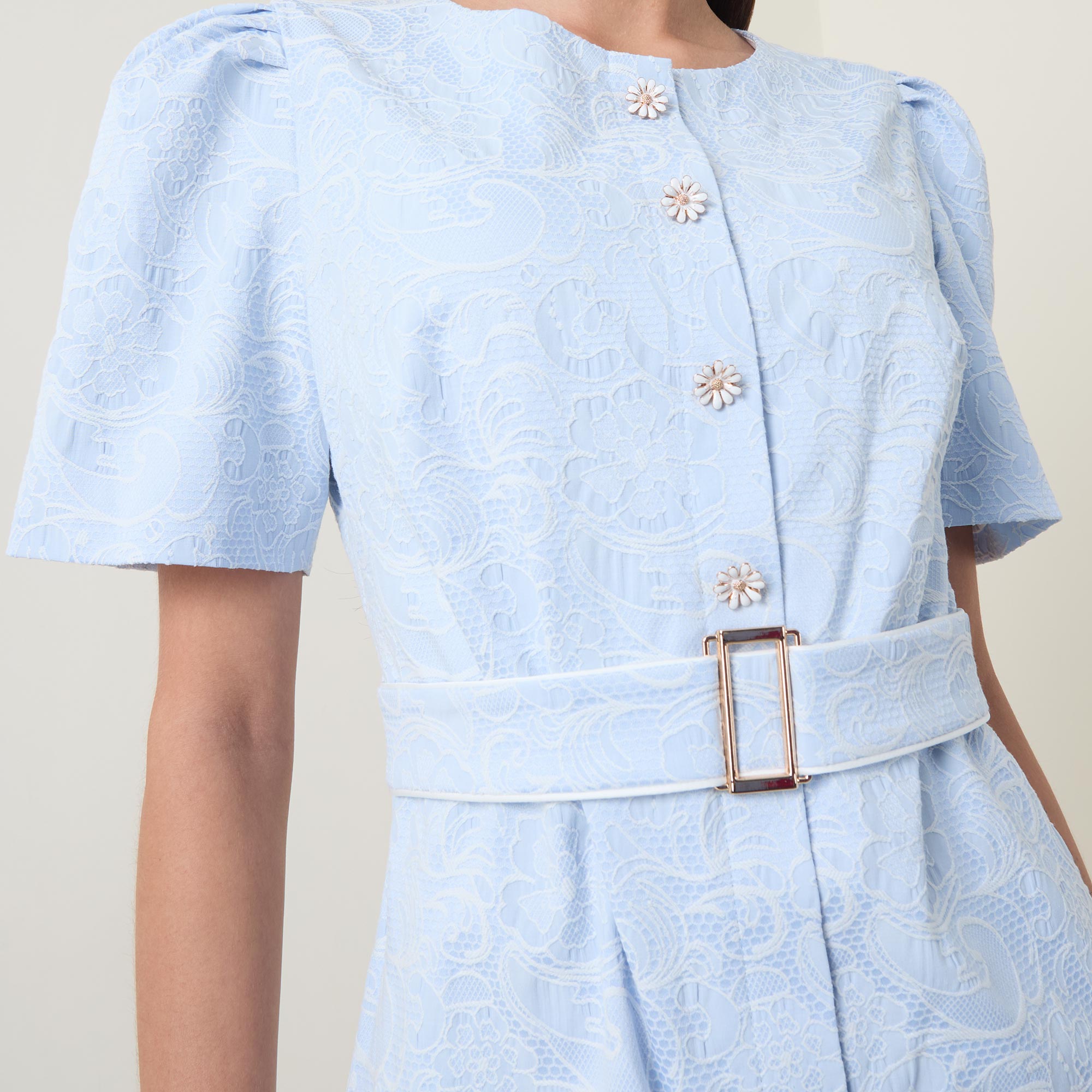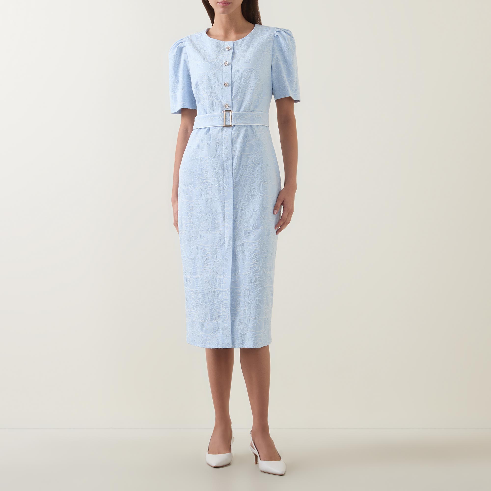 - Round neckline, puff shoulders, short sleeves, front statement button fastening, matching belt, rear concealed zip fastening, fitted through the waist and hips, darting throughout, straight hem, floral jacquard design, midi length