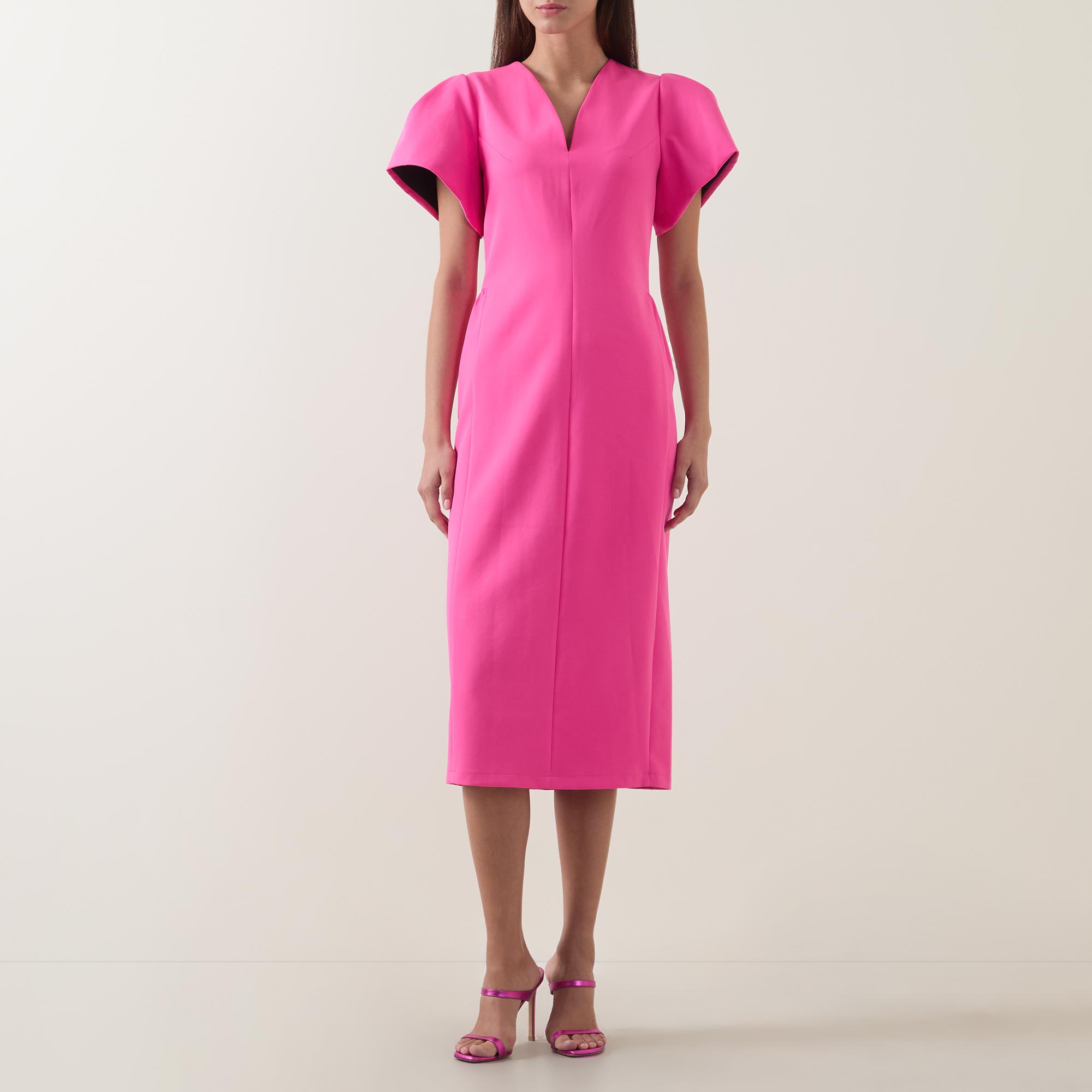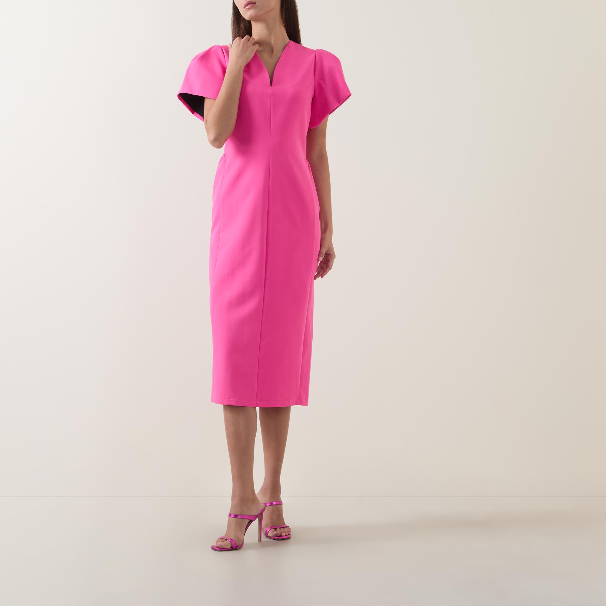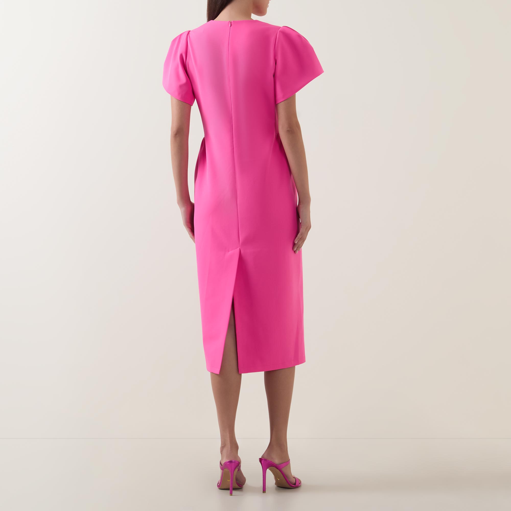 - V-neckline, short puff sleeves, concealed rear zip fastening, darting throughout, straight hem, rear vent, tonal stitching, smooth finish, midi length