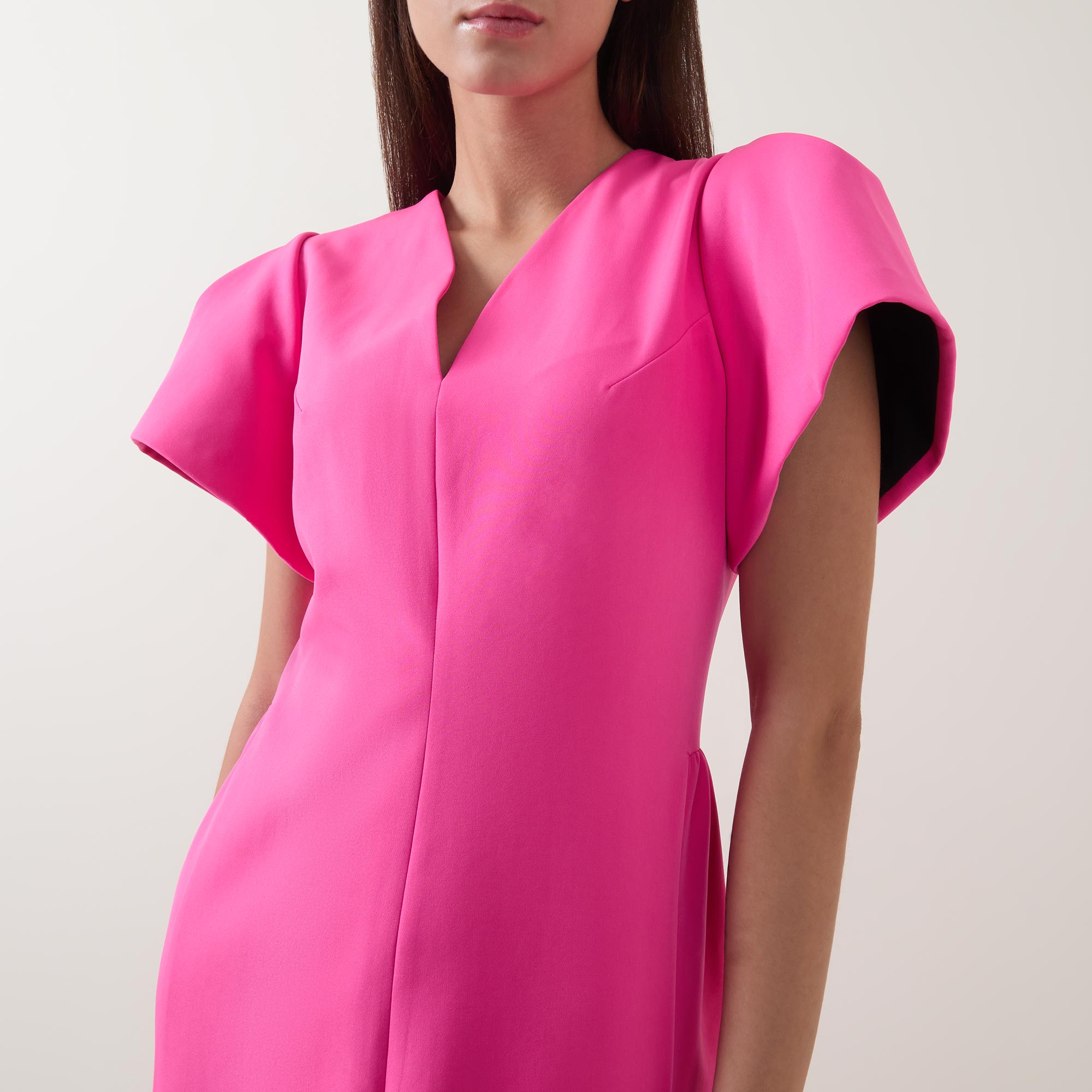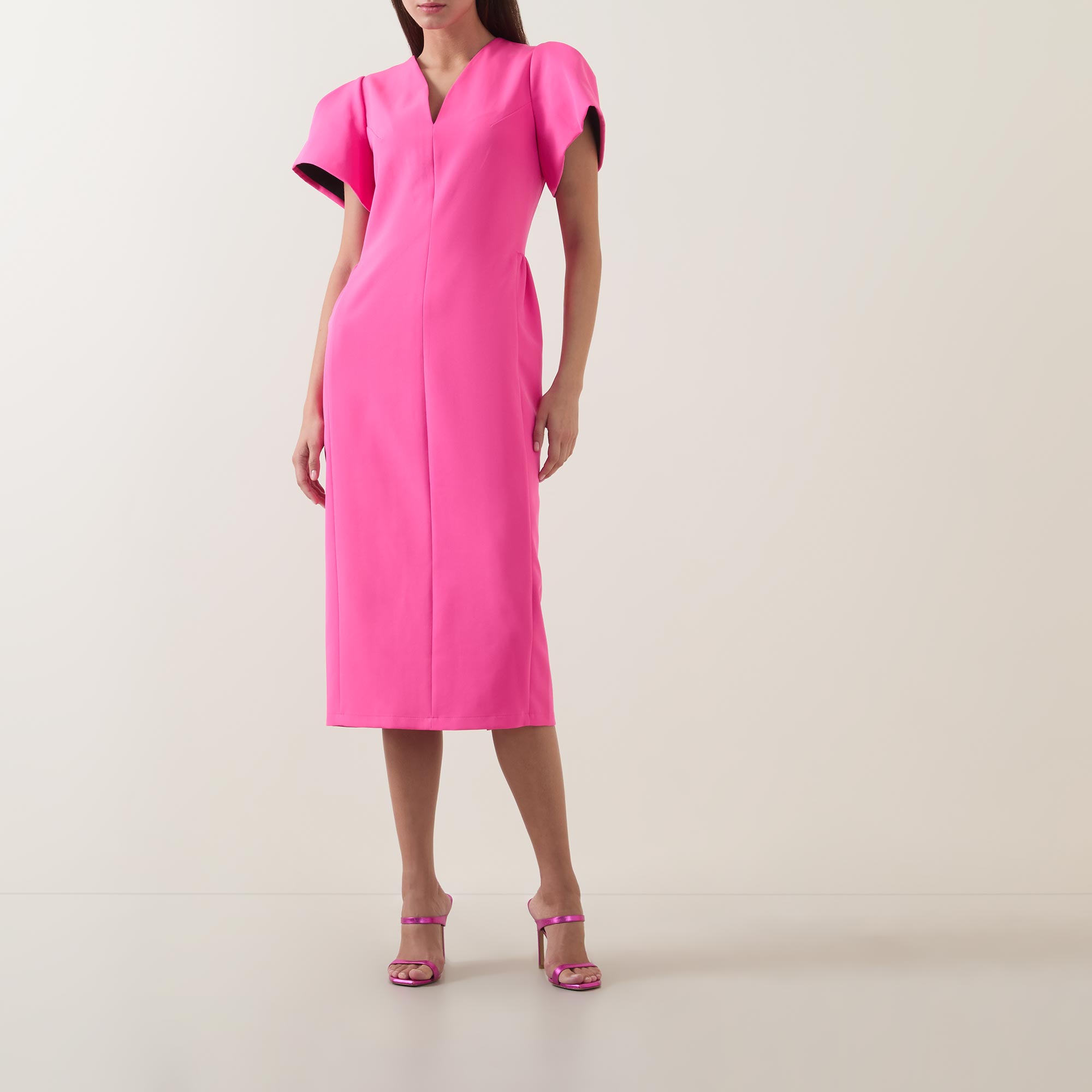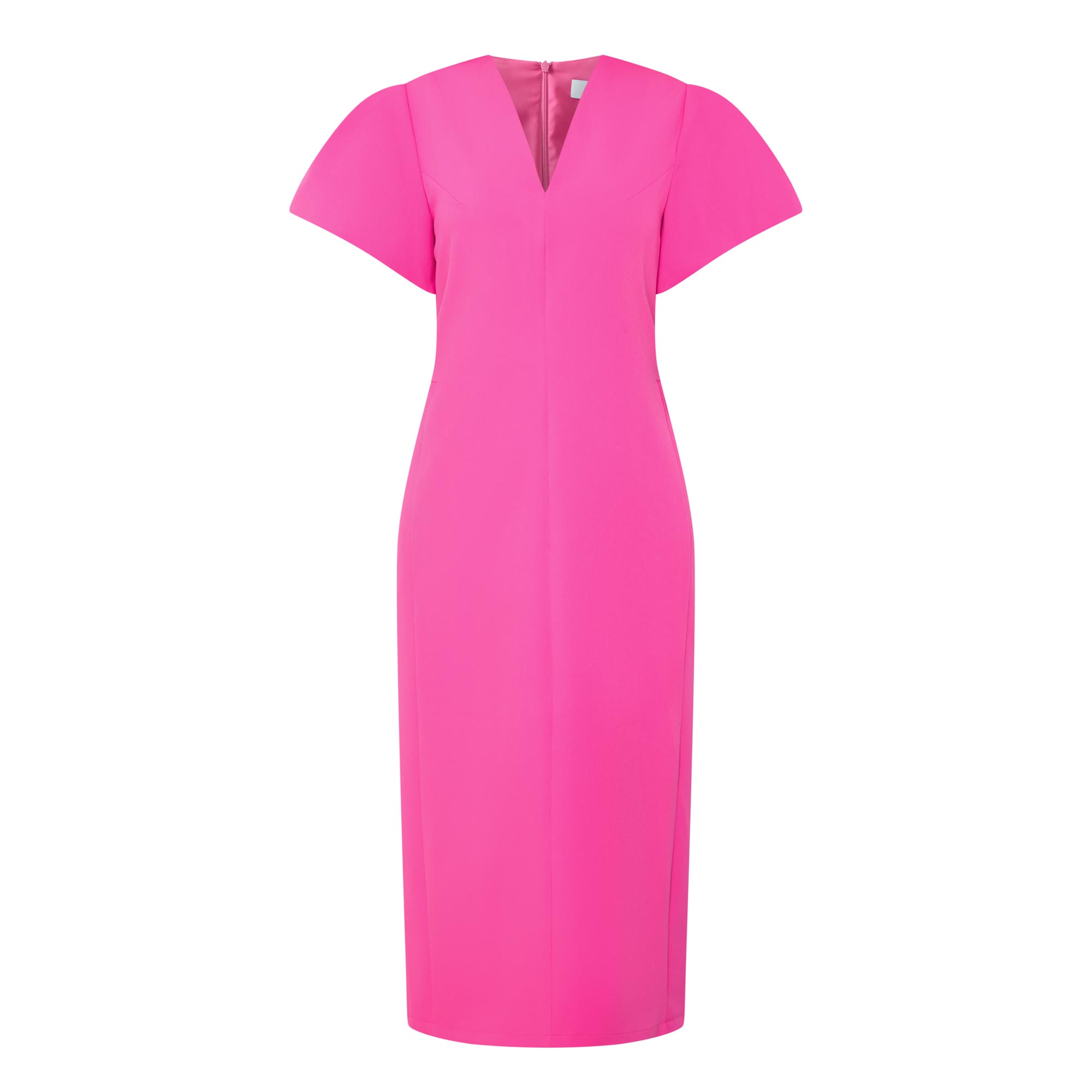 - V-neckline, short puff sleeves, concealed rear zip fastening, darting throughout, straight hem, rear vent, tonal stitching, smooth finish, midi length