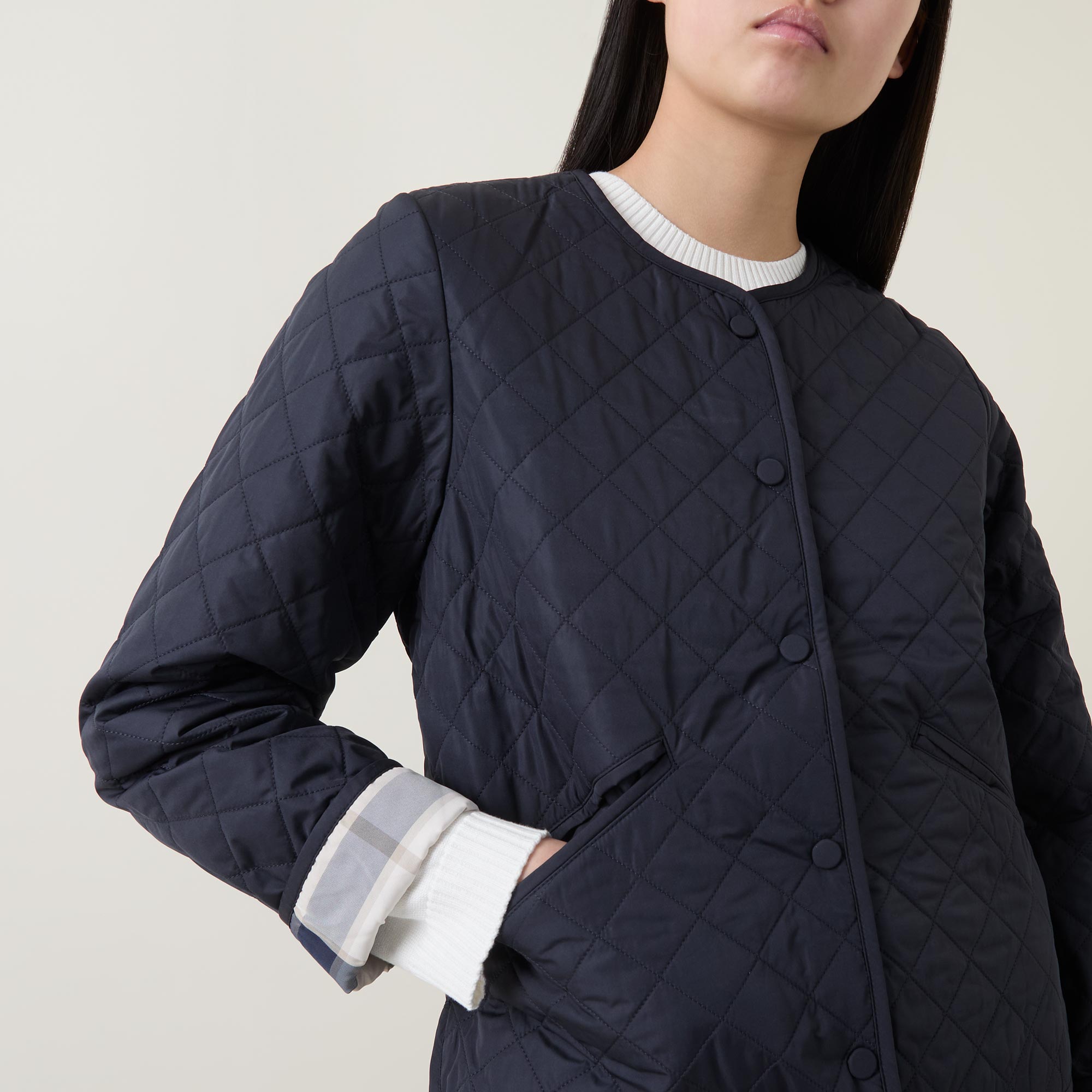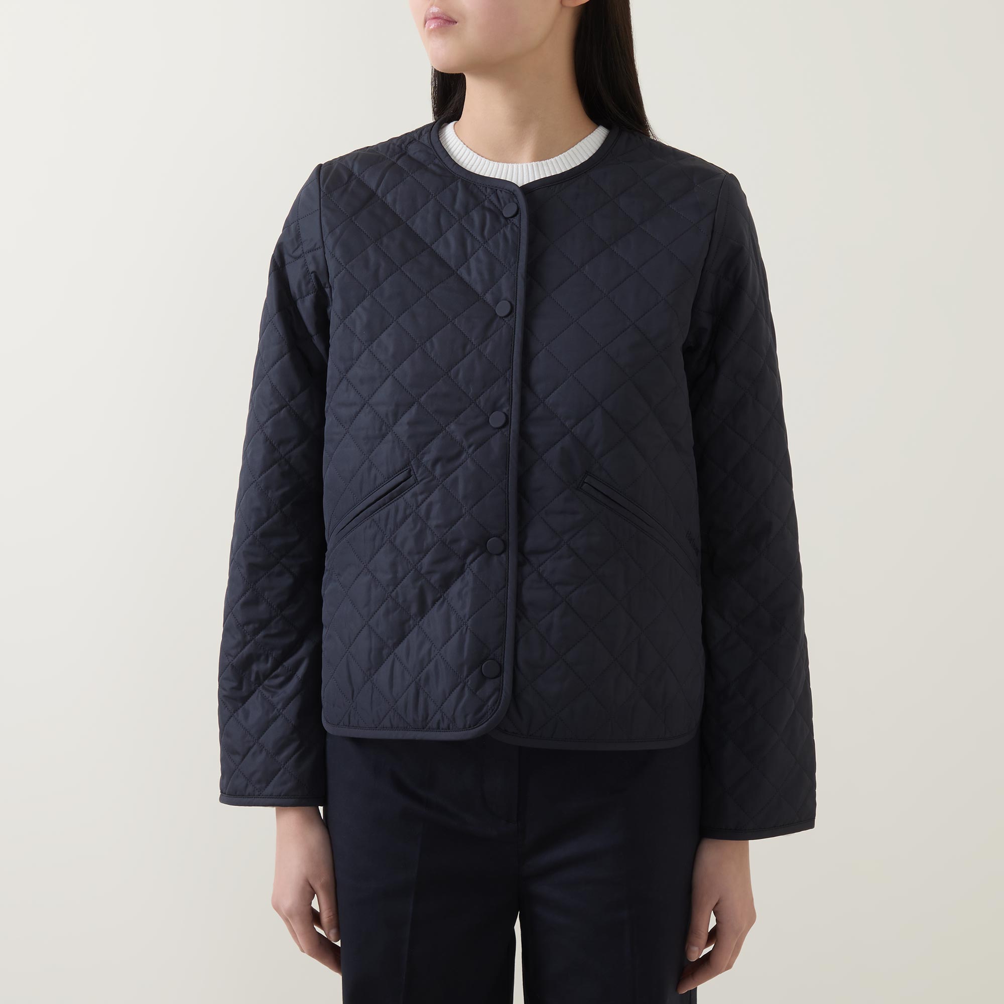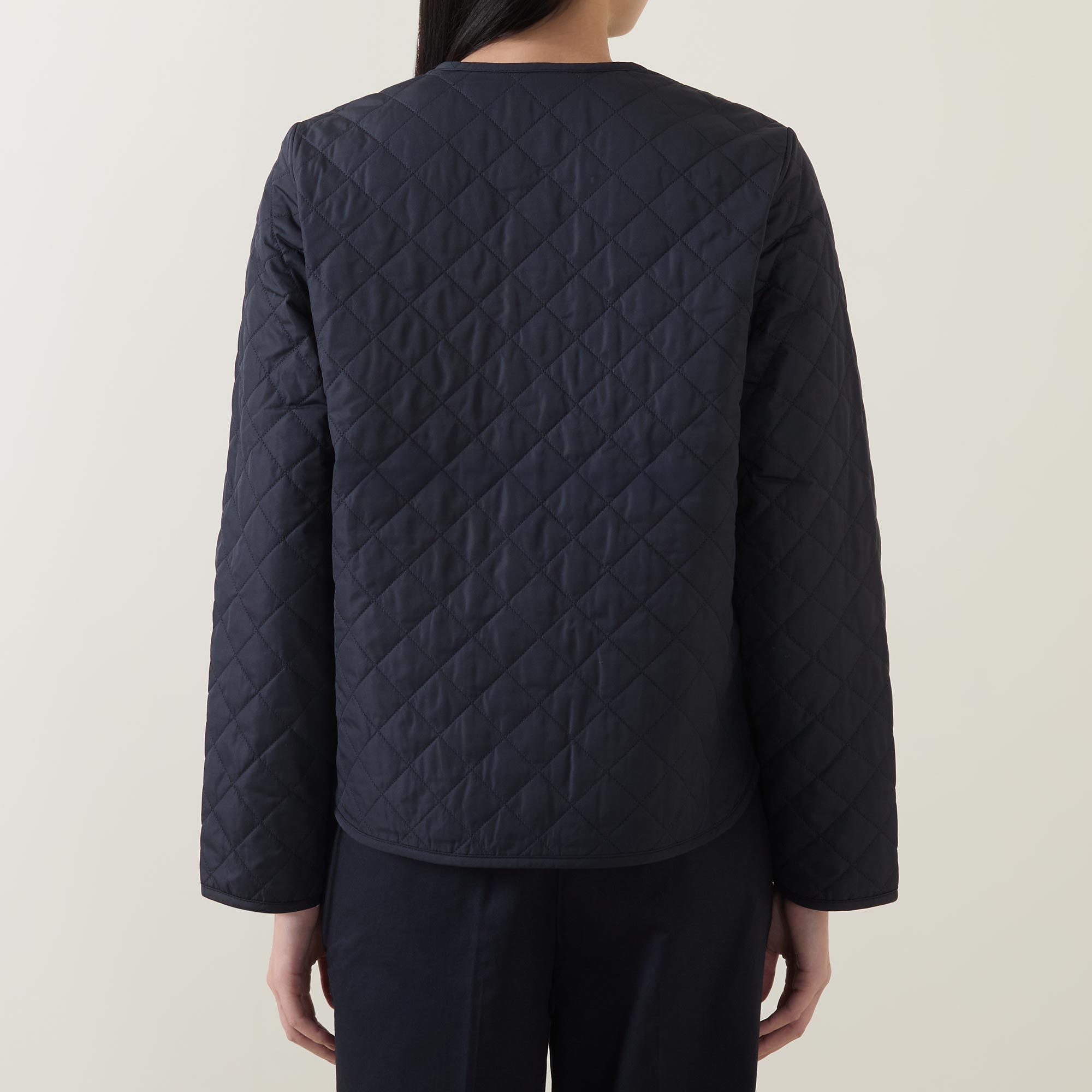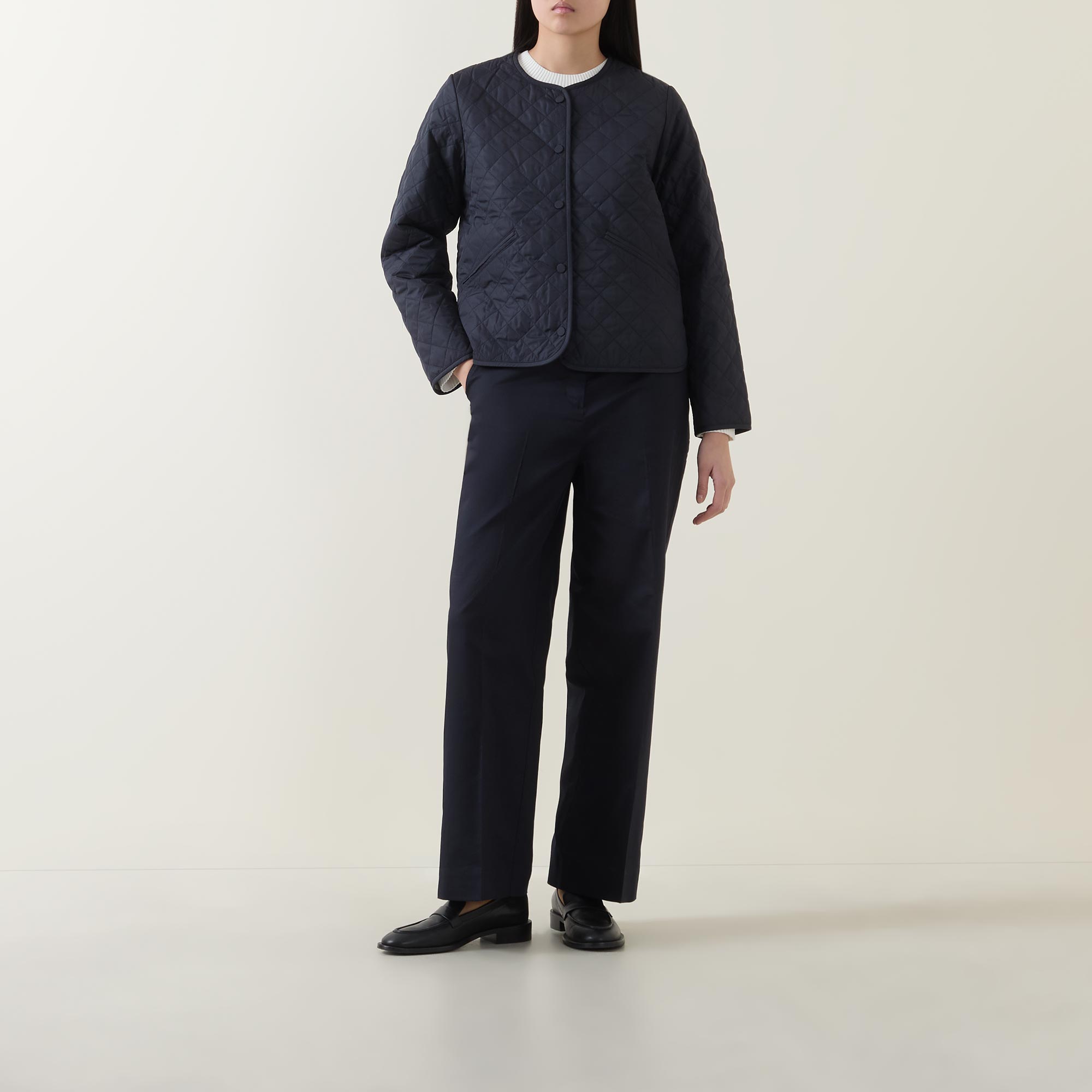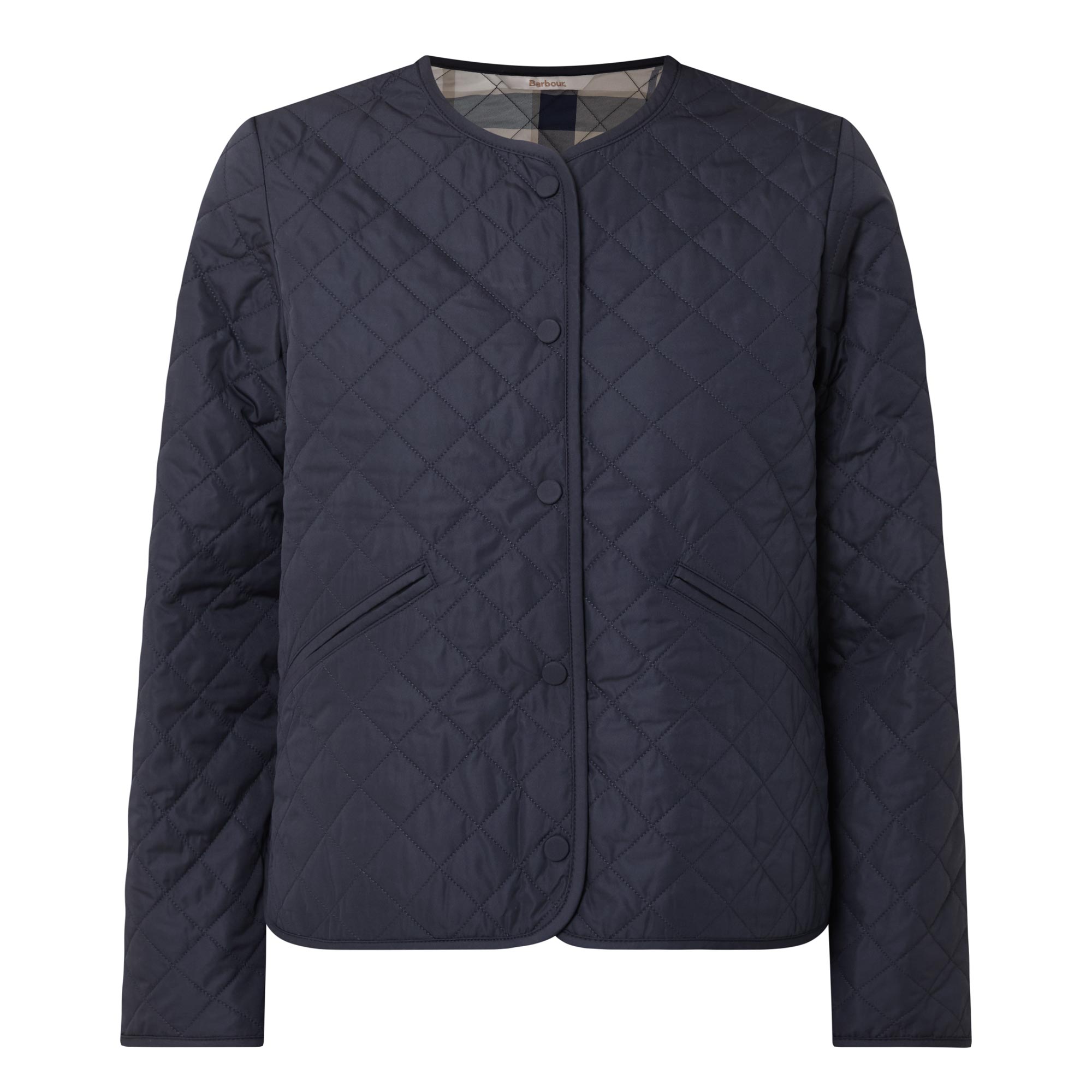 • Collarless, box quilting, lightweight, versatile layer perfect for transitional weather, seasonal tartan interior, self-covered stud front fastenings, double jet pockets, self-binding trims, long sleeves