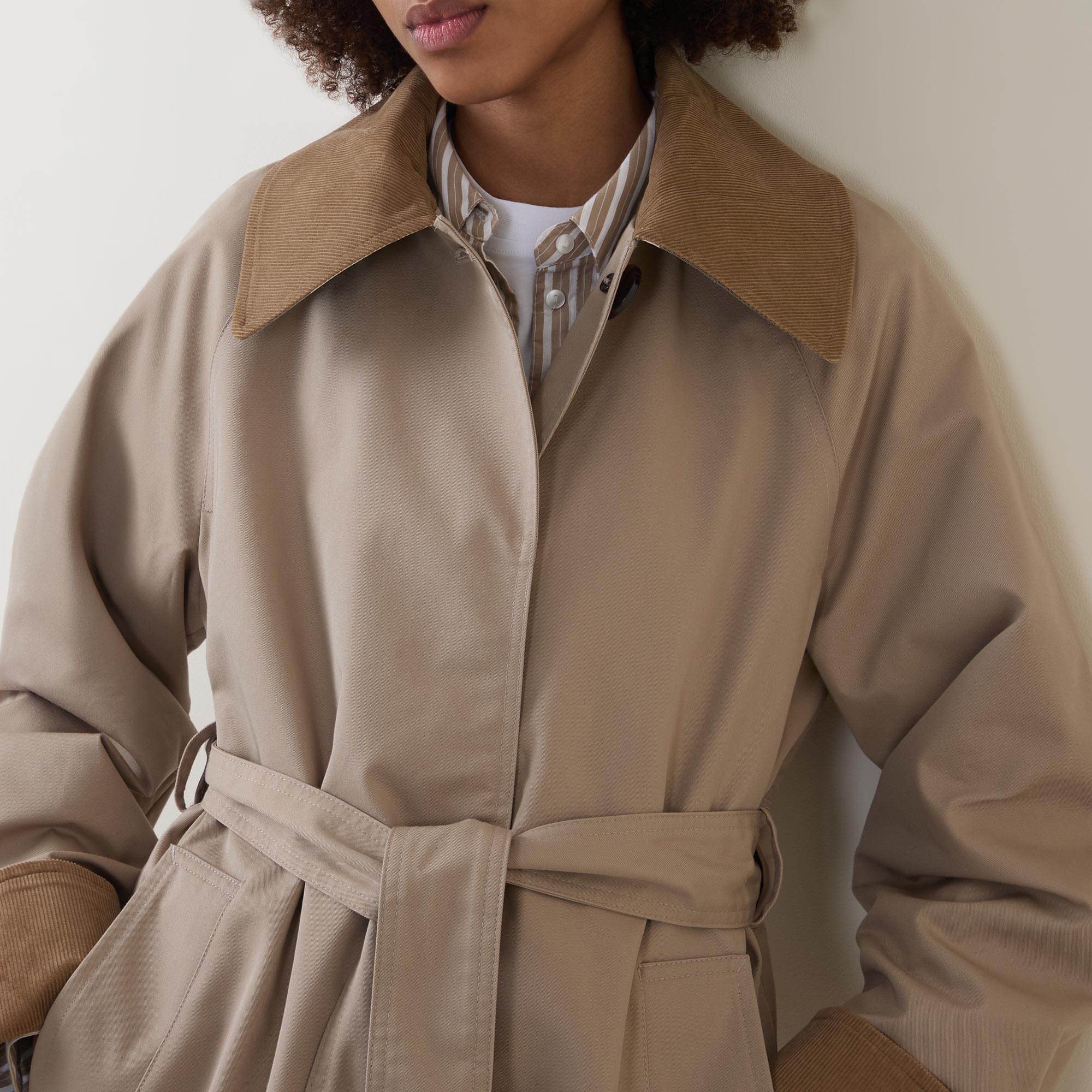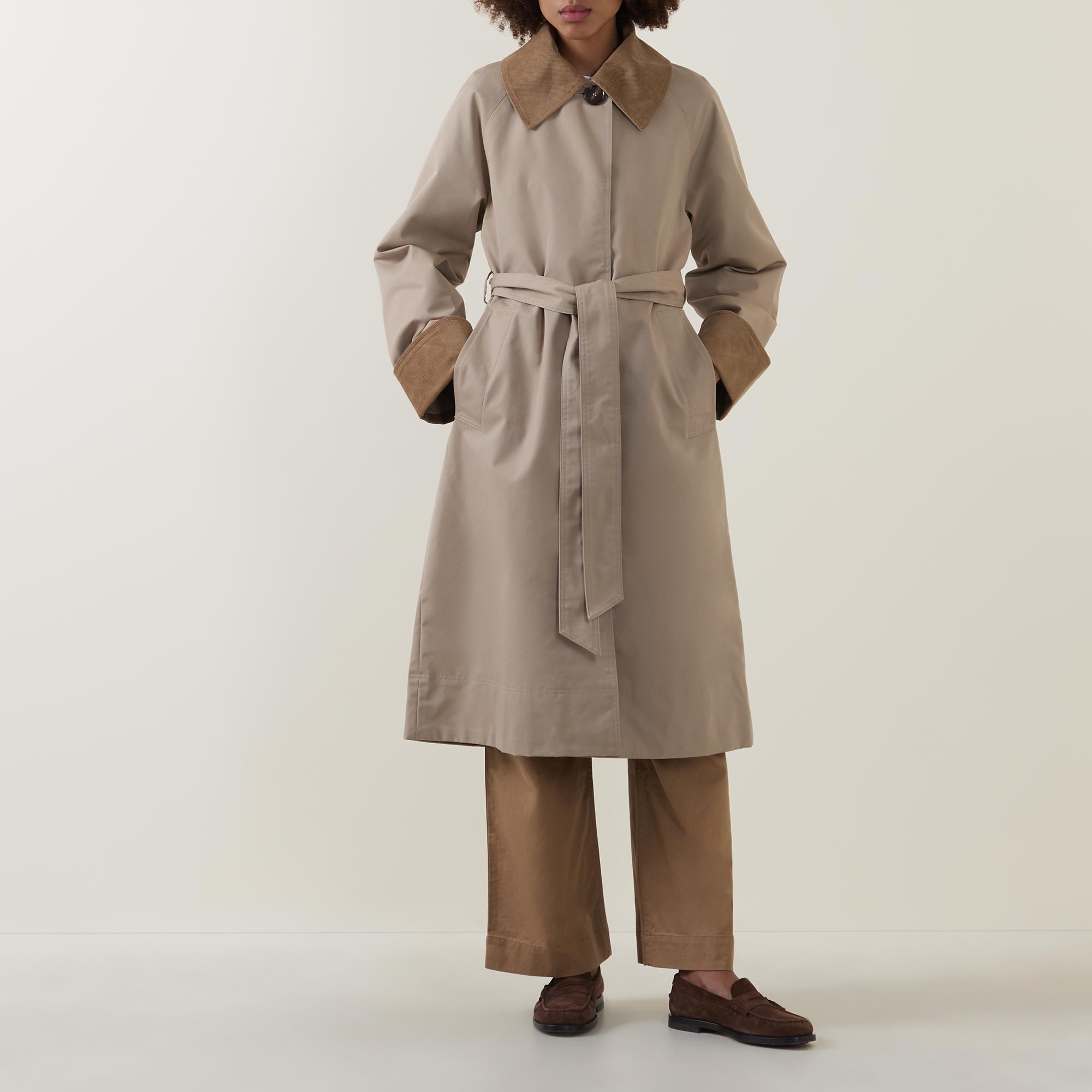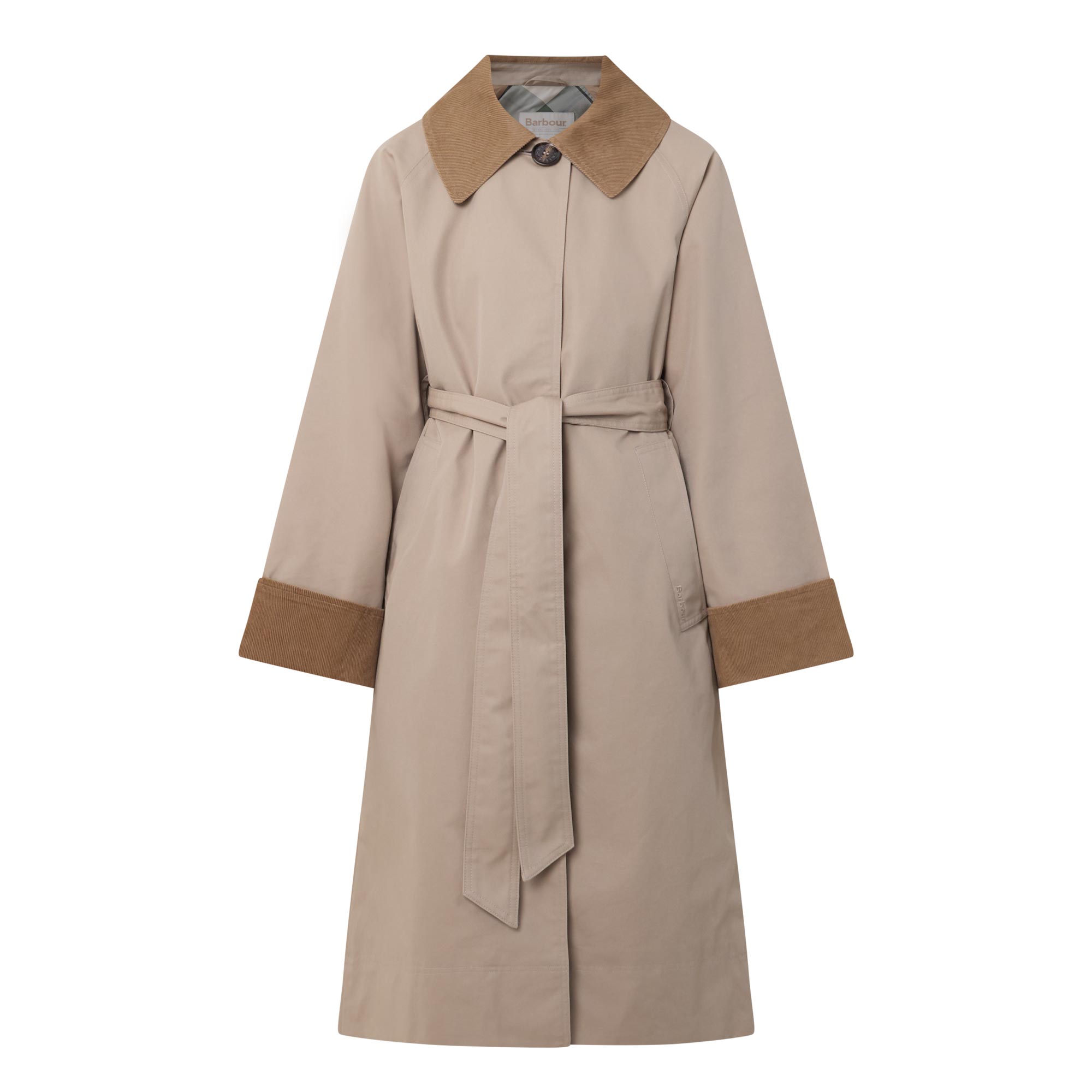 - Showerproof design, long sleeves, pointed collar, button fastenings, self-tying belt