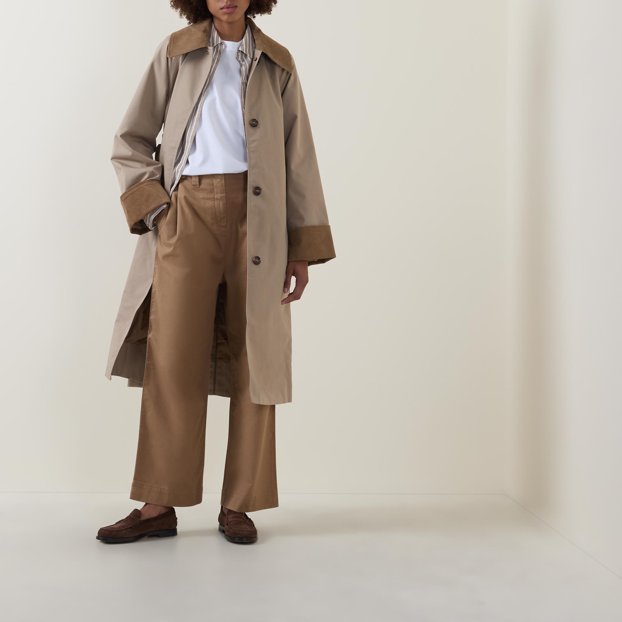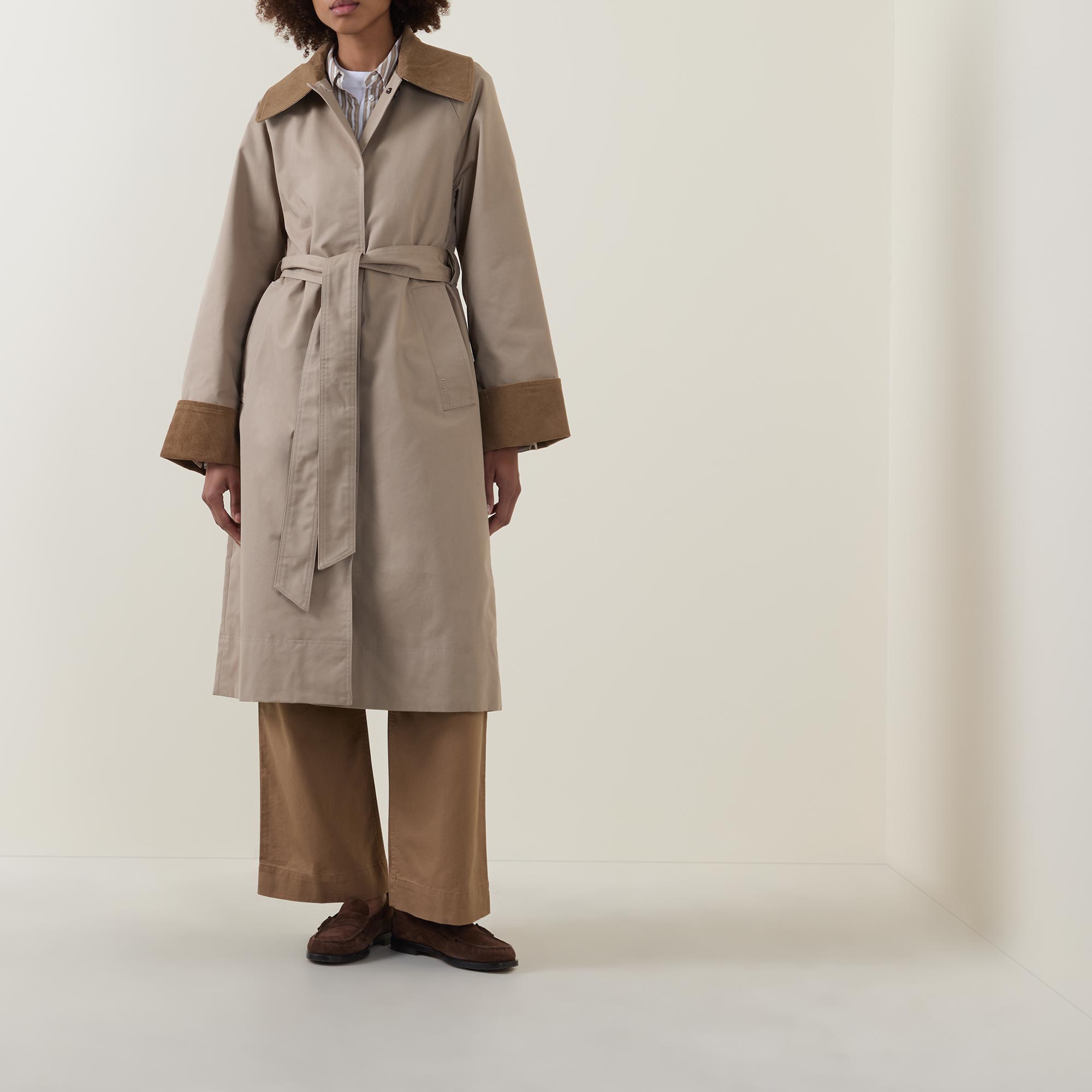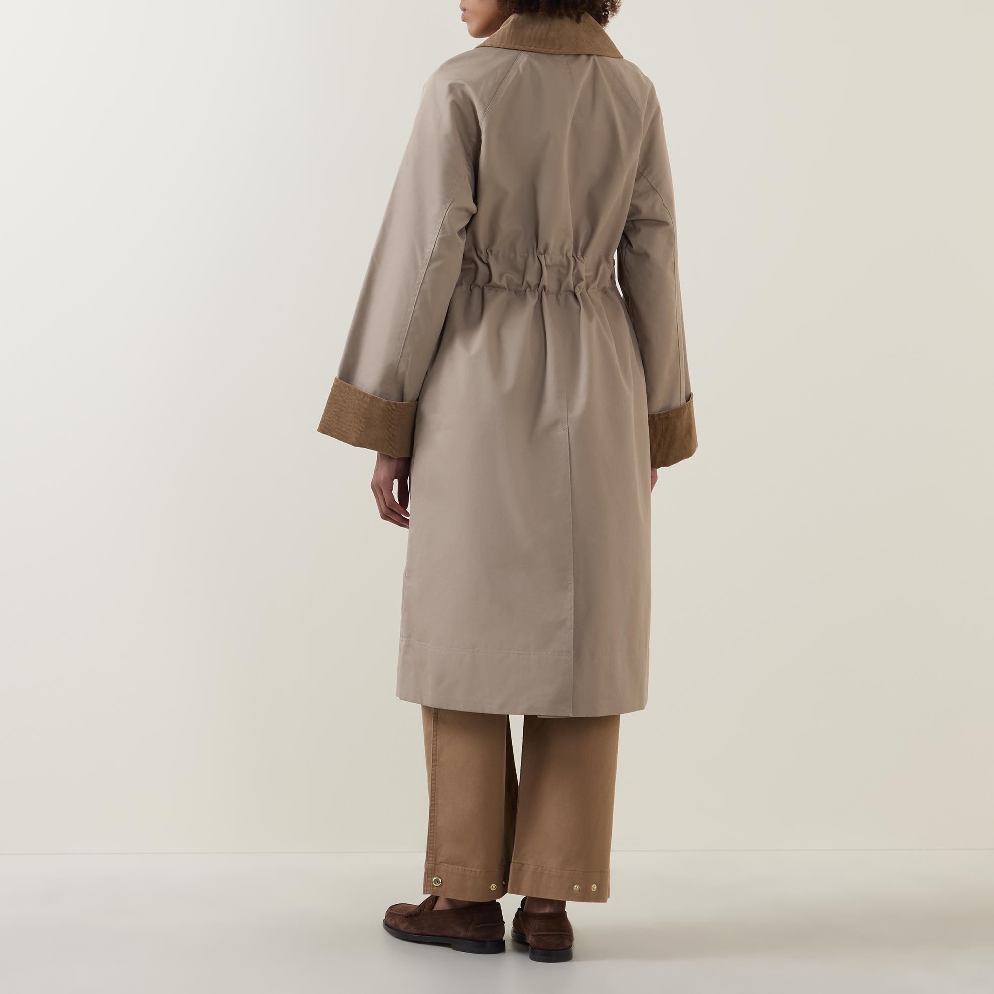 - Showerproof design, long sleeves, pointed collar, button fastenings, self-tying belt