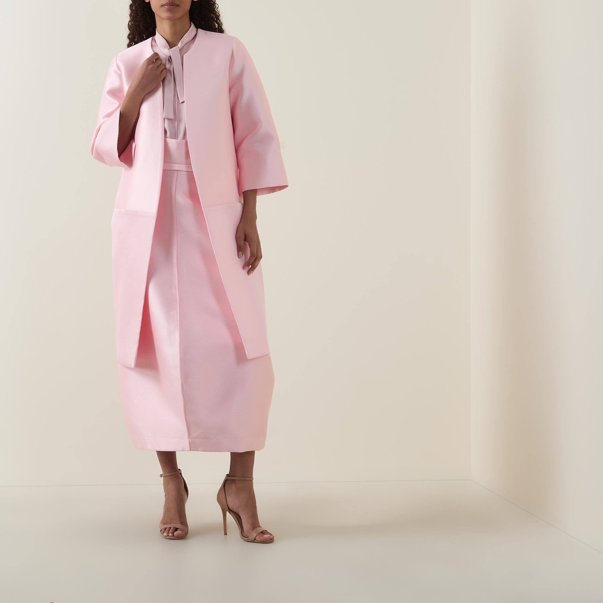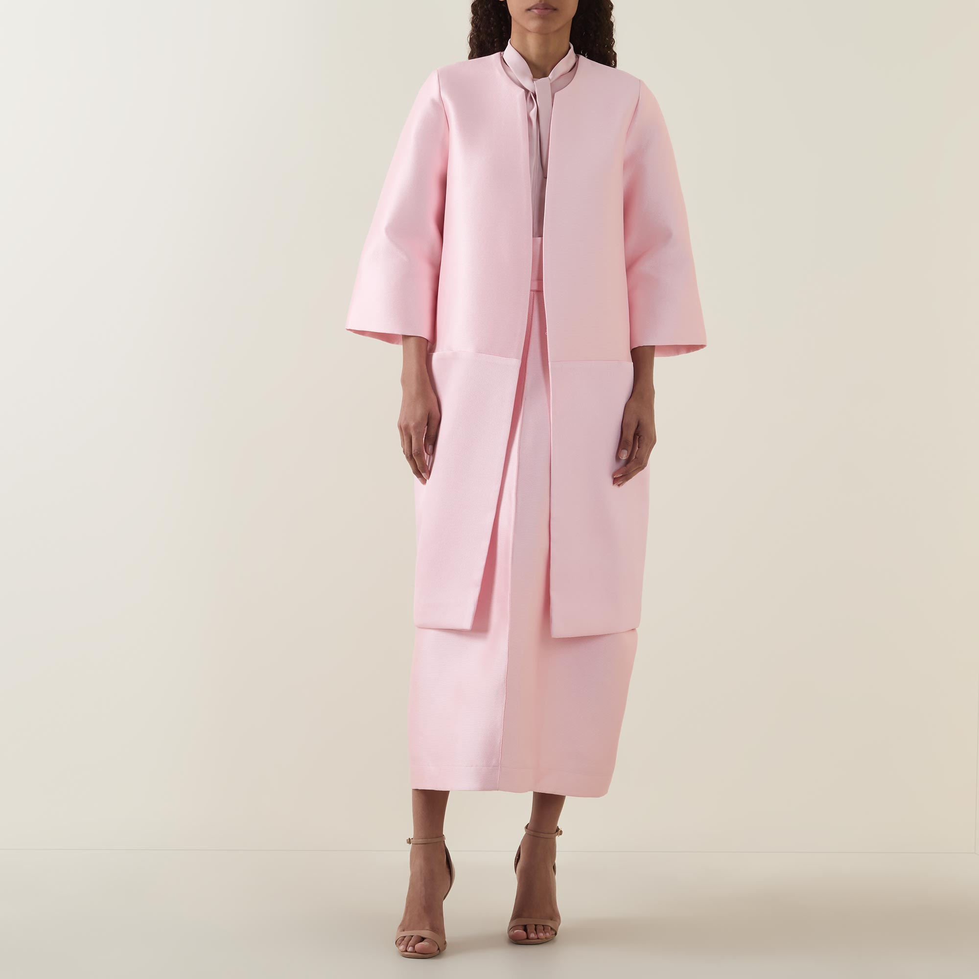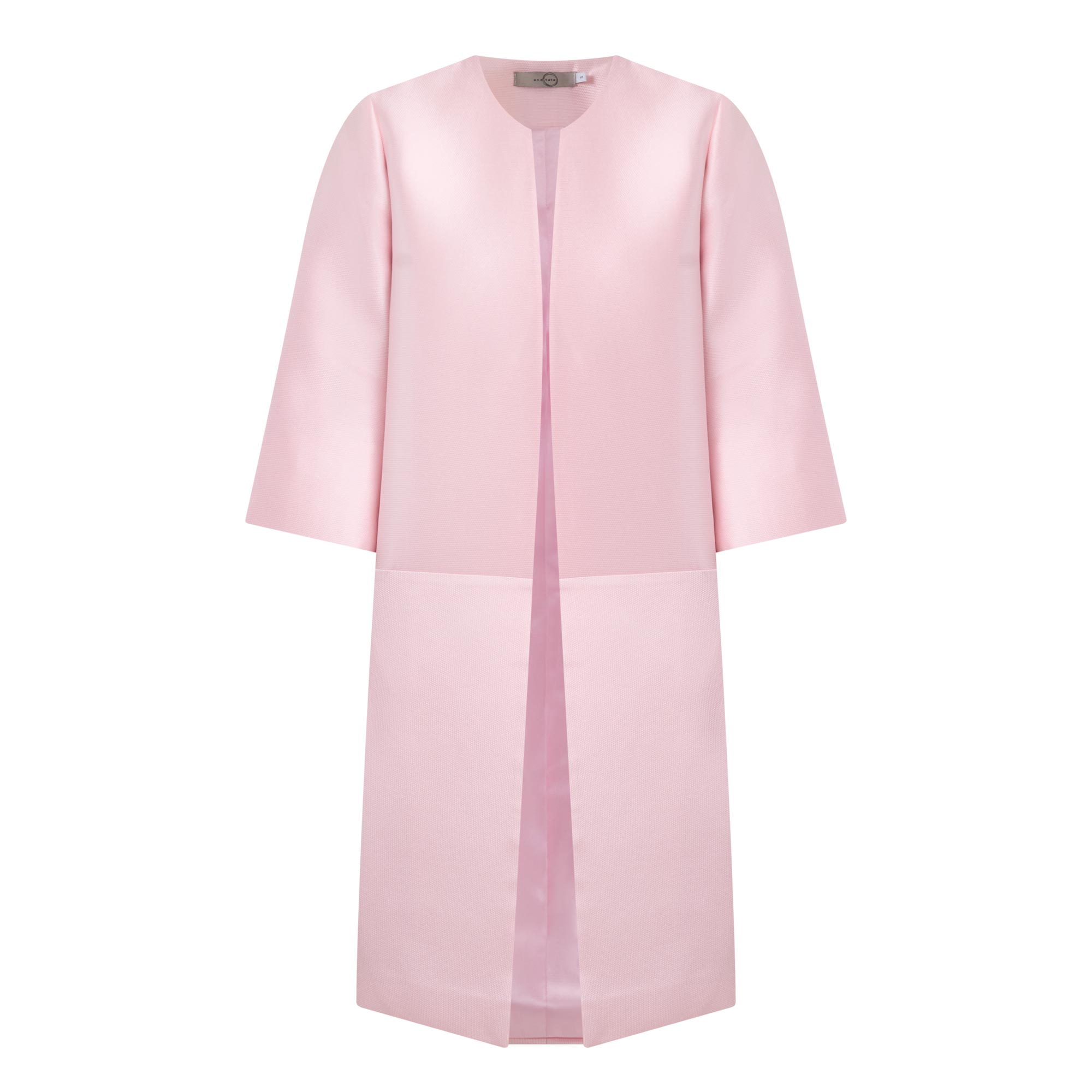 - Round neckline, three-quarter-length sleeves, long length, contrast panel to the back, open-front, side entry pockets