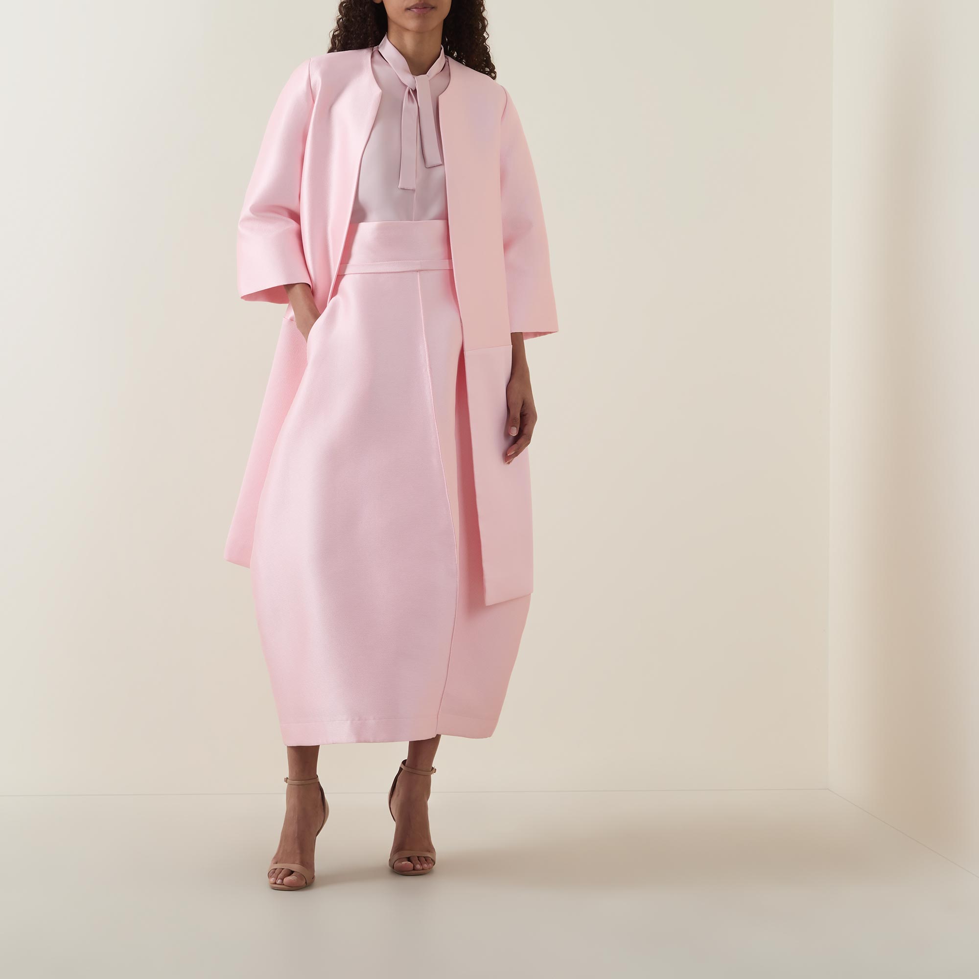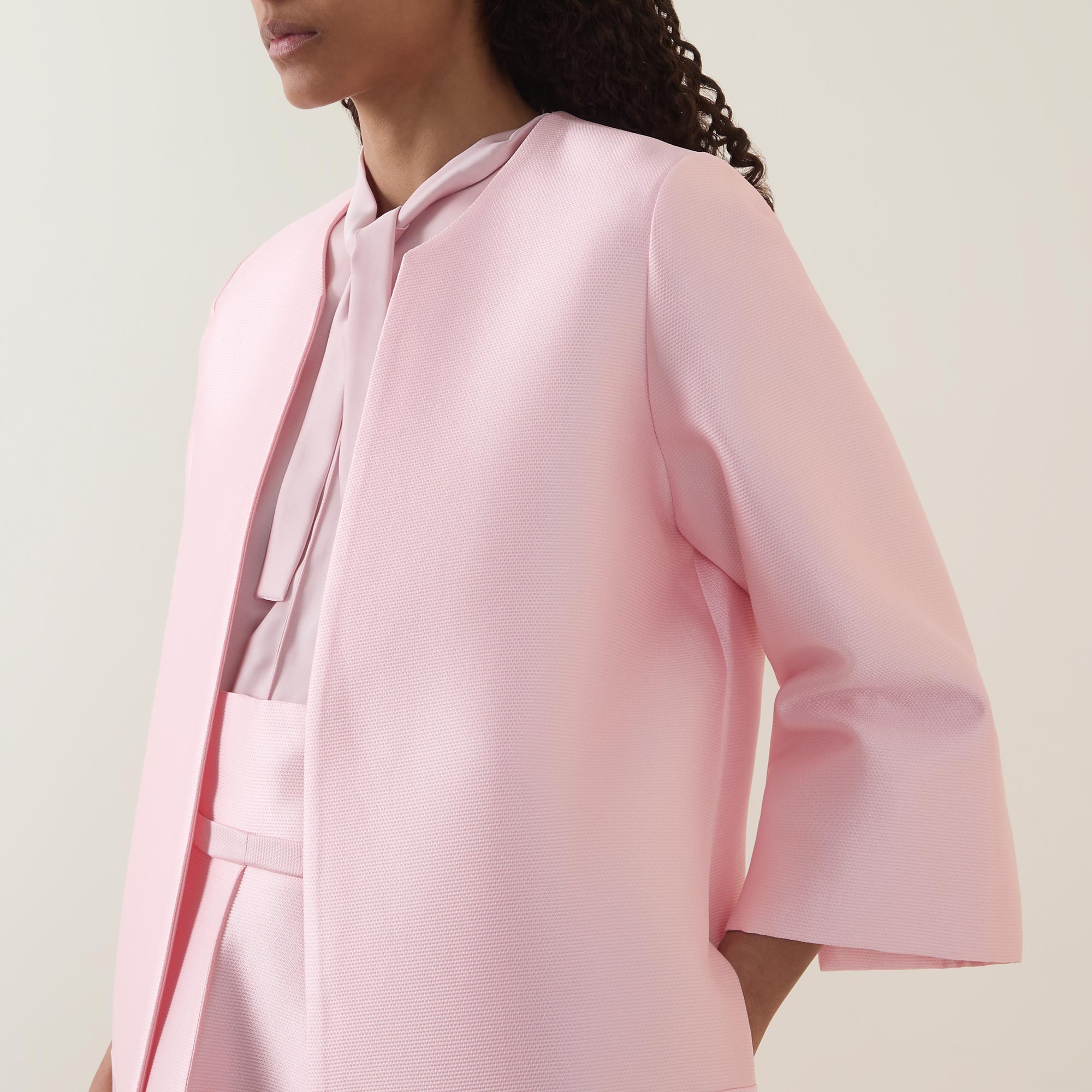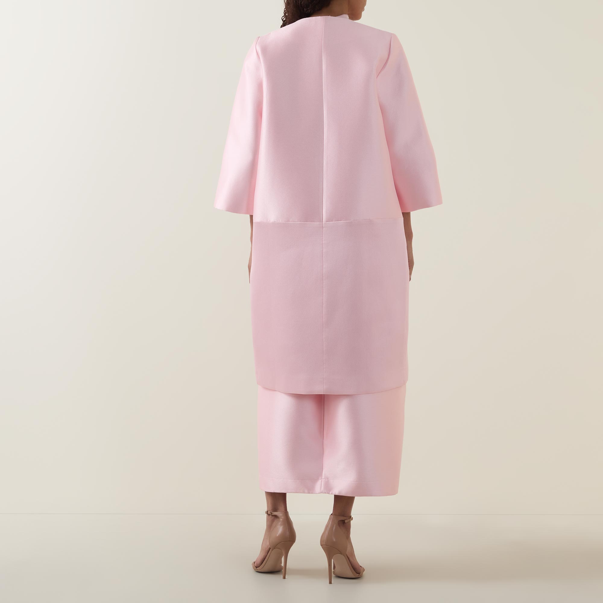 - Round neckline, three-quarter-length sleeves, long length, contrast panel to the back, open-front, side entry pockets