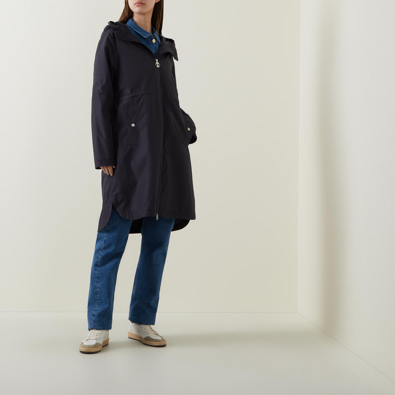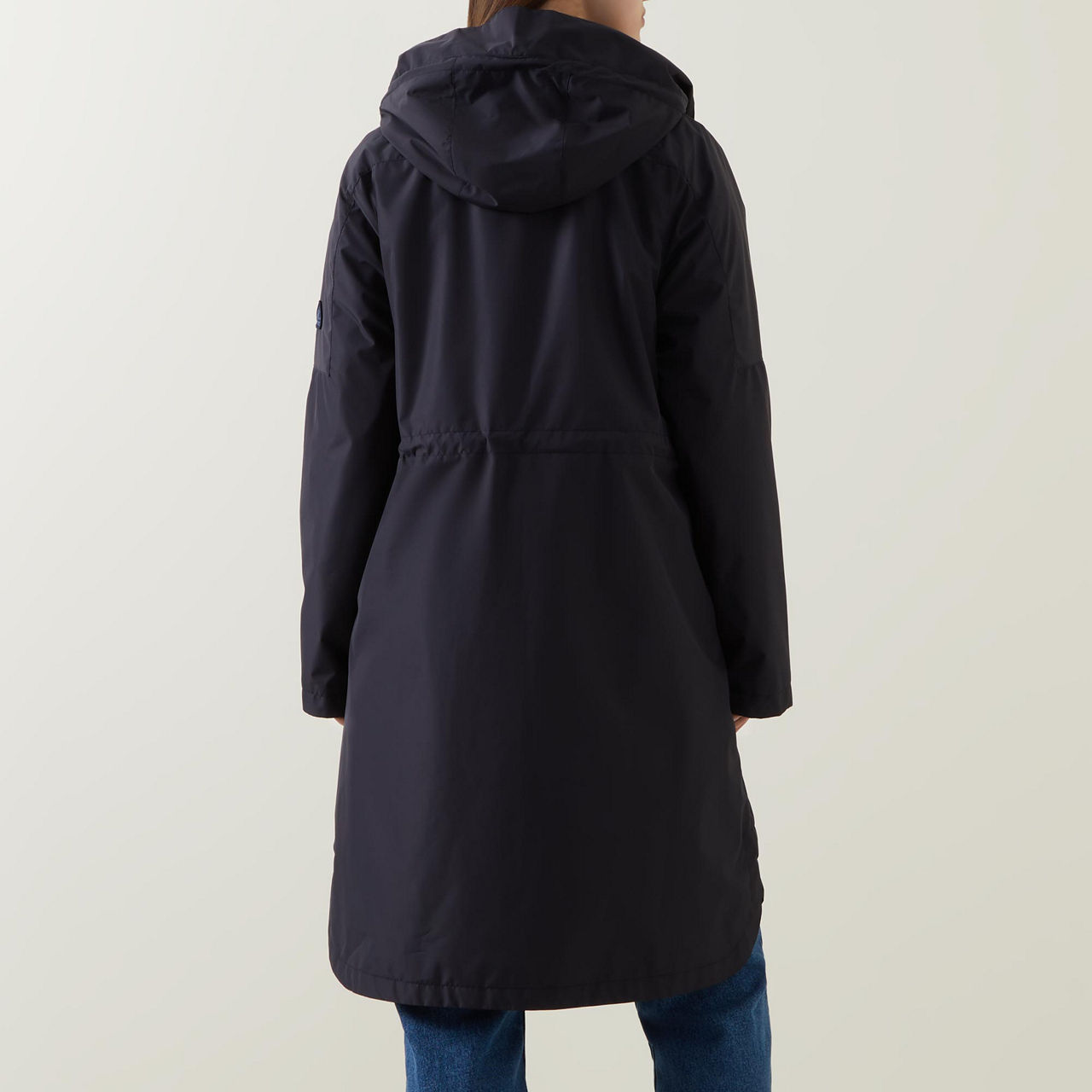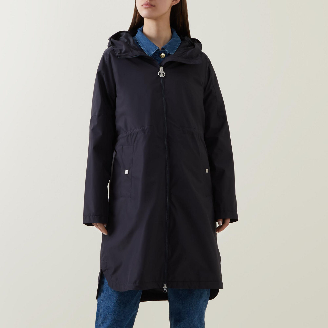 - Adjustable drawcord hood, long sleeves, zip-through fastening, inner adjustable drawcord waistline, buttoned slit pockets, tonal stitching, curved hemline, showerproof fabric