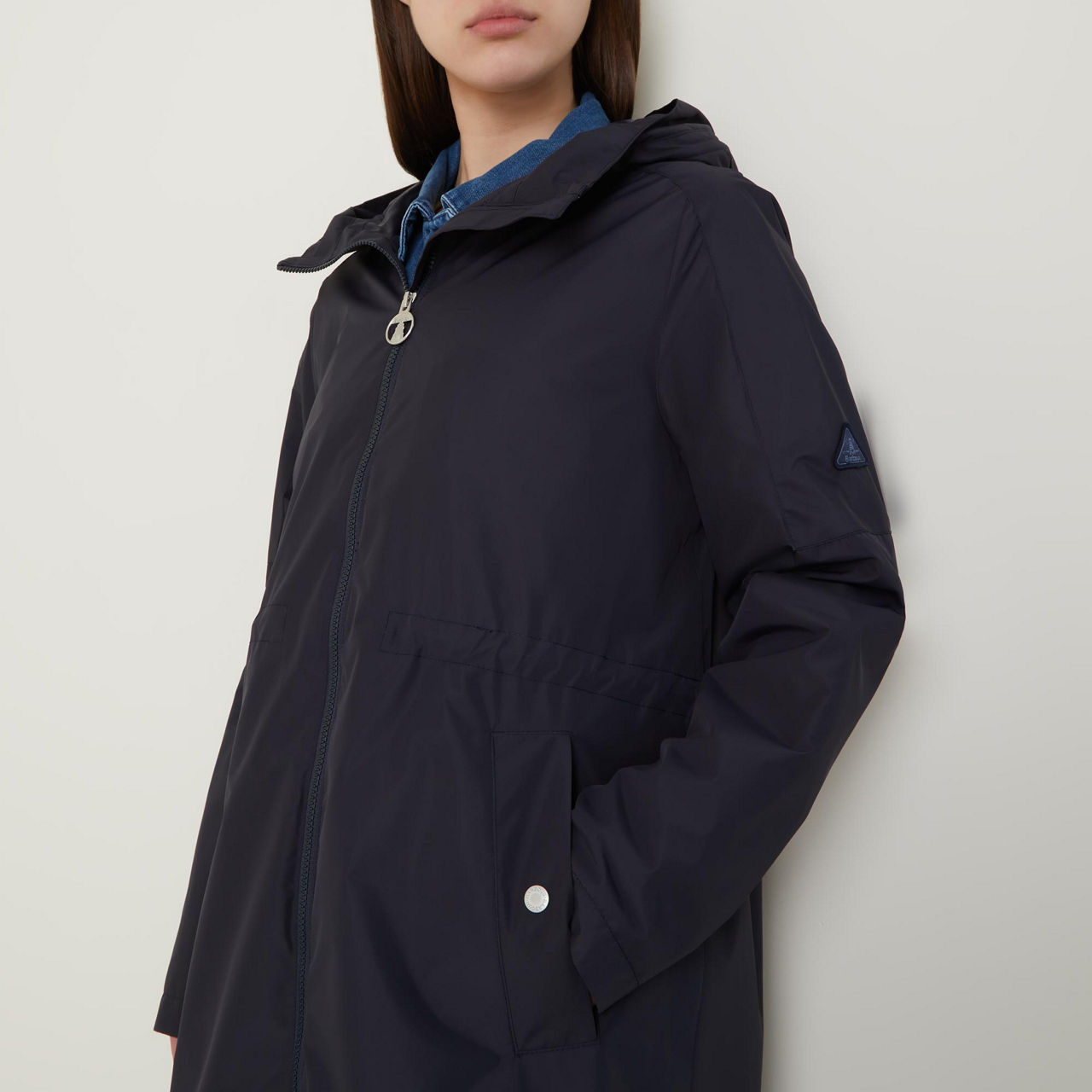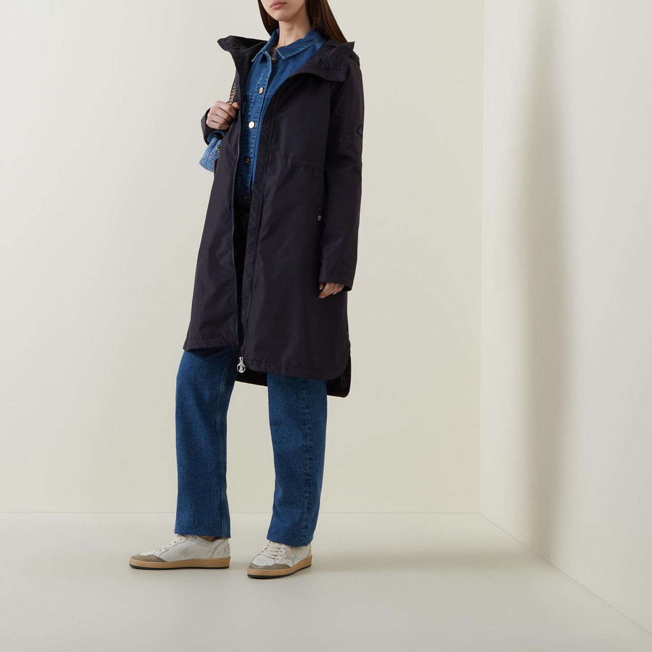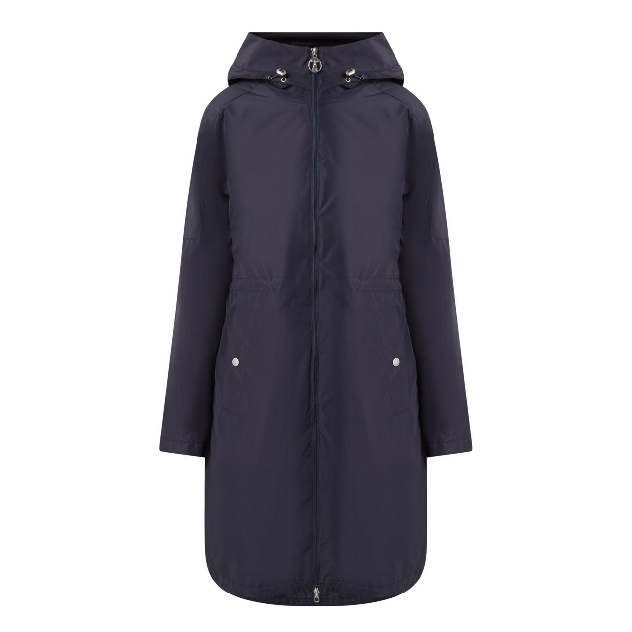 - Adjustable drawcord hood, long sleeves, zip-through fastening, inner adjustable drawcord waistline, buttoned slit pockets, tonal stitching, curved hemline, showerproof fabric