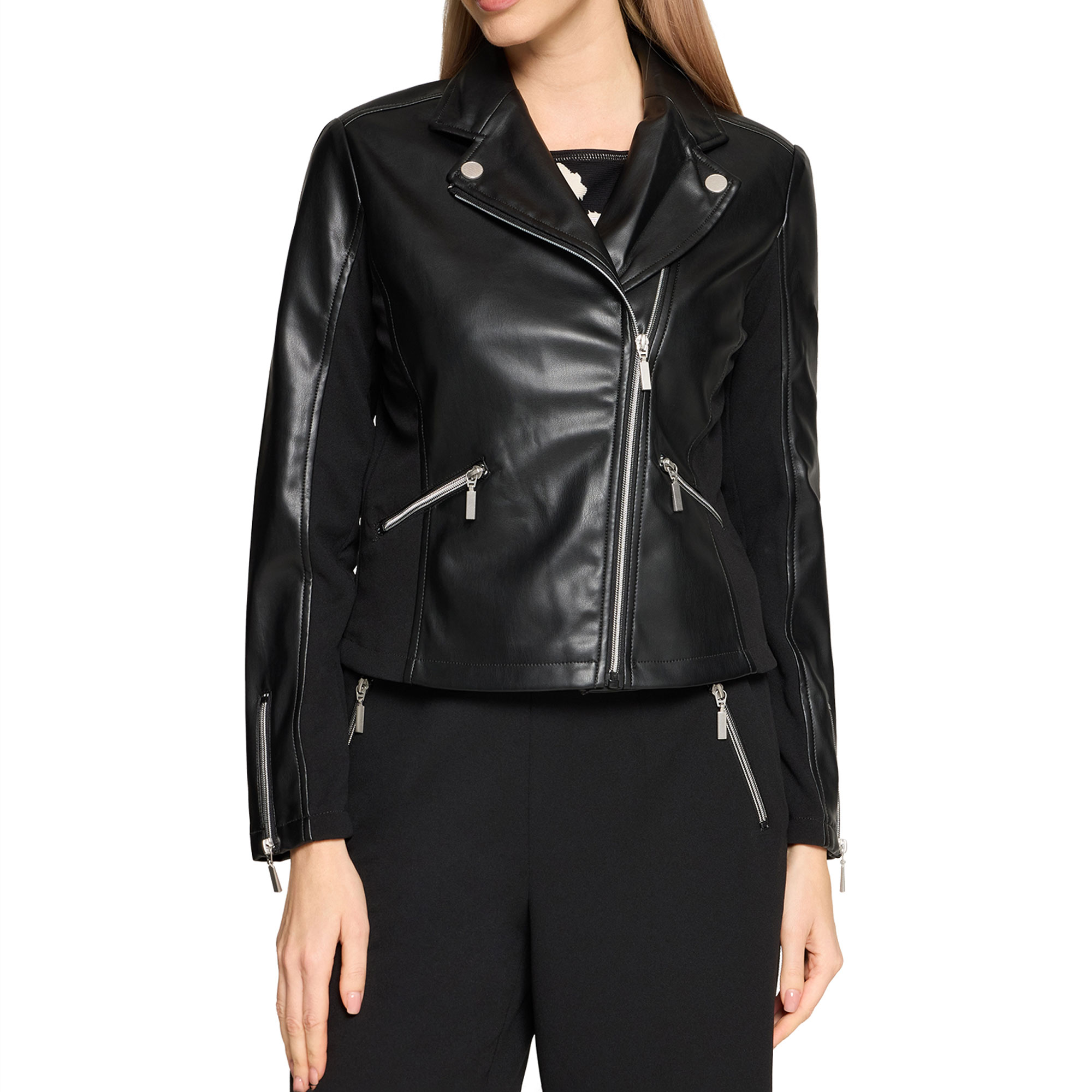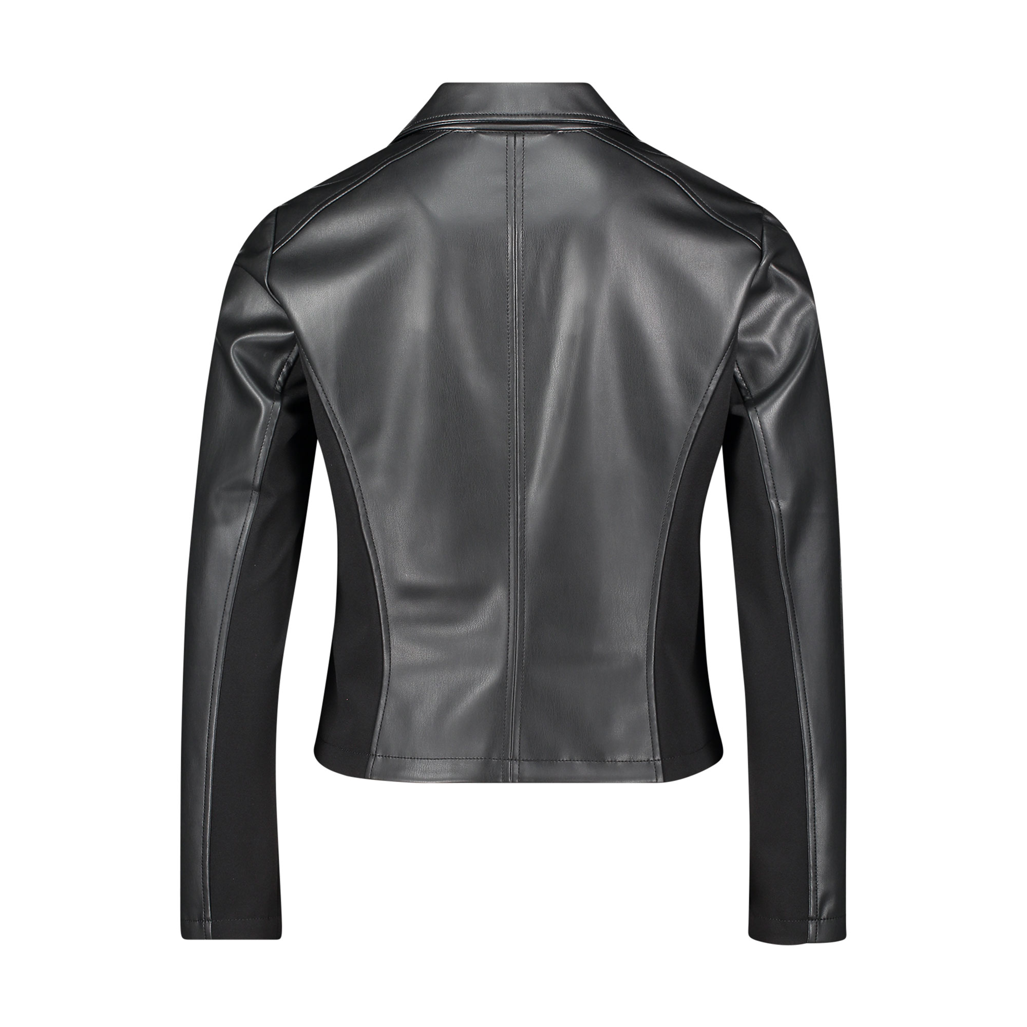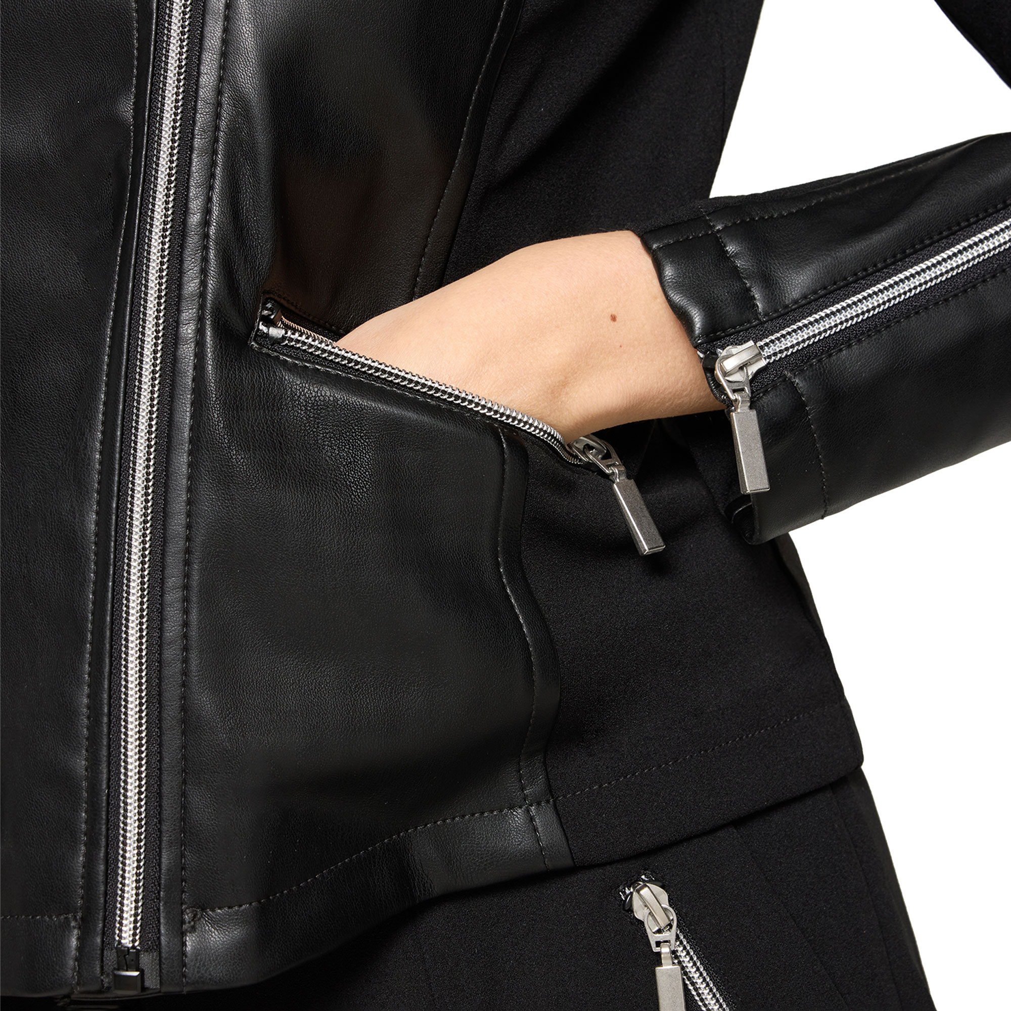 - Long sleeves, lapel collar, faux-leather, mixed material, zip fastening, zipped pockets