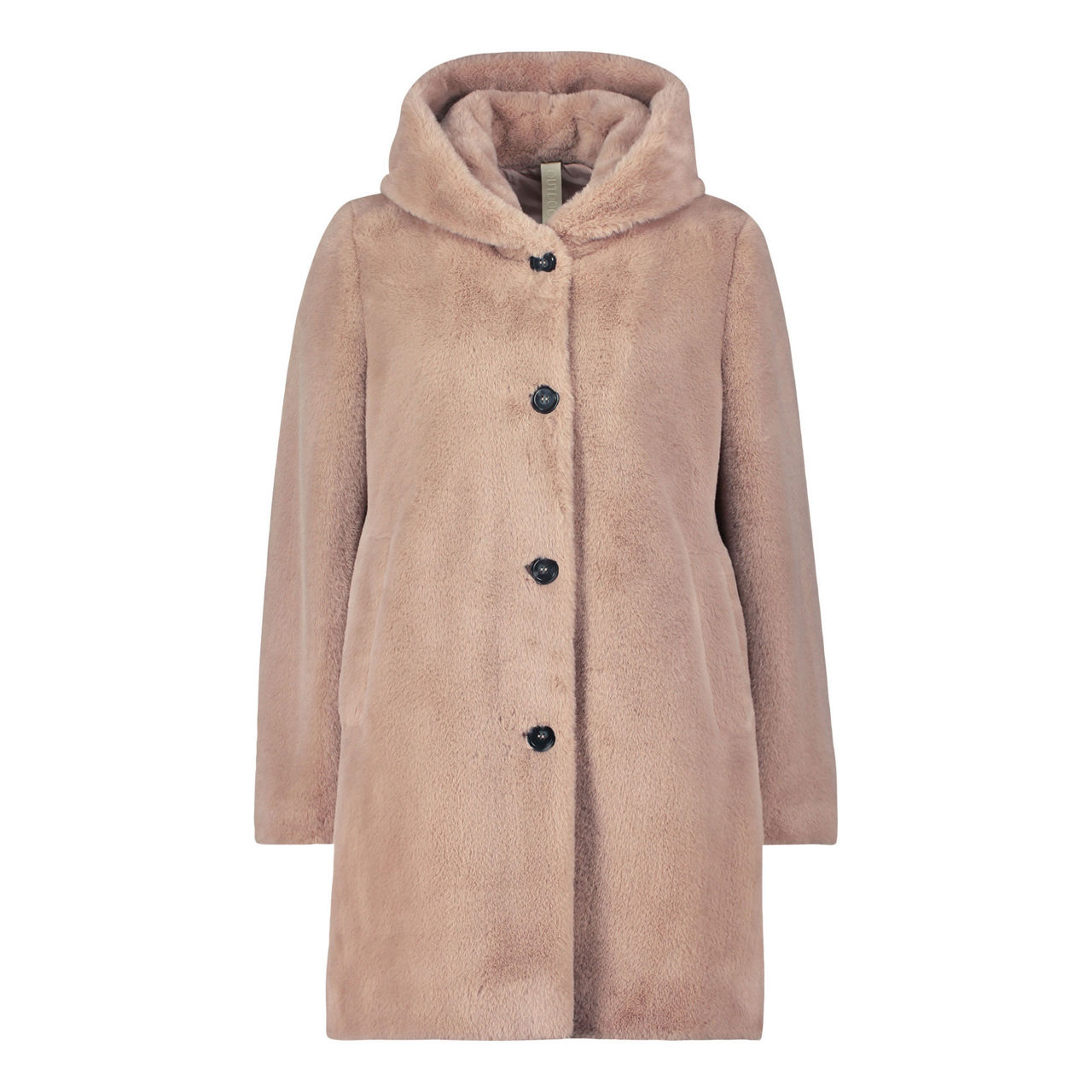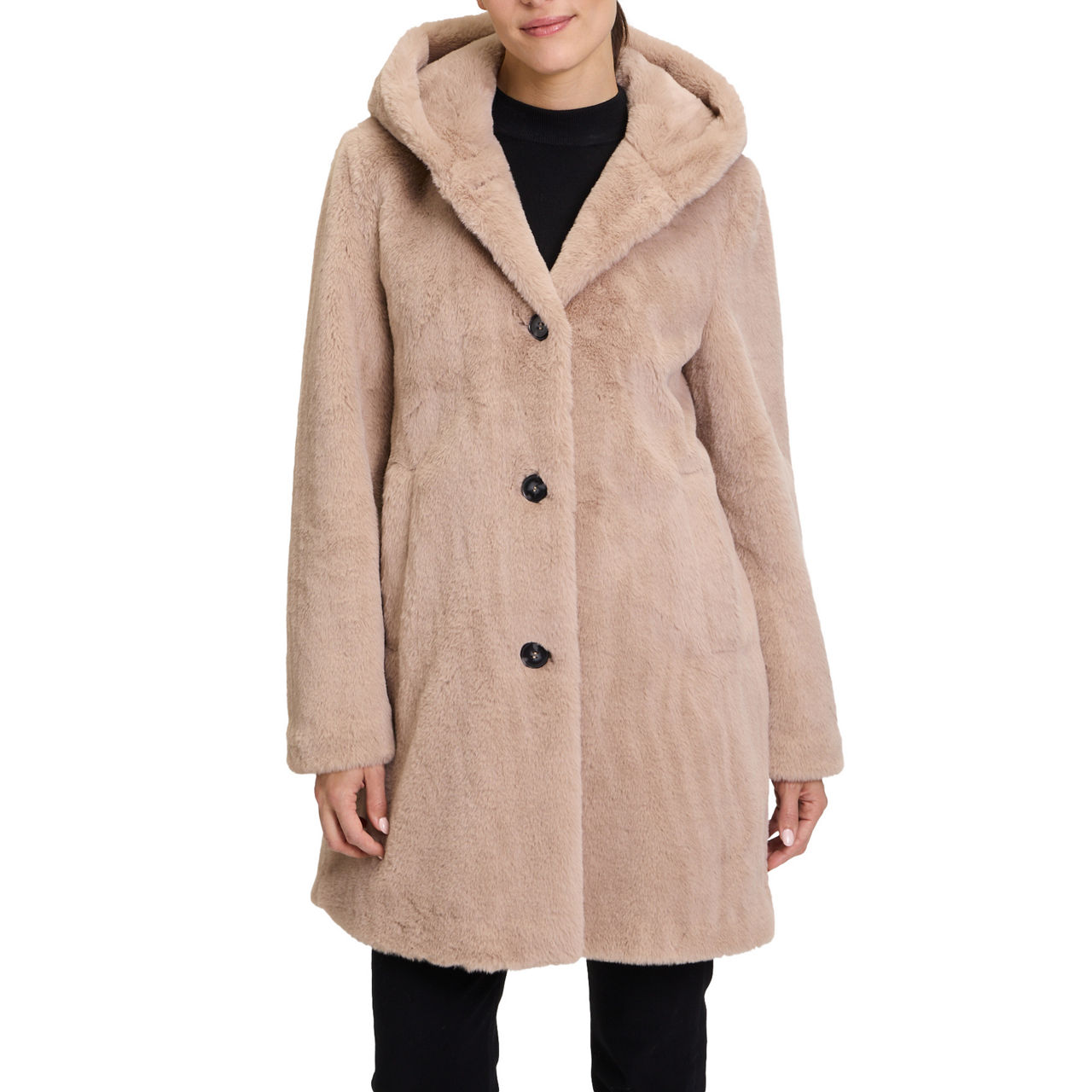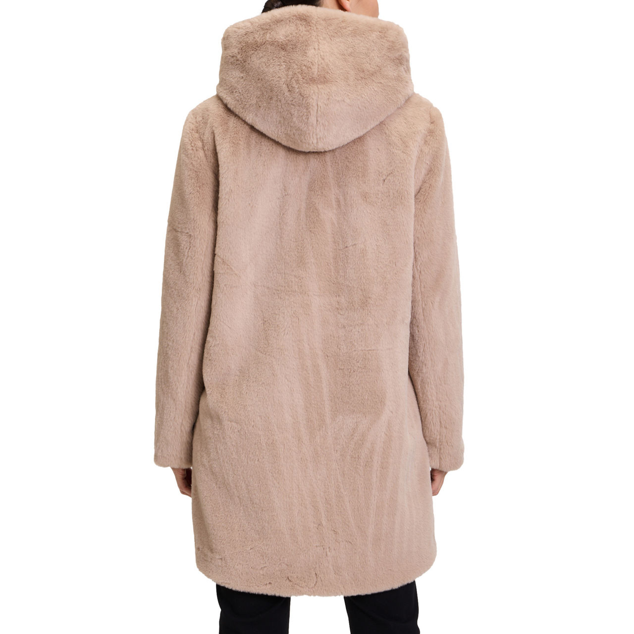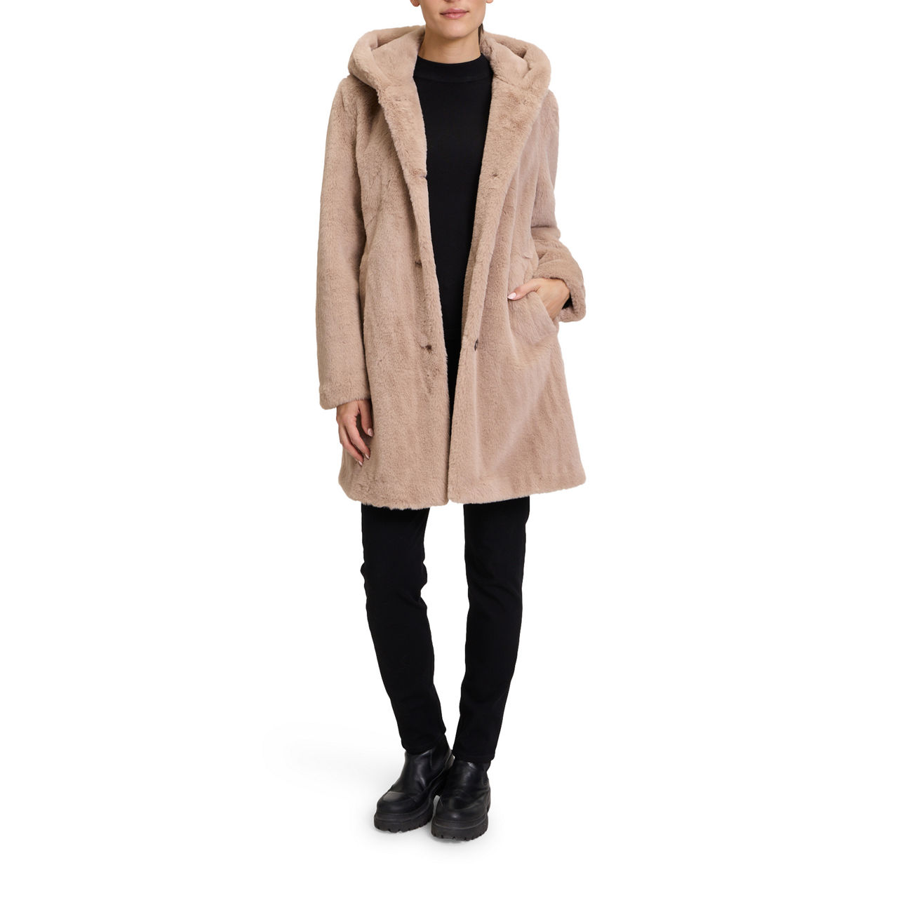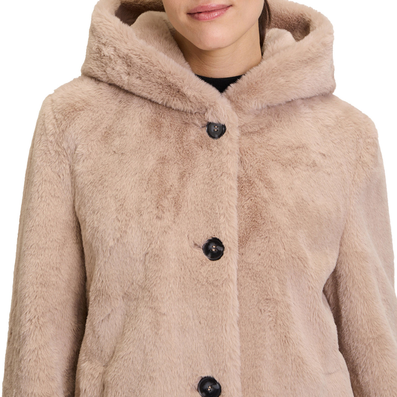 - Hood, long sleeves, front button fastening, two angled welt pockets, straight hem, faux-fur finish, lined