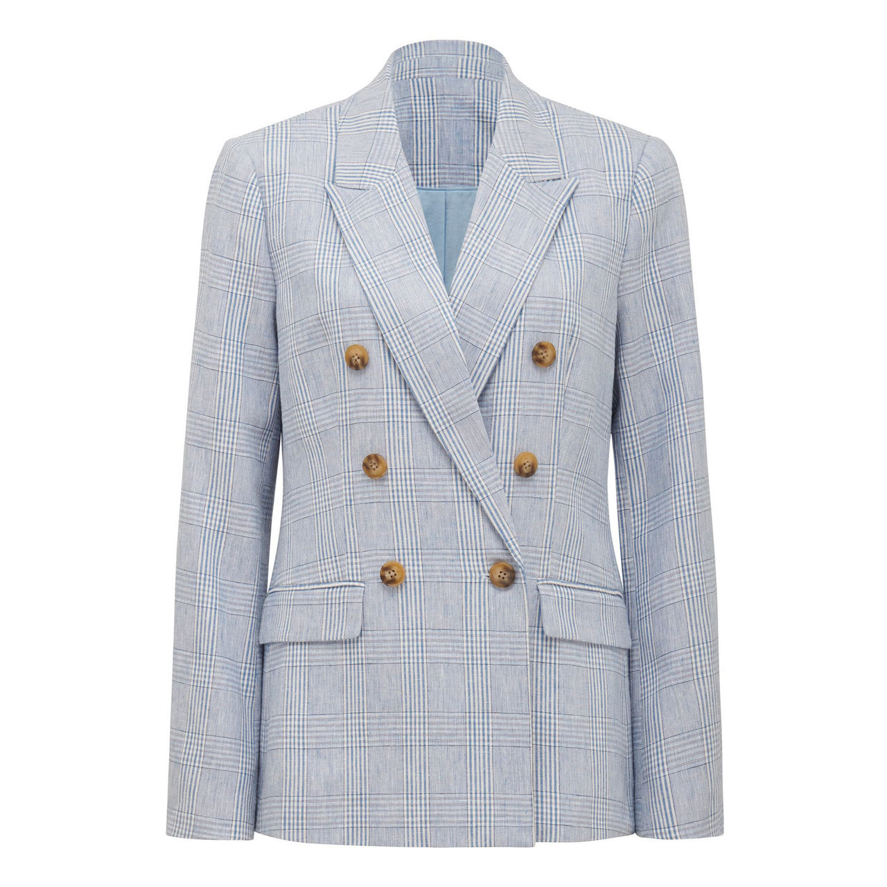 - Flap pockets, double-breasted, buttoned cuffs, single front button fastening, decorative buttons, check print, peak lapels, lined, reverse vent
