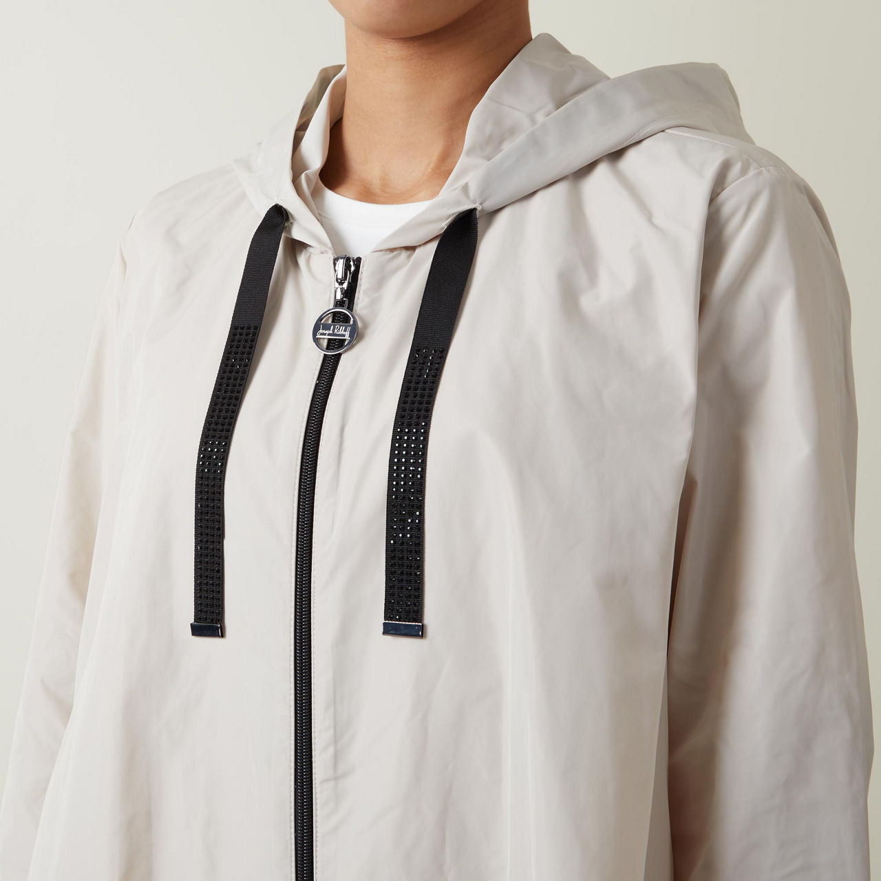 - Hooded, crystal-embellished drawstrings, long sleeves, zip-through fastening, elasticated back panel, two patch pockets, lightweight finish