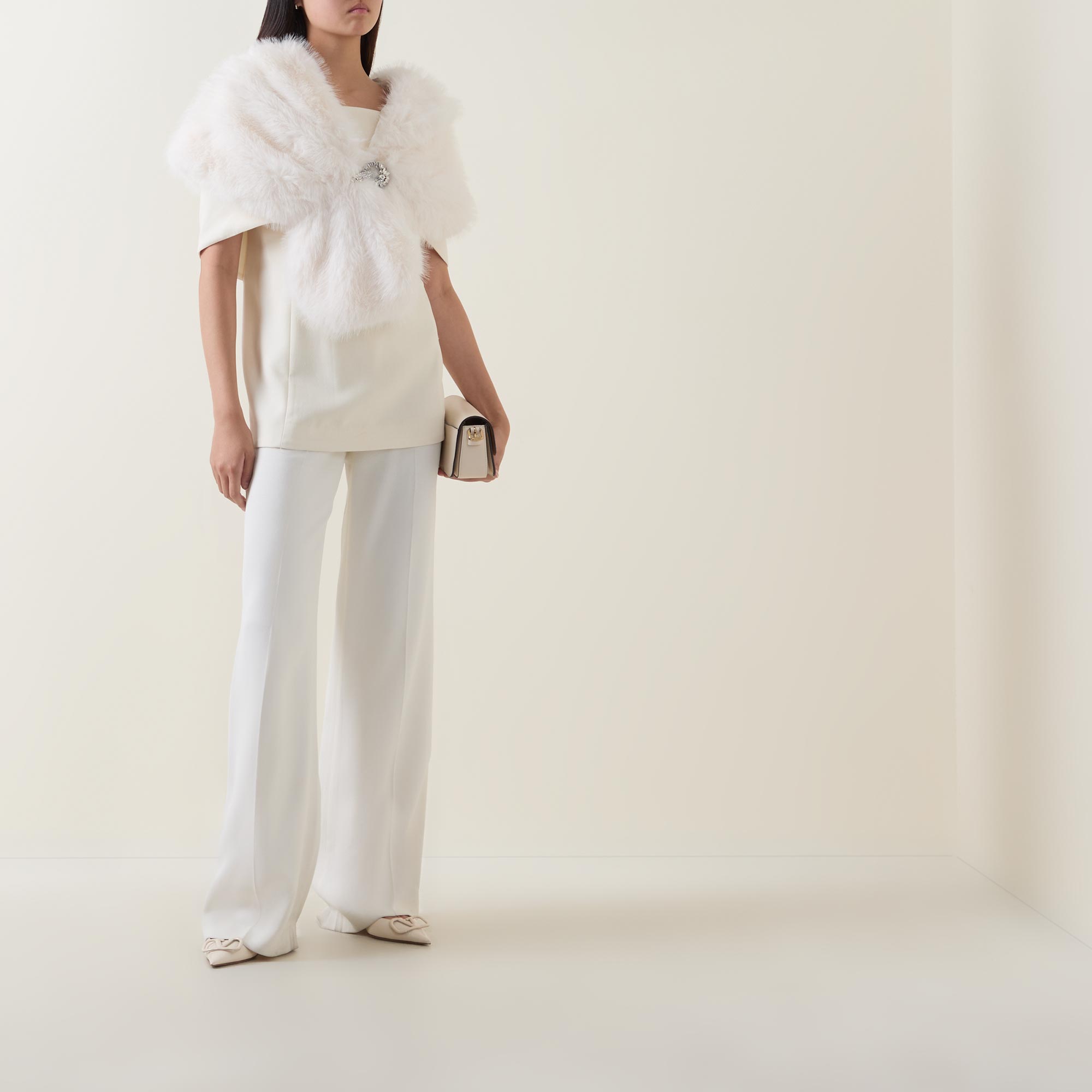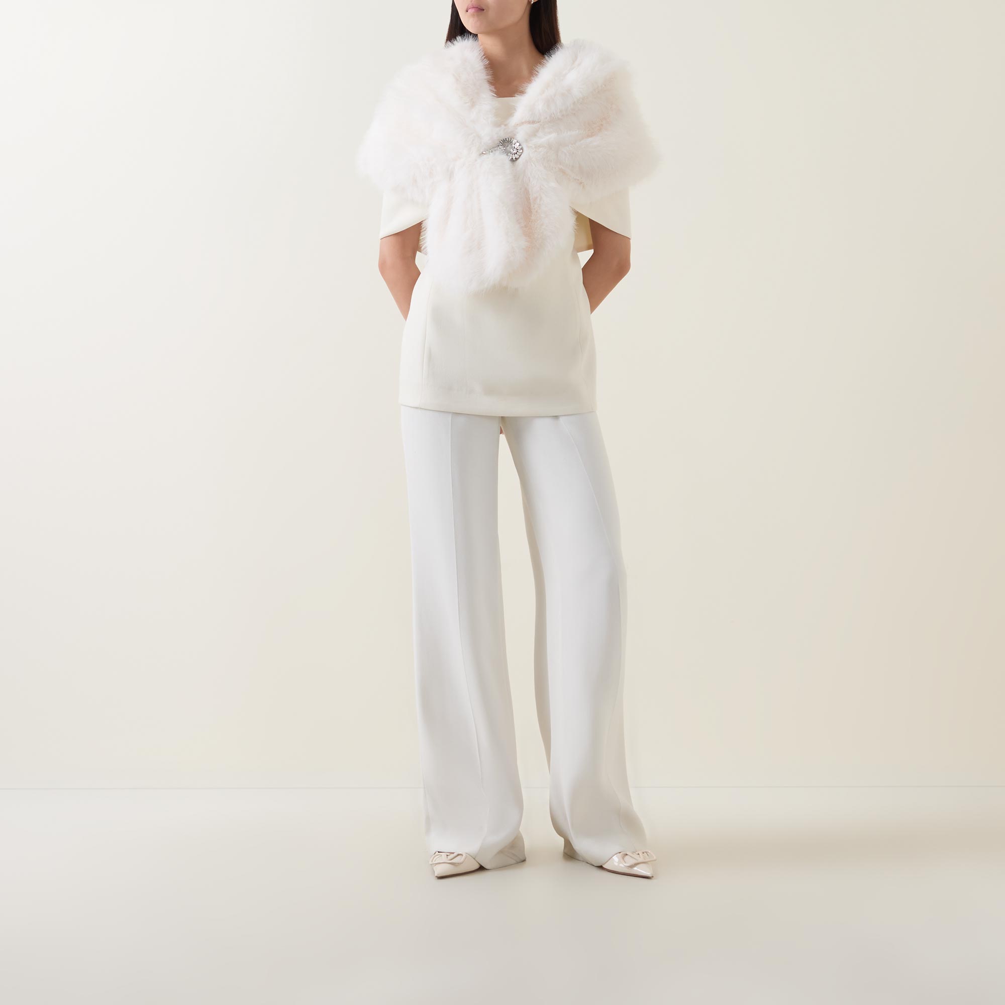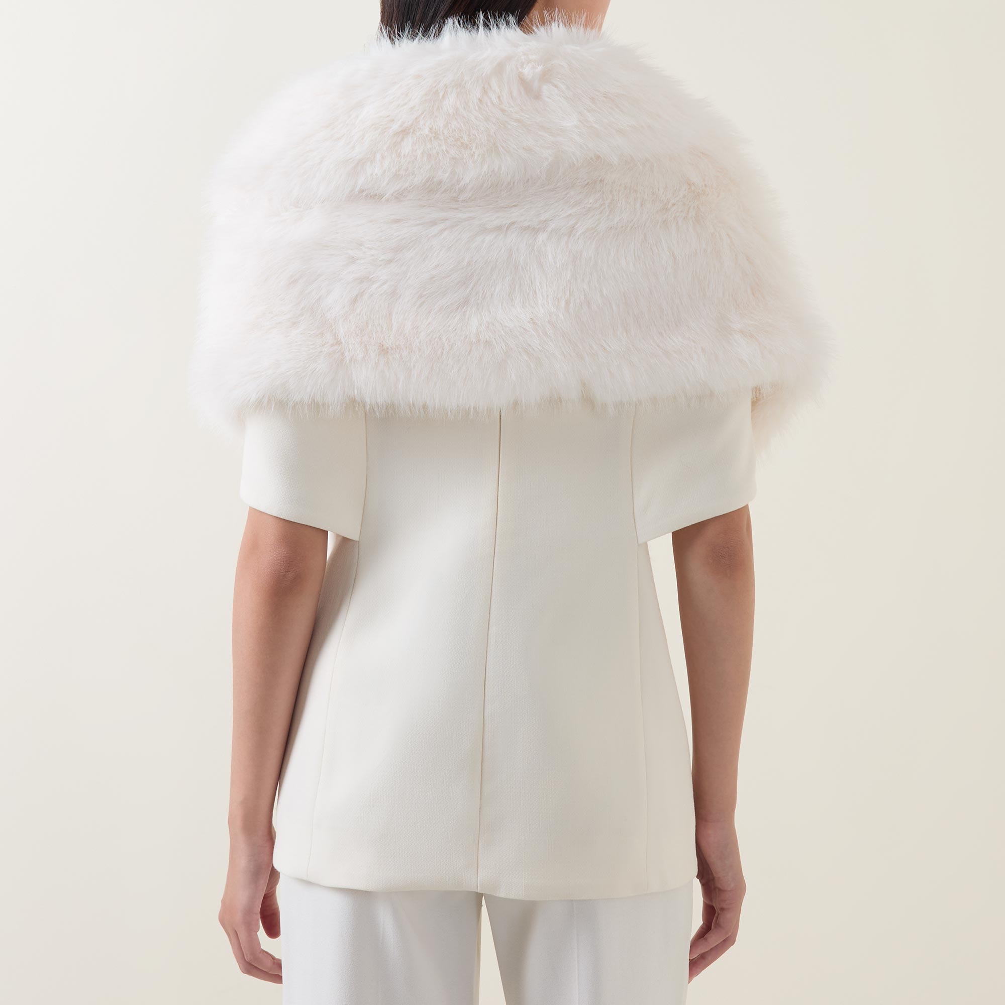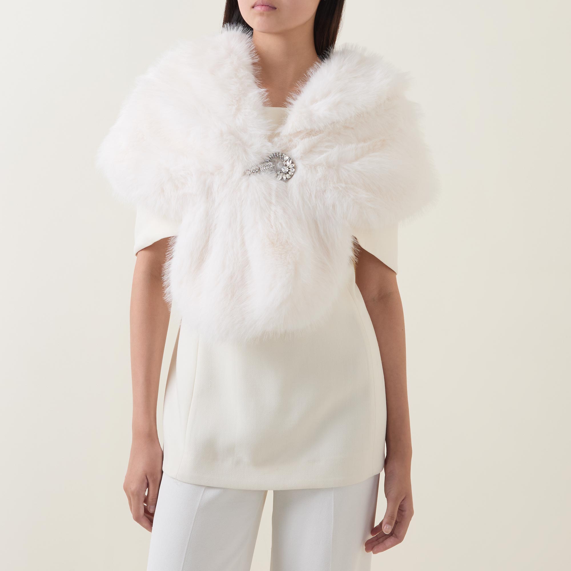 • Shawl collar, single button fastening, embellished detailing, faux fur finish