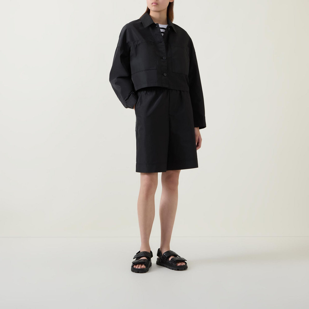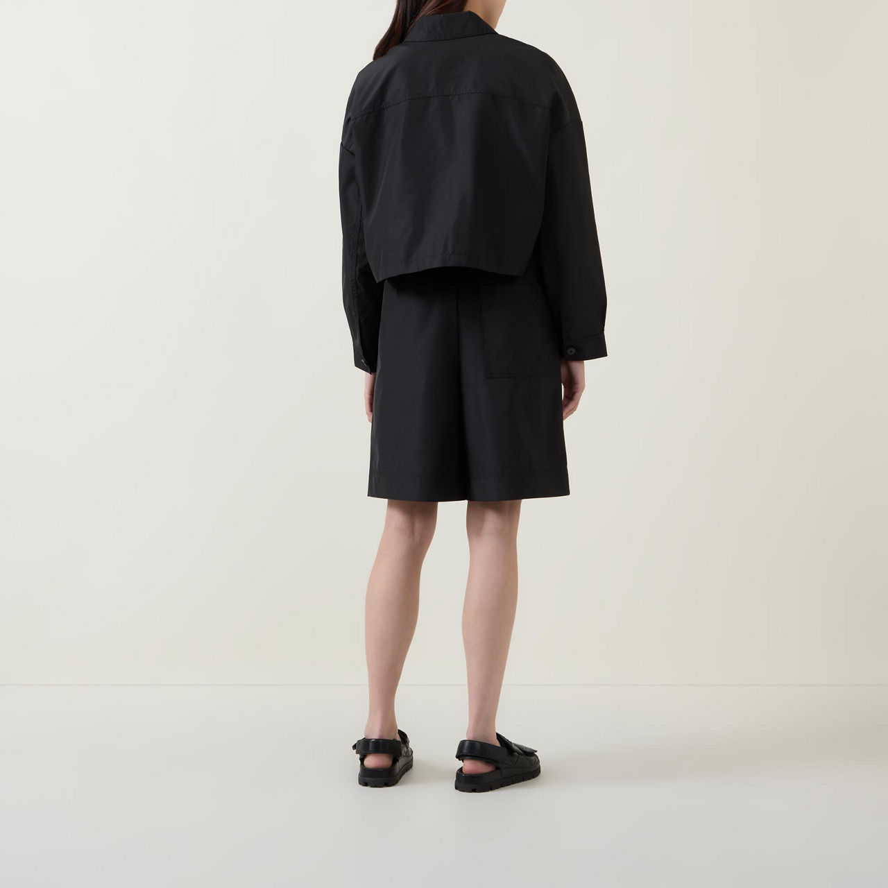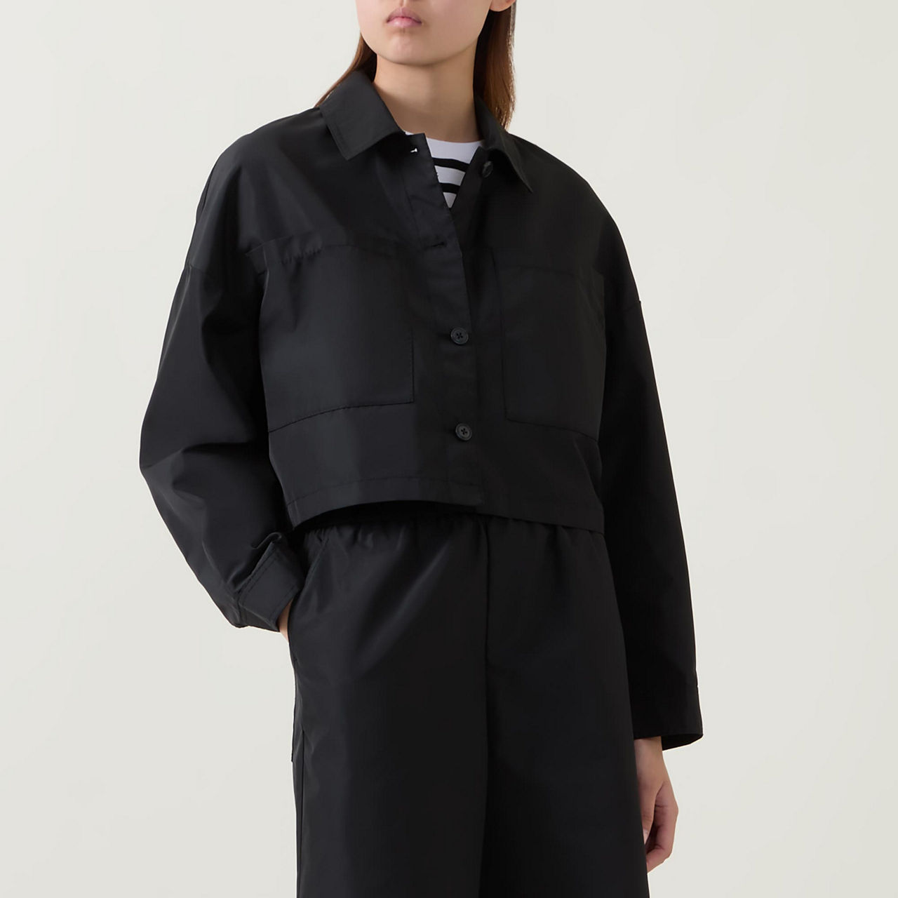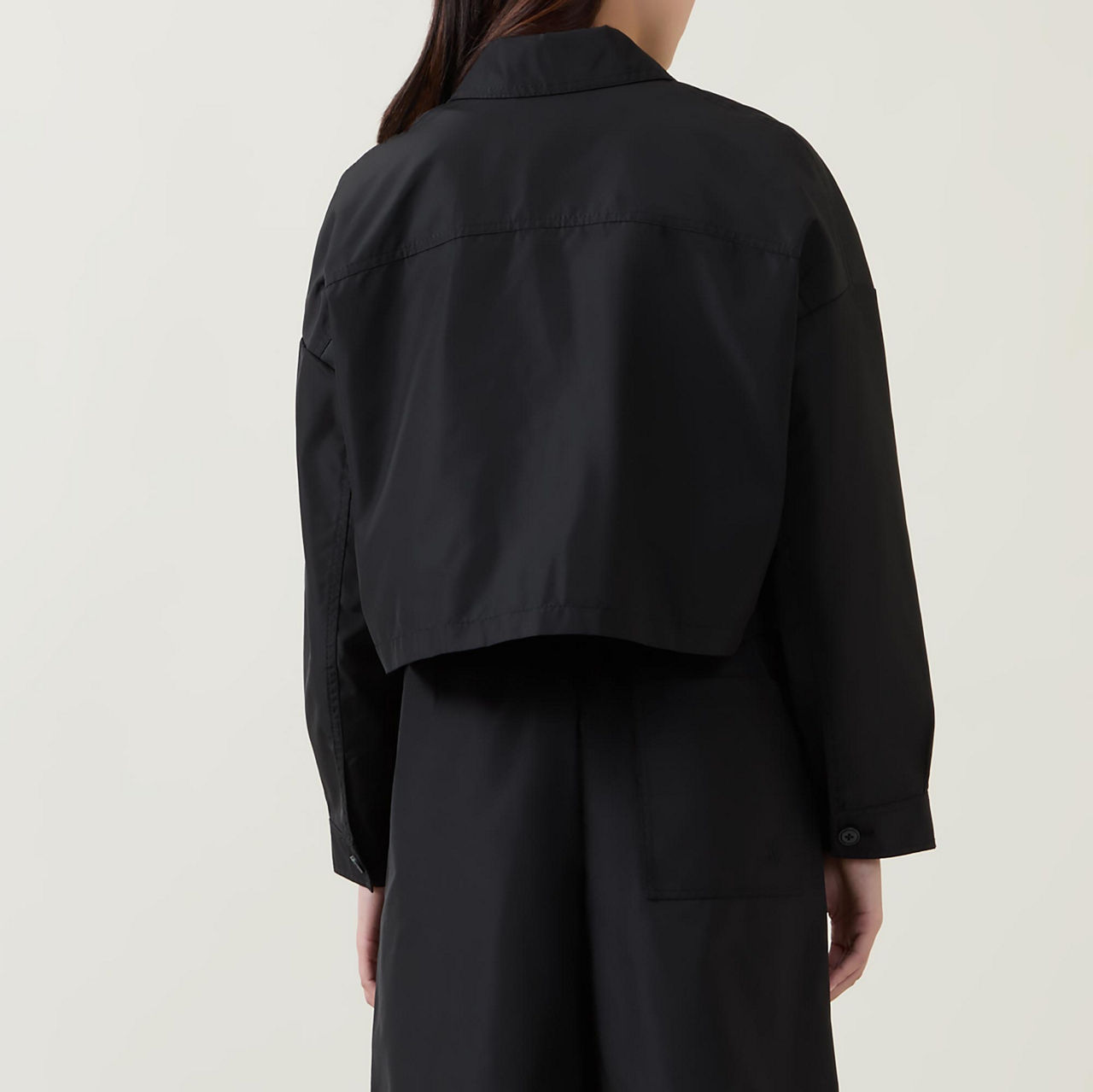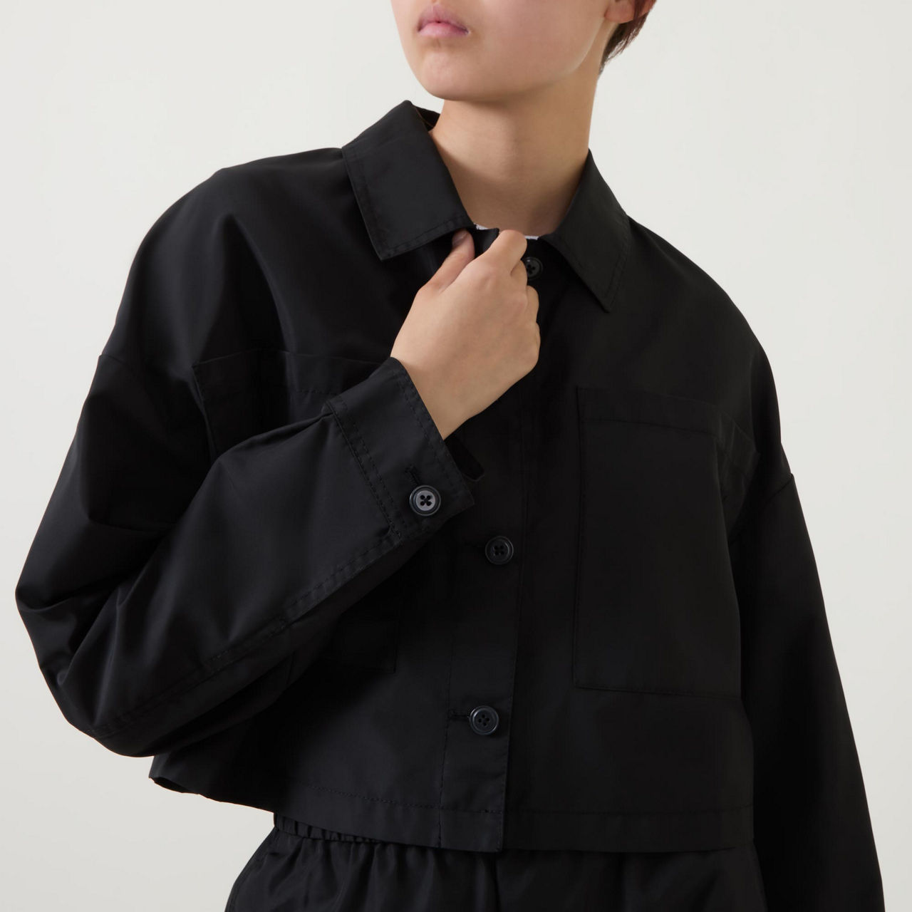 - Long sleeves, two patch pockets, cropped length, button fastenings, shirt collar
